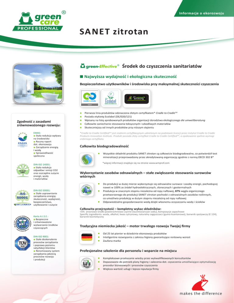 Informacje o ekorozwoju SANET zitrotan Środek do czyszczenia sanitariatów ■ Najwyższa wydajność i ekologiczna skuteczność Bezpieczeństwo użytkowników i środowiska przy maksymalnej skuteczności czyszczenia Zgodność z zasadami zrównoważonego rozwoju: EMAS: ■ Stała redukcja wpływu na środowisko ■ Roczny raport dot. ekorozwoju ■ Zarządzanie energią i wodą ■ Sprawiedliwość społeczna DIN ISO 14001: ■ Stała redukcja odpadów i emisji CO2 oraz oszczędne zużycie energii, wody i materiałów ■ ■ ■ ■ ■ Pierwsza linia produktów odznaczona złotym certyfikatem* Cradle to CradleCM Posiada etykietę Ecolabel (DE/020/121) Wpisany na listę aprobowanych produktów organizacji doradztwa ekologicznego die umweltberatung Całkowite zaniechanie stosowania toksycznych i szkodliwych materiałów Skuteczniejszy od innych produktów przy niższym stężeniu *Cradle to Cradle CertifiedCM jest znakiem certyfikacyjnym udzielanym na podstawie licencji przez instytut Cradle to Cradle Products Innovation Institute. Produkt posiada złoty certyfikat Cradle to Cradle CertifiedCM, a opakowanie spełnia wymogi srebrnego certyfikatu Całkowita biodegradowalność ■ Wszystkie składniki produktu SANET zitrotan są całkowicie biodegradowalne, co potwierdził test mineralizacji przeprowadzony przez akredytowaną organizację zgodnie z normą OECD 302 B* *więcej informacji znajduje się na stronie www.wmprof.com Wykorzystanie zasobów odnawialnych – stałe zwiększanie stosowania surowców wtórnych DIN ISO 50001: ■ Stałe usprawnianie zarządzania energią: skuteczność, wydajność, bezpieczeństwo, użytkowanie i zużycie ■ Do produkcji w dużej mierze wykorzystuje się odnawialne surowce i zasoby energii, pochodzącej nawet w 100% ze źródeł hydroelektrycznych, słonecznych i geotermalnych Produkcja w znacznym stopniu niezależna od ropy naftowej, 87% węgla organicznego przetworzonego do produkcji SANET zitrotan pochodzi z odnawialnych zasobów roślinnych, co umożliwia produkcję w dużym stopniu niezależną od ropy naftowej ■ Odpowiedzialne gospodarowanie wodą dzięki własnemu oczyszczaniu wody i ścieków ■ Całkowita przejrzystość – kompletny wykaz składników: Karta A.I.S.E.: ■ Bezpieczne i zrównoważone wytwarzanie środków czyszczących DIN ISO 9001: ■ Stałe doskonalenie procesów zarządzania i poprawa poziomu satysfakcji klientów ■ Renomowany system zarządzania jakością procesów rozwoju i produkcji <5% anionowe środki powierzchniowo czynne (lauretosiarczan sodu), kompozycje zapachowe Specific ingredients: woda, alkohol, kwas cytrynowy, naturalny zagęszczacz (guma ksantanowa), barwnik spożywczy (E 124), barwnik kosmetyczny Tradycyjna niemiecka jakość – motor trwałego rozwoju Twojej firmy ■ ■ ■ Od 25 lat pionier w dziedzinie ekorozwoju produktów Inteligentne rozwiązania z zakresu higieny gwarantujące rentowny wzrost Zaufana marka Profesjonalne szkolenie dla personelu i wsparcie na miejscu ■ ■ ■ Kompleksowe przekazanie wiedzy przez wykwalifikowanych konsultantów Dopasowane do potrzeb plany higieny i zalecenia dot. czyszczenia umożliwiające optymalizację procedur biznesowych i procesów czyszczenia Większa wartość usługi i lepsza reputacja firmy Informacje o ekorozwoju SANET zitrotan Środek do czyszczenia sanitariatów ■ Wysoka skuteczność ■ Naturalna moc cytryny ■ Niski koszt Profil produktu ■SANET zitrotan jest kwasowym środkiem do czyszczenia sanitariatów, który skutecznie wykorzystuje Stosowanie i dozowanie 2,5-25 ml/l Dozowanie zgodnie z zastosowaniem i stopniem zabrudzenia. Stosować się do poniższych instrukcji. Czyszczenie serwisowe: przetrzeć na mokro lub zwilżyć powierzchnię czystą ściereczką. naturalne kwasy znajdujące się w cytrynach. Został opracowany z poszanowaniem naturalnych cykli biologicznych i troską o ludzkie zdrowie i bezpieczeństwo personelu sprzątającego. ■SANET zitrotan pozwala na zwiększenie bezpieczeństwa pracy, zapewniając jednocześnie wysoką skuteczność czyszczenia przy niskim stężeniu i skutecznie usuwa kamień, osady z mydła, zacieki i brud. ■Gęsta konsystencja sprawia, że SANET zitrotan mocniej przylega do powierzchni i na dłużej na niej pozostaje, zapewniając wyjątkowy efekt czyszczenia, powierzchnie wolne od zacieków i smug oraz przyjemny, świeży cytrynowy zapach. ■Składający się w większości z odnawialnych surowców SANET zitrotan jest produktem, który powstał z poczucia odpowiedzialności za przyszłe pokolenia. Miejsce aplikacji ■ SANET zitrotan jest przeznaczony do wszelkiego rodzaju powierzchni kwasoodpornych w pomieszczeniach higieniczno-sanitarnych. ■ Nie stosować do marmuru i innych materiałów wrażliwych na działanie kwasów. Ręczne mycie podłogi: umyć podłogę czystym mopem. nierozcieńczony Bezpieczeństwo produktu, przechowywanie i zalecenia dot. ochrony środowiska Odkamienianie, uporczywe zabrudzenia, czyszczenie toalet: Stosować bez rozcieńczania. Pozostawić płyn na kilka minut. Obficie spłukać czystą wodą. Bezpieczeństwo: Wyłącznie do profesjonalnego użytku. Przechowywać w miejscu niedostępnym dla dzieci. Nie mieszać z innymi produktami. Przed użyciem sprawdzić kompatybilność materiałową. Więcej informacji znajduje się w Karcie Bezpieczeństwa Produktu. Przechowywanie: Przechowywać w temperaturze pokojowej w oryginalnym pojemniku. Ochrona środowiska: Wyrzucać tylko całkowicie opróżnione opakowania do właściwego pojemnika na odpady. Właściwe dozowanie zmniejsza koszty i obciążenie środowiska. Zaufany partner: Dostępne opakowania: Kod produktu 712473 10 x 1 L Kod produktu 712474 2 x 5 L Wartość pH: 2 tana-Chemie GmbH | Rheinallee 96 | D 55120 Mainz | Germany | www.wmprof.com | + 49 (0)6131 964 03 Werner & Mertz Professional Vertriebs GmbH | Neualmerstrasse 13 | 5400 Hallein | Austria | www.wmprof.com | +43 6245 872 86 Werner & Mertz Polska