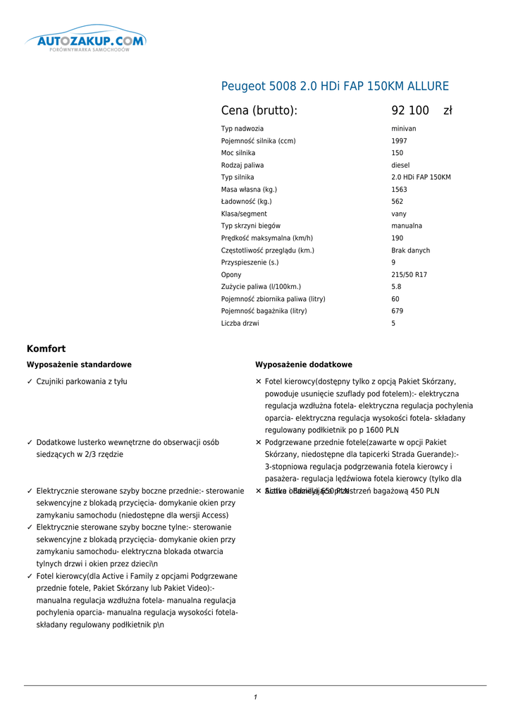 Peugeot 5008 2.0 HDi FAP 150KM ALLURE Cena (brutto): 92 100 zł Typ nadwozia minivan Pojemność silnika (ccm) 1997 Moc silnika 150 Rodzaj paliwa diesel Typ silnika 2.0 HDi FAP 150KM Masa własna (kg.) 1563 Ładowność (kg.) 562 Klasa/segment vany Typ skrzyni biegów manualna Prędkość maksymalna (km/h) 190 Częstotliwość przeglądu (km.) Brak danych Przyspieszenie (s.) 9 Opony 215/50 R17 Zużycie paliwa (l/100km.) 5.8 Pojemność zbiornika paliwa (litry) 60 Pojemność bagażnika (litry) 679 Liczba drzwi 5 Komfort Wyposażenie standardowe Wyposażenie dodatkowe ✓ Czujniki parkowania z tyłu ✕ Fotel kierowcy(dostępny tylko z opcją Pakiet Skórzany, powoduje usunięcie szuflady pod fotelem):- elektryczna regulacja wzdłużna fotela- elektryczna regulacja pochylenia oparcia- elektryczna regulacja wysokości fotela- składany regulowany podłkietnik po p 1600 PLN ✓ Dodatkowe lusterko wewnętrzne do obserwacji osób ✕ Podgrzewane przednie fotele(zawarte w opcji Pakiet siedzących w 2/3 rzędzie Skórzany, niedostępne dla tapicerki Strada Guerande):3-stopniowa regulacja podgrzewania fotela kierowcy i pasażera- regulacja lędźwiowa fotela kierowcy (tylko dla ✓ Elektrycznie sterowane szyby boczne przednie:- sterowanie ✕ Siatka Active oddzielająca i Family) 650 przestrzeń PLN bagażową 450 PLN sekwencyjne z blokadą przycięcia- domykanie okien przy zamykaniu samochodu (niedostępne dla wersji Access) ✓ Elektrycznie sterowane szyby boczne tylne:- sterowanie sekwencyjne z blokadą przycięcia- domykanie okien przy zamykaniu samochodu- elektryczna blokada otwarcia tylnych drzwi i okien przez dzieci\n ✓ Fotel kierowcy(dla Active i Family z opcjami Podgrzewane przednie fotele, Pakiet Skórzany lub Pakiet Video):manualna regulacja wzdłużna fotela- manualna regulacja pochylenia oparcia- manualna regulacja wysokości fotelaskładany regulowany podłkietnik p\n 1 ✓ Fotel pasażera:- manualna regulacja wzdłużna fotelamanualna regulacja pochylenia oparcia- manualna regulacja wysokości fotela- składany regulowany podłkietnik po lewej stronie fotela- składany stolik w oparciu fotela- kieszeń na mapę w oparciu fotela- o\n ✓ Fotele w drugim rzędzie:- trzy niezależne fotele (po złożeniu tworzą płaską podłogę z poziomem bagażnika)- manualna regulacja wzdłużna foteli- manualna regulacja pochylenia oparć- zagłówki (x3) z regulacją wysokości\n ✓ Komputer pokładowy\n ✓ Nawiewy + regulatory mocy przepływu powietrza dla drugiego rzędu siedzeń w słupkach bocznych\n ✓ Osłony przeciwsłoneczne z podświetlanymi lusterkami dla kierowcy i pasażera\n ✓ Wspomaganie kierownicy progresywne\n ✓ Zagłówki przednich foteli z regulacją w dwóch płaszczyznach\n Bezpieczeństwo Wyposażenie standardowe Wyposażenie dodatkowe ✓ ABS ze wspomaganiem hamowania awaryjnego (AFU) ✕ Alarm:- Superzamek centralny- 2 piloty zdalnego sterowania (tylko dla Access) 1500 PLN ✓ ASR - system kontroli trakcji\n ✓ Centralny zamek sterowany pilotem:- 2 piloty zdalnego sterowania (dla Access tylko 1 pilot)- blokowanie drzwi podczas ruszania\n ✓ ESP - system stabilizacji toru jazdy\n ✓ Hamulec postojowy elektryczny (FSE) z funkcją Hill Assist\n ✓ Imobiliser\n ✓ Kontrolki niezapiętych pasów w drugim rzędzie z funkcją ostrzegania o wypięciu pasów\n ✓ Kontrolki niezapiętych pasów w trzecim rzędzie z funkcją ostrzegania o wypięciu pasów(tylko wersje 7-osobowe)\n ✓ Kontrolki niezapiętych pasów z przodu z funkcją ostrzegania o wypięciu pasów\n ✓ Mocowania fotelika dziecięcego Isofix (x3) w drugim rzędzie siedzeń\n ✓ Pasy bezpieczeństwa w drugim rzędzie 3-punktowe\n ✓ Pasy bezpieczeństwa w trzecim rzędzie 3-punktowe (tylko wersje 7-osobowe)\n ✓ Poduszki boczne w pierwszym rzędzie foteli\n ✓ Poduszki czołowe dla kierowcy i pasażera (pasażera z możliwością dezaktywacji)\n ✓ Poduszki kurtynowe dla pierwszego i drugiego rzędu foteli\n ✓ Poduszki kurtynowe dla trzeciego rzędu foteli (tylko wersje 7-osobowe)\n ✓ Przednie pasy bezpieczeństwa z regulacją wysokości położenia + napinacze i ograniczniki siły napięcia\n 2 ✓ REF - elektroniczny rozdzielacz siły hamowania oś przednia/tylna\n ✓ Reflektory przednie halogenowe\n ✓ Regulator i ogranicznik prędkości ze sterowaniem z kolumny kierownicy\n ✓ System tylnego oświetlenia z funkcją ostrzegania innych użytkowników drogi przy nagłym hamowaniu pojazdu\n Dodatki Wyposażenie standardowe Wyposażenie dodatkowe ✓ Aluminiowe listwy progowe ✕ Asystent parkowania:- czujniki parkowania z przodu i z tyłufunkcja pomiaru dostępnego miejsca do parkowania równoległego z wizualizacją 1500 PLN ✓ Automatyczne włączanie świateł do jazdy dziennej ✕ Felgi aluminiowe 18" Magnetik i opony 215/45 ✓ Boczne listwy ochronne w kolorze nadwozia ✕ Fotele w trzecim rzędzie (tylko wersje 7-osobowe):- dwa R18(niedostępne dla silnika 2,0 HDI 163 KM FAP) 1600 PLN niezależne fotele (chowane w podłodze bagażnika)tapicerowane podłokietniki na bocznych ściankach bagażnika- zagłówki (x2) z regulacją wysokości- rolety przeciwsłoneczne dla drugiego i trzeciego rzę 2750 PLN ✓ Chromowane listwy podokienne ✕ Lakier metalizowany 1900 PLN ✓ Deska rozdzielcza z konsolą w kolorze czarnym Nacre ✕ Lakier perłowy Bialy Nacre 2200 PLN ✓ Felgi aluminiowe 17" Quark i opony 215/50 R17(dla wersji ✕ Lakier perłowy Czerwony Babylone 2200 PLN Active i Family standard dla silnika 2,0 HDI 163 KM FAP) ✓ Gałka dźwigni zmiany biegów skórzana ✕ System Hi-Fi JBL:- 7 głośników JBL: 4 przód + 2 tył + subwoofer w schowku w podłodze w drugim rzędzie siedzeńamplituner 240W JBL 1900 PLN ✓ Gniazda 12V:- w konsoli środkowej przy dźwigni zmiany ✕ Szyby w drzwiach bocznych laminowane i akustyczne 1950 biegów- w tylnej części konsoli środkowej poniżej schowka PLN otwartego ✓ Gniazdo 12V w bagażniku ✕ WIP Com 3D:- nawigacja satelitarna z mapą E