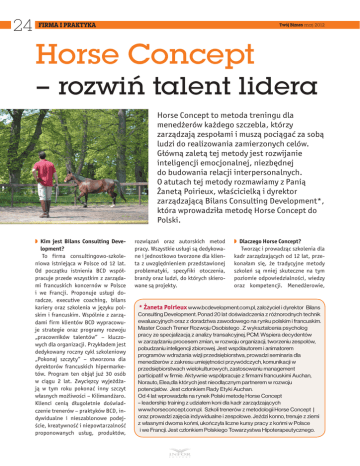 24 FIRMA I PRAKTYKA Twój Biznes maj 2012 Horse Concept – rozwiń talent lidera Horse Concept to metoda treningu dla menedżerów każdego szczebla, którzy zarządzają zespołami i muszą pociągać za sobą ludzi do realizowania zamierzonych celów. Główną zaletą tej metody jest rozwijanie inteligencji emocjonalnej, niezbędnej do budowania relacji interpersonalnych. O atutach tej metody rozmawiamy z Panią Żanetą Poirieux, właścicielką i dyrektor zarządzającą Bilans Consulting Development*, która wprowadziła metodę Horse Concept do Polski. ◗ Kim jest Bilans Consulting Development? To firma consultingowo-szkoleniowa istniejąca w Polsce od 12 lat. Od początku istnienia BCD współpracuje przede wszystkim z zarządami francuskich koncernów w Polsce i we Francji. Proponuje usługi doradcze, executive coaching, bilans kariery oraz szkolenia w języku polskim i francuskim. Wspólnie z zarządami firm klientów BCD wypracowuje strategie oraz programy rozwoju „pracowników talentów” – kluczowych dla organizacji. Przykładem jest dedykowany roczny cykl szkoleniowy „Pokonaj szczyty” – stworzona dla dyrektorów francuskich hipermarketów. Program ten objął już 30 osób w ciągu 2 lat. Zwycięzcy wyjeżdżają w tym roku pokonać inny szczyt własnych możliwości – Kilimandżaro. Klienci cenią długoletnie doświadczenie trenerów – praktyków BCD, indywidualne i nieszablonowe podejście, kreatywność i niepowtarzalność proponowanych usług, produktów, rozwiązań oraz autorskich metod pracy. Wszystkie usługi są dedykowane i jednostkowo tworzone dla klienta z uwzględnieniem przedstawionej problematyki, specyfiki otoczenia, branży oraz ludzi, do których skierowane są projekty. ◗ Dlaczego Horse Concept? Tworząc i prowadząc szkolenia dla kadr zarządzających od 12 lat, przekonałam się, że tradycyjne metody szkoleń są mniej skuteczne na tym poziomie odpowiedzialności, wiedzy oraz kompetencji. Menedżerowie, * Żaneta Poirieux www.bcdevelopment.com.pl, założyciel i dyrektor Bilans Consulting Development. Ponad 20 lat doświadczenia z różnorodnych technik ewaluacyjnych oraz z doradztwa zawodowego na rynku polskim i francuskim. Master Coach Trener Rozwoju Osobistego . Z wykształcenia psycholog pracy ze specjalizacją z analizy transakcyjnej, PCM. Wspiera decydentów w zarządzaniu procesem zmian, w rozwoju organizacji, tworzeniu zespołów, pobudzaniu inteligencji zbiorowej. Jest współautorem i animatorem programów wdrażania wizji przedsiębiorstwa, prowadzi seminaria dla menedżerów z zakresu umiejętności przywódczych, komunikacji w przedsiębiorstwach wielokulturowych, zastosowaniu management participatif w firmie. Aktywnie współpracuje z firmami francuskimi Auchan, Norauto, Elea,dla których jest nieodłącznym partnerem w rozwoju potencjałów. Jest członkiem Rady Etyki Auchan. Od 4 lat wprowadziła na rynek Polski metodę Horse Concept – leadership training z udziałem koni dla kadr zarządzających www.horseconcept.com.pl. Szkoli trenerów z metodologii Horse Concept | oraz prowadzi zajęcia indywidualne i zespołowe. Jeździ konno, trenuje z ziemi z własnymi dwoma końmi, ukończyła liczne kursy pracy z końmi w Polsce i we Francji. Jest członkiem Polskiego Towarzystwa Hipoterapeutycznego. FIRMA I PRAKTYKA Twój Biznes maj 2012 Opinie uczestników…. „Koncepcja jest genialna, a realizacja bardzo profesjonalna” Patrick Loiseau, Dyrektor Marketingu Europe Pfizer Laboratoire „Bezpośrednie korzyści i ochota do zmian jak nigdy’’ Florence Lesaffre, kierownik przemysłowy LSDH Orléans „Superlatywy są zbyt słabe. Jednym słowem: magiczne!” Didier Gand, Dyrektor Groupe Mousquetaires Intermarché decydenci potrzebują innej formy doskonalenia się – innych doznań, które pozostawią trwały ślad w ich świadomości i umiejętnościach. Często mają oni przesyt wiedzy, którą wpaja się im podczas szkoleń, konferencji. Nowo poznane techniki stosują przez pierwszy tydzień po powrocie do firmy. Później dawne odruchy wygrywają. Trening z końmi ma realną i niepowtarzalną wartość ze względu na fakt, iż bazuje nie tylko na zdobywaniu wiedzy, ale przede wszystkim na doskonaleniu własnych zachowań oraz na ich zmianie. Aby koń wykonał to, o co prosi go uczestnik szkolenia, musi czuć, że ma do czynienia z prawdziwym przywódcą, któremu chce się podporządkować oraz z którym zgadza się współpracować. To, jak stać się prawdziwym przywódcą, ćwiczymy metodą Horse Concept. Wszystkie techniki wyuczone na tradycyjnych szkoleniach zostają weryfikowane podczas spotkania z koniem. ◗ Po co konie podczas szkoleń? Konie, jako zwierzęta wyjątkowo wrażliwe i wyczulone bardziej niż człowiek, stają się podczas szkoleń dla uczestników „zwierciadłem” ich zdolności, umiejętności, niedostatków oraz nieskuteczności w byciu liderem. Konie „służą” uczestnikom do diagnozy ich zdolności interpersonalnych, komunikacji, zarządzania oraz do ich doskonalenia podczas ćwiczeń na żywo. Tym razem interlokutorami nie są ludzie, lecz konie. „Końskie zwierciadło” jest szczere i prawdziwe, ponieważ koń w kontakcie z człowiekiem nie spekuluje, nie stara się oszukać, aby zrobić przykrość lub się przypodobać. Jest autentyczny i pokazuje to, co w uczestnikach dobre i złe. Swoim zachowaniem, reakcją bądź jej brakiem, podpowiada, jak działać, żeby osiągać skuteczność i stawać się wiarygodnym i naturalnym przywódcą. Ponieważ z koniem nie da się niczego uzyskać siłą, uczestnicy uczą się, jak „zdobyć” jego psychikę i motywację do współpracy. Analogicznie jest w kontaktach z ludźmi. Można kogoś zmusić do działania, ale czy to sprawi, że staniemy się dla niego liderem, z którym dobrowolnie i z zaangażowaniem będzie chciał współpracować? ◗ Jak przebiegają takie szkolenia? Gdzie się odbywają ? Spotkania odbywają się indy