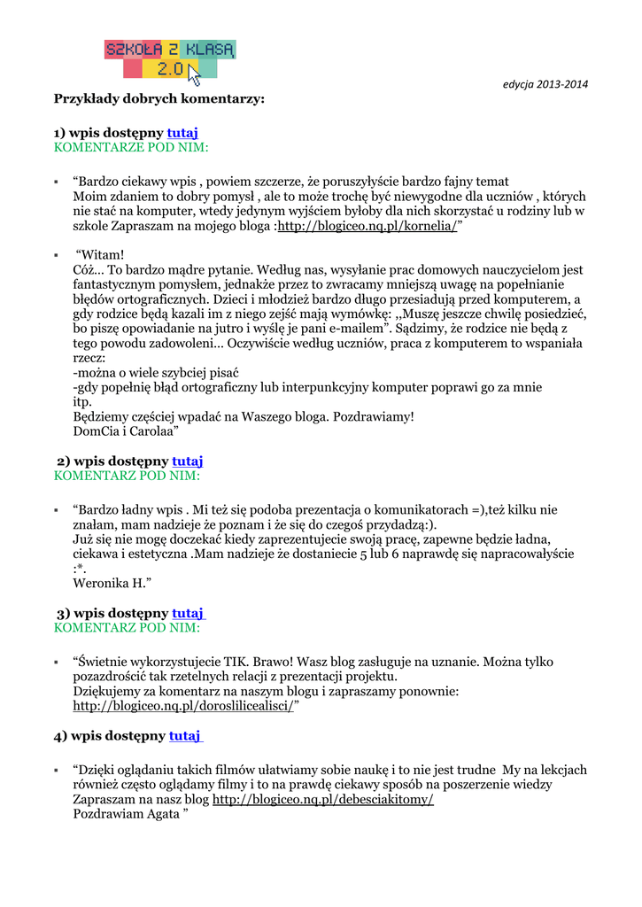 edycja 2013-2014 Przykłady dobrych komentarzy: 1) wpis dostępny tutaj KOMENTARZE POD NIM: “Bardzo ciekawy wpis , powiem szczerze, że poruszyłyście bardzo fajny temat Moim zdaniem to dobry pomysł , ale to może trochę być niewygodne dla uczniów , których nie stać na komputer, wtedy jedynym wyjściem byłoby dla nich skorzystać u rodziny lub w szkole Zapraszam na mojego bloga :http://blogiceo.nq.pl/kornelia/” “Witam! Cóż… To bardzo mądre pytanie. Według nas, wysyłanie prac domowych nauczycielom jest fantastycznym pomysłem, jednakże przez to zwracamy mniejszą uwagę na popełnianie błędów ortograficznych. Dzieci i młodzież bardzo długo przesiadują przed komputerem, a gdy rodzice będą kazali im z niego zejść mają wymówkę: ,,Muszę jeszcze chwilę posiedzieć, bo piszę opowiadanie na jutro i wyślę je pani e-mailem”. Sądzimy, że rodzice nie będą z tego powodu zadowoleni… Oczywiście według uczniów, praca z komputerem to wspaniała rzecz: -można o wiele szybciej pisać -gdy popełnię błąd ortograficzny lub interpunkcyjny komputer poprawi go za mnie itp. Będziemy częściej wpadać na Waszego bloga. Pozdrawiamy! DomCia i Carolaa” 2) wpis dostępny tutaj KOMENTARZ POD NIM: “Bardzo ładny wpis . Mi też się podoba prezentacja o komunikatorach =),też kilku nie znałam, mam nadzieje że poznam i że się do czegoś przydadzą:). Już się nie mogę doczekać kiedy zaprezentujecie swoją pracę, zapewne będzie ładna, ciekawa i estetyczna .Mam nadzieje że dostaniecie 5 lub 6 naprawdę się napracowałyście :*. Weronika H.” 3) wpis dostępny tutaj KOMENTARZ POD NIM: “Świetnie wykorzystujecie TIK. Brawo! Wasz blog zasługuje na uznanie. Można tylko pozazdrościć tak rzetelnych relacji z prezentacji projektu. Dziękujemy za komentarz na naszym blogu i zapraszamy ponownie: http://blogiceo.nq.pl/doroslilicealisci/” 4) wpis dostępny tutaj “Dzięki oglądaniu takich filmów ułatwiamy sobie naukę i to nie jest trudne My na lekcjach również często oglądamy filmy i to na prawdę ciekawy sposób na poszerzenie wiedzy Zapraszam na nasz blog http://blogiceo.nq.pl/debesciakitomy/ Pozdrawiam Agata ”