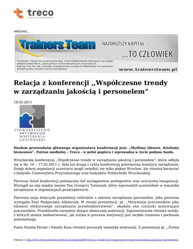 reklama Relacja z konferencji ,,Współczesne trendy w zarządzaniu jakością i personelem” 19.05.2011 Hasłem przewodnim głównego organizatora konferencji jest: „Myślimy ideowo, działamy biznesowo”. Patron medialny - Treco - w pełni popiera i wprowadza w życie podane hasło. Wrocławska konferencja ,,Współczesne trendy w zarządzaniu jakością i personelem”, która odbyła się w dn. 16 – 17.05.2011 r. była już drugą z cyklu konferencją poświęconą tematyce zarządzania. Dzięki dobrej organizacji uczestnicy mogli zwiedzić nie tylko piękny Wrocław, ale również korzystać z budynku Uniwersytetu Przyrodniczego oraz budynków Politechniki Wrocławskiej. Pierwszy dzień konferencji poświęcony był wystąpieniom prelegentów oraz uroczystej inauguracji. Wystąpił na niej między innymi Pan Grzegorz Tymoszyk, który wprowadził uczestników w tematykę zarządzania w organizacjach pozarządowych. Pierwsza sesja dotyczyła prezentacji referatów z zakresu zarządzania personelem. Jako pierwsza wystąpiła Pani Małgorzata Adamczyk. W swojej prezentacji, pt. ,,Motywacja pracowników jako element efektywnego zarządzania przedsiębiorstwem”, zbadała ona czynniki motywujące pracowników. Przedstawiła narzędzia służące skutecznej motywacji. Zaprezentowała również wyniki, z których można zaobserwować, jak ważna w procesie motywacji jest zwykła rozmowa i pochwała podwładnego. Panie Natalia Pernal i Natalia Koza również poruszyły tematykę motywacji. Z prezentacji pt. ,,Formy Pobrano z: http://www.treco.pl/wiedza/artykuly-szczegoly/id/401/relacja-z-konferencji-wspolczesne-trendy-w-zarzadzaniu-jakoscia-i-personelem-/ motywacji młodych ludzi w przedsiębiorstwie produkcyjnym”, można było dowiedzieć się, co pracownicy dostają od pracodawcy, a czego nie. Najbardziej zadziwiający okazał się wysoki wynik procentowy dla ilości pracowników, którzy nie wykazują chęci podnoszenia swoich kwalifikacji. Przebadano zarówno pracowników fizycznych jak i umysłowych, co pokazało, jak różny jest sposób wartościowania nagród i wynagrodzeń w tych dwóch grupach zawodowych. Kolejna prezentacja, ,,Zaangażowanie młodych pracowników szansą na zwiększenie wyników finansowych firmy”, autorstwa Agnieszki Machałek i Aleksandry Mazierczyk, pozwoliła autorkom obalić postawioną we wstępie prezentacji tezę. Początek prezentacji przedstawiał młodych pracowników jako zbyt entuzjastycznych i kreatywnych. Menedżerowie jak i działy personalne traktują ich jak osoby, które myślą, że wszystko im się należy. Przeprowadzone badania obalają tę tezę. Udowadniają, że młodzi pracownicy chcą się rozwijać, jak i przyczyniać się do rozwoju organizacji. Wystąpienie Pani Moniki Podkowińskiej, pt. ,,Komunikacja wertykalna w zarządzaniu personelem”, pokazuje jak ważna dla rozwoju firmy i pracownika jest organizacja. Zebrania informacyjne, jak i ciągły kontakt z personelem sprawiają że czują się oni istotnym elementem mającym wpływ na rozwój organizacji. Dzięki temu mają szansę na utożsamienie się z organizacją, co wpłynie na ich motywację do pracy. Ostatnim uczestnikiem pierwszej sesji był Pan Jakub Watral, który wystąpił z prezentacją pt. ,,Coaching, czyli sztuka zarządzania personelem w organizacji”. Przedstawił on punkt widzenia, wg którego każdy dyrektor / przełożony powinien być dla swojego podwładnego coachem. Dzięki temu pracownik miałby w nim stałe wsparcie. Po wszystkich wystąpieniach znalazł się również czas na krótką dyskusję Druga sesja dotyczyła zarządzania jakością. Jako pierwsza wystąpiła w niej Pani Katarzyna Dąbek, z prezentacją pt. ,,Six Sigma oraz organizacyjne uczenie się jako wyznacznik sukcesu firmy przypadek GE i Jacka Welcha”. Jest to metoda oparta na danych i faktach, a jej procesy polegają na zdobywaniu i formacji. Pani Katarzyna wyjaśniła, w jakim stopniu dana metoda jest ważna dla firmy GE i Jacka Welscha. Kolejne Panie - Katarzyna Olejnik i Agata Stelmach - zaprezentowały metodę FMEA, w prezentacji zatytułowanej ,,Analiza i doskonalenie procesu wytwarzania przy wykorzystaniu metody FMEA”. Jest to metoda która wyłapuje wszystkie niedociągnięcia w procesie produkcji i zapobiega ich powtórzeniu. Państwo Iwona Chmielewska, Sylwester Brzozowski oraz Rafał Brzezicki przedstawili pracę pt. ,,Jakość usług edukacyjnych w kontekście niżu demograficznego”. Wywołała ona największą dyskusję po zakończeniu drugiej sesji. Poruszony został temat chęci i przymusu do kształcenia się młodych ludzi. Debatowano również o ilości godzin przepracowanych przez osoby będące na stażach, praktykach, ale wspomniano w tym kontekście także o doktorantach. Następna trójka prelegentów: Anna Popławska, Jan Janiszewski i Kamil Siemieniuk przedstawili pracę pt. ,,Ciągłe doskonalenie systemu Kanban na przykładzie Metal – Fach Sp. z o.o.”. Przeprowadzili oni w niej analizę cyklu SDCA i PDCA. Omówili też szczegółowo system organizacji dostaw Kanban. Była to prezentacja, która wymagała od uczestników większego skupienia się. Twórcy prezentacji pobudzili uczestników konkursem z nagrodami. Pobrano z: http://www.treco.pl/wiedza/artykuly-szczegoly/id/401/relacja-z-konferencji-wspolczesne-trendy-w-zarzadzaniu-jakoscia-i-personelem-/ Pani Karolina Antos z Panią Marceliną Latochą przedstawiły prezentację pt. ,,Analiza działania systemu HACCP na przykładzie krakowskich lokali gastronomicznych”. Dzięki przeprowadzonym badaniom uzyskały informację, jak mała jest wiedza pracowników wybranych restauracji na temat systemów HACCP. Przyczyną jest brak informowania pracowników o rzeczach, które powinny być im doskonale znane. Jako ostatnia wystąpiła Pani Karolina Pietras w prezentacji pt. ,,Nowe wyzwania dla organizacji kształcenia ustawicznego. O modelu zarządzania jakością LQW”. Jest to całkowicie innowacy