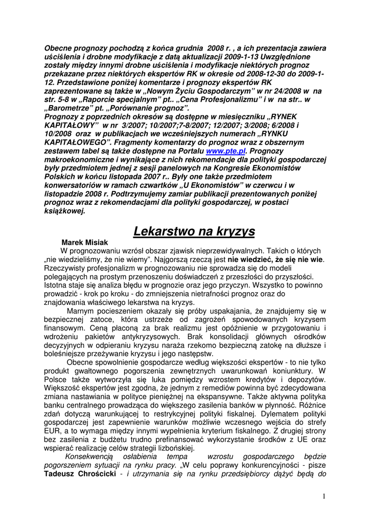 Obecne prognozy pochodzą z końca grudnia 2008 r. , a ich prezentacja zawiera uściślenia i drobne modyfikacje z datą aktualizacji 2009-1-13 Uwzględnione zostały między innymi drobne uściślenia i modyfikacje niektórych prognoz przekazane przez niektórych ekspertów RK w okresie od 2008-12-30 do 2009-112. Przedstawione poniżej komentarze i prognozy ekspertów RK zaprezentowane są także w „Nowym Życiu Gospodarczym” w nr 24/2008 w na str. 5-8 w „Raporcie specjalnym” pt.. „Cena Profesjonalizmu” i w na str.. w „Barometrze” pt. „Porównanie prognoz”. Prognozy z poprzednich okresów są dostępne w miesięczniku „RYNEK KAPITAŁOWY” w nr 3/2007; 10/2007;7-8/2007; 12/2007; 3/2008; 6/2008 i 10/2008 oraz w publikacjach we wcześniejszych numerach „RYNKU KAPITAŁOWEGO”. Fragmenty komentarzy do prognoz wraz z obszernym zestawem tabel są także dostępne na Portalu www.pte.pl. Prognozy makroekonomiczne i wynikające z nich rekomendacje dla polityki gospodarczej były przedmiotem jednej z sesji panelowych na Kongresie Ekonomistów Polskich w końcu listopada 2007 r.. Były one także przedmiotem konwersatoriów w ramach czwartków „U Ekonomistów” w czerwcu i w listopadzie 2008 r. Podtrzymujemy zamiar publikacji prezentowanych poniżej prognoz wraz z rekomendacjami dla polityki gospodarczej, w postaci książkowej. Lekarstwo na kryzys Marek Misiak W prognozowaniu wzrósł obszar zjawisk nieprzewidywalnych. Takich o których „nie wiedzieliśmy, że nie wiemy”. Najgorszą rzeczą jest nie wiedzieć, że się nie wie. Rzeczywisty profesjonalizm w prognozowaniu nie sprowadza się do modeli polegających na prostym przenoszeniu doświadczeń z przeszłości do przyszłości. Istotna staje się analiza błędu w prognozie oraz jego przyczyn. Wszystko to powinno prowadzić - krok po kroku - do zmniejszenia nietrafności prognoz oraz do znajdowania właściwego lekarstwa na kryzys. Marnym pocieszeniem okazały się próby uspakajania, że znajdujemy się w bezpiecznej zatoce, która ustrzeże od zagrożeń spowodowanych kryzysem finansowym. Ceną płaconą za brak realizmu jest opóźnienie w przygotowaniu i wdrożeniu pakietów antykryzysowych. Brak konsolidacji głównych ośrodków decyzyjnych w odpieraniu kryzysu naraża rzekomo bezpieczną zatokę na dłuższe i boleśniejsze przeżywanie kryzysu i jego następstw. Obecne spowolnienie gospodarcze według większości ekspertów - to nie tylko produkt gwałtownego pogorszenia zewnętrznych uwarunkowań koniunktury. W Polsce także wytworzyła się luka pomiędzy wzrostem kredytów i depozytów. Większość ekspertów jest zgodna, że jednym z remediów powinna być zdecydowana zmiana nastawiania w polityce pieniężnej na ekspansywne. Także aktywna polityka banku centralnego prowadząca do większego zasilenia banków w płynność. Różnice zdań dotyczą warunkującej to restrykcyjnej polityki fiskalnej. Dylematem polityki gospodarczej jest zapewnienie warunków możliwie wczesnego wejścia do strefy EUR, a to wymaga między innymi wypełnienia kryterium fiskalnego. Z drugiej strony bez zasilenia z budżetu trudno prefinansować wykorzystanie środków z UE oraz wspierać realizację celów strategii lizbońskiej. Konsekwencją osłabienia tempa wzrostu gospodarczego będzie pogorszeniem sytuacji na rynku pracy. „W celu poprawy konkurencyjności - pisze Tadeusz Chrościcki - i utrzymania się na rynku przedsiębiorcy dążyć będą do 1 ograniczania kosztów osobowych, minimalizując nie tylko poziom wynagrodzeń, ale głównie stan osobowy załóg. Do tego dojdą powroty z emigracji zarobkowej osób, które na skutek globalnej dekoniunktury straciły zagranicą możliwości zatrudnienia.” Z drugiej strony dopuściliśmy w tym roku do odejścia z rynku pracy 250 tysięcy ludzi na wcześniejsze emerytury. Deklaracje o aktywnym społeczeństwie pozostają w sferze deklaracji. Pod względem aktywności zawodowej lokujemy się na jednym z ostatnich miejsc w UE 27. Antidotum powinna być poprawa warunków działalności gospodarczej. W zaktualizowanym w końcu grudnia Programie Konwergencji pisze się o działaniach ograniczających przeszkody w rozwoju przedsiębiorczości. Zalicza się do nich przede wszystkim redukcję obciążeń administracyjnych, uproszczenie zasad podejmowania i prowadzenia działalności gospodarczej oraz poprawę funkcjonowania sądownictwa. Realizowane mają być również zadania związane z rozwojem współpracy sektora publicznego i prywatnego (w szczególności w formie partnerstwa publiczno-prywatnego) oraz wspieraniem innowacyjności i przedsiębiorczości. Będą one także sprzyjały pobudzaniu inwestycji. Równocześnie mają być wdrażane zmiany w administracji rządowej i samorządowej wpływające na zwiększenie sprawności funkcjonowania administracji publicznej. Tylko przyklasnąć. Mimo podobnych deklaracji zgłaszanych przez wiele poprzednich rządów w rankingach BŚ i innych instytucji międzynarodowych Polska zajmuje tu wciąż poślednie miejsce. Poprawa warunków działalności gospodarczej, to według prof. Krystyny Strzały z UG „palące” zalecenie dla polityki gospodarczej. Z kolei Tadeusz Chrościcki apeluje w sprawie uproszczenia wszelkich procedur związanych z rozdzielaniem środków unijnych. Powinno pobudzić to inwestycje infrastrukturalne, finansowane z funduszy strukturalnych i Funduszu Spójności, których wykorzystanie daleko odbiega od oczekiwań. Z ostatnio aktualizowanych prognoz wynika, że jeśli 2008 r. zamknie się względnie dobrze, to głownie dzięki I półroczu. Drugie półrocze, w tym zwłaszcza IV kw. 2008 r. były już dużo gorsze. Źle się zapowiada cały 2009 r., a zwłaszcza jego pierwsze półrocze. Drugie półrocze 2009 r. i 2010 r. mogą być już trochę lepsze od I półrocza 2009 r., ale występuje poważne ryzyko, że nie będą lepsze. W ciągu 2008 r. wszyscy sukcesywnie obniżali prognozowany wzrost PK