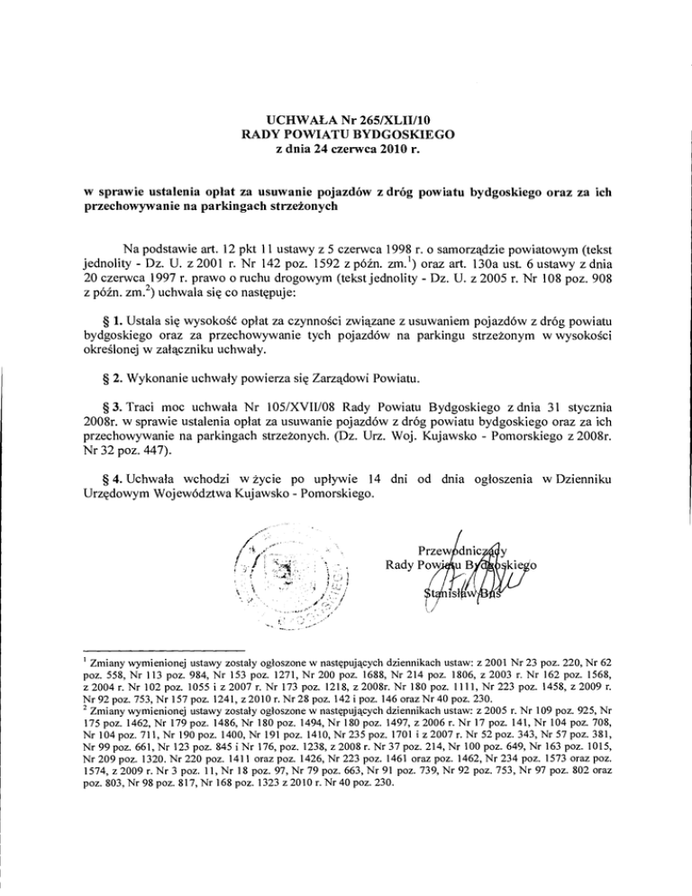 UCHWAŁA Nr 265/XLI1/10 RADY POWIATU BYDGOSKIEGO z dnia 24 czerwca 2010 r. w sprawie ustalenia op łat za usuwanie pojazdów z dróg powiatu bydgoskiego oraz za ich przechowywanie na parkingach strze żonych Na podstawie art. 12 pkt 11 ustawy z 5 czerwca 1998 r. o samorz ądzie powiatowym (tekst jednolity - Dz. U. z 2001 r. Nr 142 poz. 1592 z pó źn. zm. i ) oraz art. 130a ust. 6 ustawy z dnia 20 czerwca 1997 r. prawo o ruchu drogowym (tekst jednolity - Dz. U. z 2005 r. Nr 108 poz. 908 z późn. zm. 2) uchwala si ę co następuje: § 1. Ustala się wysokość opłat za czynno ści związane z usuwaniem pojazdów z dróg powiatu bydgoskiego oraz za przechowywanie tych pojazdów na parkingu strze żonym w wysoko ści okre ślonej w załączniku uchwały. § 2. Wykonanie uchwa ły powierza się Zarządowi Powiatu. § 3. Traci moc uchwała Nr 105/XV11/08 Rady Powiatu Bydgoskiego z dnia 31 stycznia 2008r. w sprawie ustalenia op łat za usuwanie pojazdów z dróg powiatu bydgoskiego oraz za ich przechowywanie na parkingach strze żonych. (Dz. Urz. Woj. Kujawsko - Pomorskiego z 2008r. Nr 32 poz. 447). § 4. Uchwała wchodzi w życie po upływie 14 dni od dnia ogłoszenia w Dzienniku Urzędowym Województwa Kujawsko - Pomorskiego. Przew Rady Pow, Zmiany wymienionej ustawy zosta ły ogłoszone w nast ępuj ących dziennikach ustaw: z 2001 Nr 23 poz. 220, Nr 62 poz. 558, Nr 113 poz. 984, Nr 153 poz. 1271, Nr 200 poz. 1688, Nr 214 poz. 1806, z 2003 r. Nr 162 poz. 1568, z 2004 r. Nr 102 poz. 1055 i z 2007 r. Nr 173 poz. 1218, z 2008r. Nr 180 poz. 1111, Nr 223 poz. 1458, z 2009 r. Nr 92 poz. 753, Nr 157 poz. 1241, z 2010 r. Nr 28 poz. 142 i poz. 146 oraz Nr 40 poz. 230. 2 Zmiany wymienionej ustawy zostały ogłoszone w następuj ących dziennikach ustaw: z 2005 r. Nr 109 poz. 925, Nr 175 poz. 1462, Nr 179 poz. 1486, Nr 180 poz. 1494, Nr 180 poz. 1497, z 2006 r. Nr 17 poz. 141, Nr 104 poz. 708, Nr 104 poz. 711, Nr 190 poz. 1400, Nr 191 poz. 1410, Nr 235 poz. 1701 i z 2007 r. Nr 52 poz. 343, Nr 57 poz. 381, Nr 99 poz. 661, Nr 123 poz. 845 i Nr 176, poz. 1238, z 2008 r. Nr 37 poz. 214, Nr 100 poz. 649, Nr 163 poz. 1015, Nr 209 poz. 1320. Nr 220 poz. 1411 oraz poz. 1426, Nr 223 poz. 1461 oraz poz. 1462, Nr 234 poz. 1573 oraz poz. 1574, z 2009 r. Nr 3 poz. 11, Nr 18 poz. 97, Nr 79 poz. 663, Nr 91 poz. 739, Nr 92 poz. 753, Nr 97 poz. 802 oraz poz. 803, Nr 98 poz. 817, Nr 168 poz. 1323 z 2010 r. Nr 40 poz. 230. Uzasadnienie Przepis art. 130a ust. 6 ustawy z dnia 20 czerwca 1997 r. prawo o ruchu drogowym (Dz. U. z 2005r. Nr 108 poz. 908 z pó źn. zm . ) zawiera delegacj ę dla rady powiatu do okre ślenia wysokości opłat za usuwanie pojazdów z dróg danego powiatu oraz op łat za przechowywanie takich pojazdów na parkingach strze żonych. Przedsi ębiorców, zajmuj ących si ę usuwaniem pojazdów z dróg oraz ich przechowywaniem - zgodnie z delegacj ą ustawową - wyznacza starosta, dokonuj ąc wyboru najkorzystniejszej ze złożonych ofert. Na konkurs og łoszony przez starost ę bydgoskiego, odpowiedziało dwóch przedsi ębiorców, którzy swoimi ofertami spe łniali wszystkie warunki wymagane ustaw ą Prawo o ruchu drogowym - zarówno w odniesieniu do mo żliwości technicznych niezb ędnych do usuwania pojazdów a także do ich przechowywania na parkingu strzeżonym. Zestawienie propozycji cenowych obu oferentów wykaza ło, że w odniesieniu do holowania pojazdów - poziom proponowanych op łat jest bardzo zbli żony. Różnica i to istotna uwidoczniła się po zestawieniu propozycji w zakresie op łat za przechowywanie pojazdów na parkingu. Propozycje (w tym zakresie) przedstawione przez Wies ława Paterskiego by ły niższe od 23% do 51%. Atrakcyjniejsza okaza ła się również jego oferta odnosz ąca si ę do parkingu dla pojazdów o wysokim tona żu szczególnie w zakresie jego warunków technicznych, wyposa żenia a także lokalizacji. Czynniki te okazały się decyduj ące przy wyborze jego oferty. Ponieważ generalnie, nowy poziom opłat różnił się od dotychczasowego - zatwierdzonego uchwałą Rady Powiatu nr 105/XVII/08 z dnia 31 stycznia 2008 r. zaistnia ła konieczno ść, podj ęcia przez Rad ę Powiatu uchwały określaj ącej nowy poziom op łat za wspomniane us ługi. Załącznik do Uchwały Nr 265/XLII/10 Rady Powiatu Bydgoskiego z dnia 24 czerwca 2010 r. I. Opłaty za usuwanie pojazdów. Prace przygotowawcze obejmuj ące pojazdy do 3,5 t dmc Lp. Pojazdy do 3,5t dmc Załadunek i rozładunek Wyciąganie spoza jezdni Stawianie pojazdu Przygotowanie do holowania 1. rower, motor 110; 180;/1h - - 2. motocykl, quad 110; 180;/1h - - 3. pojazd wolnobieżny 150; 180;/1h - - 4. samochód osobowy 150; 180;/1h - - 5. przyczepa lekka 150; 180;/1h - - 6. przyczepa 160; 180;/lh 180;/1h - 7. samochód ciężarowy 160; 180;/1h 180;/lh 250; ponad 1,5 t 8. naczepa 180;/lh 180;/lh 350; ponad 3,0 t 480; Prace przygotowawcze obejmuj ące pojazdy ponad 3,5 t dmc Lp. Pojazdy ponad 3,5t dmc Załadunek i rozładunek Wyciąganie spoza jezdni Stawianie pojazdu Przygotowanie do holowania 9. samochód ciężarowy 250; 450;/lh 450;/lh 450; 200 1); 10. autobus 350; 450;/1h 450;/1h 450; 11. ciągnik rolniczy 190; 450;/1h 450;/lh 300; 12. ciągnik siodłowy 400; 450;/1h 450;/1h 450; Postanowienia dodatkowe. 1. Elementem opłaty za wyciąganie pojazdu spoza krawędzi jezdni jest stawka za jedn ą godzinę pracy sprzętu oraz ludzi, okre ślona w wysokości 180,1/h (w odniesieniu do poz. 1 - 8). Ta sama zasada dotyczy stawki godzinowej (180; z ł) za stawianie pojazdu (poz. 6 - 8). Analogiczna sytuacja ma miejsce w przypadku stawki w wysoko ści 450;1/h za wykonywanie tych samych czynno ści w odniesieniu do poz. 9 - 12. Podstawę wyliczenia wysoko ści opłaty z uwzgl ędnieniem stawki za jedn ą godzinę stanowi czas faktycznego wykonania danej operacji np. stawiania pojazdu. Opłaty za czynno ści dodatkowe tj. wyciąganie bądź stawianie pojazdu doliczone mog ą być tylko wtedy gdy potrzebę taką okreś