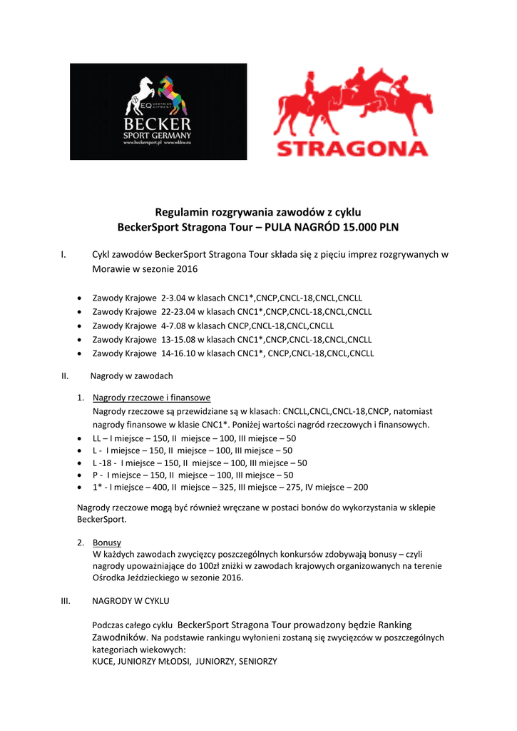 Regulamin rozgrywania zawodów z cyklu BeckerSport Stragona Tour – PULA NAGRÓD 15.000 PLN I. Cykl zawodów BeckerSport Stragona Tour składa się z pięciu imprez rozgrywanych w Morawie w sezonie 2016 II. Zawody Krajowe Zawody Krajowe Zawody Krajowe Zawody Krajowe Zawody Krajowe 2-3.04 w klasach CNC1*,CNCP,CNCL-18,CNCL,CNCLL 22-23.04 w klasach CNC1*,CNCP,CNCL-18,CNCL,CNCLL 4-7.08 w klasach CNCP,CNCL-18,CNCL,CNCLL 13-15.08 w klasach CNC1*,CNCP,CNCL-18,CNCL,CNCLL 14-16.10 w klasach CNC1*, CNCP,CNCL-18,CNCL,CNCLL Nagrody w zawodach 1. Nagrody rzeczowe i finansowe Nagrody rzeczowe są przewidziane są w klasach: CNCLL,CNCL,CNCL-18,CNCP, natomiast nagrody finansowe w klasie CNC1*. Poniżej wartości nagród rzeczowych i finansowych. LL – I miejsce – 150, II miejsce – 100, III miejsce – 50 L - I miejsce – 150, II miejsce – 100, III miejsce – 50 L -18 - I miejsce – 150, II miejsce – 100, III miejsce – 50 P - I miejsce – 150, II miejsce – 100, III miejsce – 50 1* - I miejsce – 400, II miejsce – 325, III miejsce – 275, IV miejsce – 200 Nagrody rzeczowe mogą byd również wręczane w postaci bonów do wykorzystania w sklepie BeckerSport. 2. Bonusy W każdych zawodach zwycięzcy poszczególnych konkursów zdobywają bonusy – czyli nagrody upoważniające do 100zł zniżki w zawodach krajowych organizowanych na terenie Ośrodka Jeździeckiego w sezonie 2016. III. NAGRODY W CYKLU Podczas całego cyklu BeckerSport Stragona Tour prowadzony będzie Ranking Zawodników. Na podstawie rankingu wyłonieni zostaną się zwycięzców w poszczególnych kategoriach wiekowych: KUCE, JUNIORZY MŁODSI, JUNIORZY, SENIORZY Zawodnicy, którzy minimum 3 razy startowali w zawodach zaliczanych do BeckerSport Stragona Tour zdobywają punkty do specjalnego rankingu. Poniżej tabela przyznawanych punktów: Miejsce/Punkty 1 2 3 4 5 6 7 8 9 10 CNC1 11 10 9 8 7 6 5 4 3 2 CNCP 11 10 9 8 7 6 5 4 3 2 CNCL 11 10 9 8 7 6 5 4 3 2 CNCL-18 11 10 9 8 7 6 5 4 3 2 CNCLL 11 10 9 8 7 6 5 4 3 2 W poszczególnych kategoriach wiekowych do zdobycia są następujące nagrody: KUCE - kupon do wykorzystania w sezonie 2017 w dowolnych jednych zawodach WKKW uprawniający do startu w zawodach w klasie CNCLL lub CNCL lub CNCP bez ponoszenia opłat wpisowego i za boks. JUNIORZY MŁODSI - kupon do wykorzystania w sezonie 2017 w dowolnych jednych zawodach WKKW uprawniający do startu w zawodach w klasie CNCLL lub CNCL lub CNCP bez ponoszenia opłat wpisowego i za boks. JUNIORZY - kupon do wykorzystania w sezonie 2017 w dowolnych jednych zawodach WKKW uprawniający do startu w zawodach w klasie CNCP lub CNC1* lub CIC1* bez ponoszenia opłat wpisowego i za boks. SENIORZY - kupon do wykorzystania w sezonie 2017 w dowolnych jednych zawodach WKKW uprawniający do startu w zawodach w klasie CNC1* lub CIC1* lub CIC2* bez ponoszenia opłat wpisowego i za boks. Nagrody wygrane za zwycięstwo w cyklu BeckerSport Stragona Tour mogą byd wykorzystane na dowolnych zawodach w Morawie w sezonie 2017 roku. Po tym okresie przepadają. Szczegółowe zasady rozgrywania zawodów regulują propozycje zawodów zatwierdzone przez PZJ.