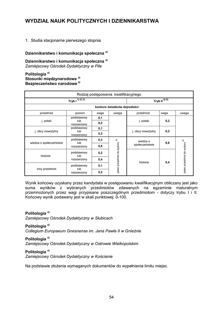 WYDZIAŁ NAUK POLITYCZNYCH I DZIENNIKARSTWA 1. Studia stacjonarne pierwszego stopnia Dziennikarstwo i komunikacja społeczna a) Dziennikarstwo i komunikacja społeczna a) Zamiejscowy Ośrodek Dydaktyczny w Pile Politologia a) Stosunki międzynarodowe a) Bezpieczeństwo narodowe a) Rodzaj postępowania kwalifikacyjnego Tryb I 1) 2) 3) Tryb II 5) 6) konkurs świadectw dojrzałości historia inny przedmiot podstawowy lub rozszerzony 0,3 podstawowy lub rozszerzony 0,2 podstawowy lub rozszerzony 0,1 przedmiot waga uwaga j. polski 0,2 j. obcy nowożytny 0,2 wiedza o społeczeństwie 0,6 historia 0,4 0,2 0,1 0,2 0,6 0,4 0,2 4) wiedza o społeczeństwie uwaga 0,1 jeden przedmiot do wyboru j. obcy nowożytny waga 4) j. polski poziom podstawowy lub rozszerzony podstawowy lub rozszerzony jeden przedmiot do wyboru przedmiot Wynik końcowy uzyskany przez kandydata w postępowaniu kwalifikacyjnym obliczany jest jako suma wyników z wybranych przedmiotów zdawanych na egzaminie maturalnym przemnożonych przez wagi przypisane poszczególnym przedmiotom - dotyczy trybu I i II. Końcowy wynik podawany jest w skali punktowej: 0-100. Politologia a) Zamiejscowy Ośrodek Dydaktyczny w Słubicach Politologia a) Collegium Europaeum Gnesnense im. Jana Pawła II w Gnieźnie Politologia a) Zamiejscowy Ośrodek Dydaktyczny w Ostrowie Wielkopolskim Politologia a) Zamiejscowy Ośrodek Dydaktyczny w Kościanie Na podstawie złożenia wymaganych dokumentów do wypełnienia limitu miejsc. 54 2. Studia stacjonarne 2-letnie drugiego stopnia Politologia c) dla absolwentów studiów stacjonarnych pierwszego stopnia tego samego lub pokrewnego kierunku Ranking ocen na dyplomach ukończenia studiów pierwszego stopnia. Politologia c) Studia prowadzone wspólnie przez Uniwersytet im. A. Mickiewicza w Poznaniu i Uniwersytet Europejski Viadrina we Frankfurcie n/Odrą Collegium Polonicum w Słubicach dla absolwentów studiów pierwszego stopnia tego samego lub pokrewnego kierunku 1) Egzamin pisemny z języka angielskiego. 2) Egzamin ustny w języku angielskim z zakresu wiedzy o polityce. Stosunki międzynarodowe c) dla absolwentów studiów pierwszego stopnia tego samego lub pokrewnego kierunku Ranking ocen na dyplomach ukończenia studiów pierwszego stopnia. Dziennikarstwo i komunikacja społeczna c) dla absolwentów studiów pierwszego stopnia tego samego lub pokrewnego kierunku Ranking ocen na dyplomach ukończenia studiów pierwszego stopnia. 3. Studia niestacjonarne pierwszego stopnia Dziennikarstwo i komunikacja społeczna a) g) Dziennikarstwo i komunikacja społeczna a) g) Zamiejscowy Ośrodek Dydaktyczny w Pile Bezpieczeństwo narodowe a) g) Politologia a) g) Politologia a) g) Zamiejscowy Ośrodek Dydaktyczny w Słubicach Politologia a) g) Collegium Europaeum Gnesnense im. Jana Pawła II w Gnieźnie Politologia a) g) Zamiejscowy Ośrodek Dydaktyczny w Ostrowie Wielkopolskim Politologia a) g) Zamiejscowy Ośrodek Dydaktyczny w Kościanie Stosunki międzynarodowe a) g) Na podstawie złożenia wymaganych dokumentów do wypełnienia limitu miejsc. 55 4. Studia niestacjonarne drugiego stopnia Politologia c) g) dla absolwentów studiów pierwszego stopnia tego samego lub pokrewnego kierunku Stosunki międzynarodowe c) g) dla absolwentów studiów pierwszego stopnia tego samego lub pokrewnego kierunku Dziennikarstwo i komunikacja społeczna c) g) dla absolwentów studiów pierwszego stopnia tego samego lub pokrewnego kierunku Na podstawie złożenia wymaganych dokumentów do wypełnienia limitu miejsc. Objaśnienie stosowanych przypisów: 6) Suma wyników egzaminu maturalnego zdawanego w części pisemnej. Uwzględniany jest tylko jeden poziom. W przypadku, gdy kandydat posiada z danego przedmiotu wyniki z egzaminu maturalnego na poziomie podstawowym i rozszerzonym uwzględniany jest wynik z poziomu korzystniejszego dla kandydata. Sposób przeliczania wyników matury międzynarodowej (IB) na punkty „nowej matury” podany jest w § 20 ust. 1 Części ogólnej Uchwały. Jeżeli kandydat zdawał więcej niż jeden z wymienionych przedmiotów, to brany pod uwagę jest najkorzystniejszy z wyników. Jeżeli kandydat posiada dwie oceny z egzaminu dojrzałości z wymaganego przedmiotu (egzamin pisemny i ustny), to wybierany jest najlepszy wynik. Sposób przeliczania ocen z egzaminu dojrzałości na punkty podany jest w § 21 Części ogólnej Uchwały. a) b) c) d) e) f) g) Studia pierwszego stopnia (3-letnie) prowadzące do uzyskania tytułu zawodowego licencjata. Studia pierwszego stopnia (3,5-letnie) prowadzące do uzyskania tytułu zawodowego inżyniera. Studia drugiego stopnia (2-letnie) prowadzące do uzyskania tytułu zawodowego magistra. Studia drugiego stopnia (2-letnie) prowadzące do uzyskania tytułu zawodowego magistra sztuki. Jednolite studia magisterskie (5-letnie) prowadzące do uzyskania tytułu zawodowego magistra. Studia niestacjonarne - zajęcia odbywają się w ciągu tygodnia. Studia niestacjonarne - zajęcia odbywają się od piątku do niedzieli. 1) 2) 3) 4) 5) 56