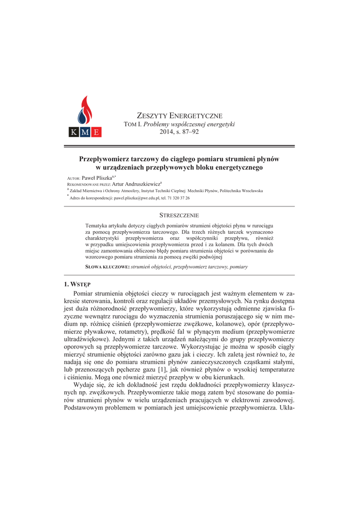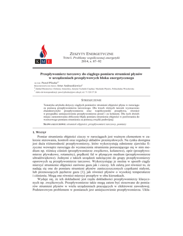 ZESZYTY ENERGETYCZNE TOM I. Problemy współczesnej energetyki 2014, s. 87–92 Przepływomierz tarczowy do ciągłego pomiaru strumieni płynów w urządzeniach przepływowych bloku energetycznego a,• AUTOR: Paweł Pliszka a REKOMENDOWANE PRZEZ: Artur Andruszkiewicz a Zakład Miernictwa i Ochrony Atmosfery, Instytut Techniki Cieplnej Mechniki Płynów, Politechnika Wrocławska • Adres do korespondencji: [email protected], tel. 71 320 37 26 STRESZCZENIE Tematyka artykułu dotyczy ciągłych pomiarów strumieni objętości płynu w rurociągu za pomocą przepływomierza tarczowego. Dla trzech różnych tarczek wyznaczono charakterystyki przepływomierza oraz współczynniki przepływu, również w przypadku umiejscowienia przepływomierza przed i za kolanem. Dla tych dwóch miejsc zamontowania obliczono błędy pomiaru strumienia objętości w porównaniu do wzorcowego pomiaru strumienia za pomocą zwężki podwójnej SŁOWA KLUCZOWE: strumień objętości, przepływomierz tarczowy, pomiary 1. WSTĘP Pomiar strumienia objętości cieczy w rurociągach jest ważnym elementem w zakresie sterowania, kontroli oraz regulacji układów przemysłowych. Na rynku dostępna jest duża różnorodność przepływomierzy, które wykorzystują odmienne zjawiska fizyczne wewnątrz rurociągu do wyznaczenia strumienia poruszającego się w nim medium np. różnicę ciśnień (przepływomierze zwężkowe, kolanowe), opór (przepływomierze pływakowe, rotametry), prędkość fal w płynącym medium (przepływomierze ultradźwiękowe). Jednymi z takich urządzeń należącymi do grupy przepływomierzy oporowych są przepływomierze tarczowe. Wykorzystując je można w sposób ciągły mierzyć strumienie objętości zarówno gazu jak i cieczy. Ich zaletą jest również to, że nadają się one do pomiaru strumieni płynów zanieczyszczonych cząstkami stałymi, lub przenoszących pęcherze gazu [1], jak również płynów o wysokiej temperaturze i ciśnieniu. Mogą one również mierzyć przepływ w obu kierunkach. Wydaje się, że ich dokładność jest rzędu dokładności przepływomierzy klasycznych np. zwężkowych. Przepływomierze takie mogą zatem być stosowane do pomiarów strumieni płynów w wielu urządzeniach pracujących w elektrowni zawodowej. Podstawowym problemem w pomiarach jest umiejscowienie przepływomierza. Ukła- 88 P. Pliszka dy rurociągów często nie posiadają odpowiednio długich odcinków prostych w celu utrzymania przepływu niezaburzonego. Montaż przepływomierza w takim układzie powoduje powstanie dodatkowych błędów pomiarowych [2]. Celem artykułu jest wyznaczenie przykładowych charakterystyk przepływomierza tarczowego, również w przypadku pomiaru w miejscach zaburzających przepływ, a także dla tych przypadków wyznaczenie błędów pomiarowych. 2. RÓWNANIE CHARAKTERYSTYKI PRZEPŁYWOMIERZA TARCZOWEGO Rysunek 1 przedstawia schemat przepływomierza i zdjęcie jego prototypu. Przepływomierz składa się z zamocowanej wewnątrz rurociągu okrągłej tarczki (1) wykonanej z pleksi i umieszczonej największą powierzchnią prostopadle do kierunku przepływu. Tarczka połączona jest ze stalowym ramieniem (5) poruszającym się swobodnie w kierunku przepływu na zaczepie (6), Siła naporu hydrodynamicznego na tarczkę wyrażana jest zgodnie z równaniem dźwigni: Fp Y F X (1) w którym: F – siła odczytywana w trakcie pomiarów, X i Y długości ramion układu przenoszenia siły. Siła F mierzona była przy zastosowaniu belki tensometrycznej zamocowanej do zewnętrznej ścianki rurociągu za pomocą obejmy (4) [3], a jej wartość odczytywana była (zarówno w gramach i w mV) z przetwornika stanowiącego podzespół wagowy firmy RADWAG. Rys. 1. a) Schemat budowy modelu oporowego przepływomierza tarczowego: 1 – tarczka pomiarowa, 2 – kanał o przekroju kołowym, 3 – belka tensometryczna, 4 – obejma mocująca belkę nieruchomo na rurociągu, 5 – ramie przenoszące siłę nacisku z tarczki na belkę, 6 – zaczep do swobodnej pracy ramienia. b) Zdjęcie prototypu przepływomierza tarczowego Przepływomierz tarczowy do ciągłego pomiaru strumieni płynów w urządzeniach … 89 Strumień objętości qv przepływającej cieczy w przestrzeni między ścianką rury, a tarczką wyraża równanie (2): S qv w ( DR2 DT2 ) (2) 4 w którym w – średnia prędkość płynu . Siłę oporu tarczki można przedstawić w postaci równania (3): cT U w2 S DT2 (3) 2 4 w którym cT – współczynnik oporu tarczki, U – gęstość płynu. Rozwiązując te dwa równania otrzymamy równanie charakterystyki przepływomierza w postaci: F §1 E 2 · 1 F ¸ DR ¨¨ ¸ U 2 © E ¹ cT S qv (4) w którym β= DDT – przewężenie. R Równanie (4) można zapisać również w postaci: qv K DR F U S §1 E 2 · 1 ¸ ¨ 2 ¨© E ¸¹ cT K (5) (6) Współczynnik K nazywa się często współczynnikiem przepływu i dla danej średnicy tarczki i średnicy rurociągu jest funkcją liczby Reynoldsa. W stanie równowagi (kiedy X = Y) wartość siły oporu F równa się wartości siły Fp naporu hydrodynamicznego płynu na tarczkę i można ja wyznaczyć z równania 7: S DT2 ( p1 p2 ) 4 w którym p1 i p2 ciśnienia przed i za tarczką [4,5,6]. F Fp (7) 3. METODYKA BADAŃ Pomiary wykonano w rurociągu o średnicy wewnętrznej DR = 80 mm. W badaniach zastosowano tarczki o średnicach DT równych odpowiednio 30, 40, 50 i 60 mm. Przepływomierz umieszczony był w trzech różnych miejscach instalacji – na długim odcinku prostym; przed i za kolanem – jak pokazano na rysunku 2. 90 P. Pliszka Prosta Przed kolanem Za kolanem Wentylator Wentylator >10D Wentylator >10D qv qv qv Rys. 2. Miejsca zainstalowania przepływomierza tarczowego w instalacji Strumień objętości qv mierzono kontrolnie za pomocą kryzy podwójnej zamontowanej w rurociągu. Gęstość powietrza obliczano mierząc jego nadciśnienie i temperaturę wewnątrz rurociągu, natomiast wilgotność powietrza wyznaczano psychro