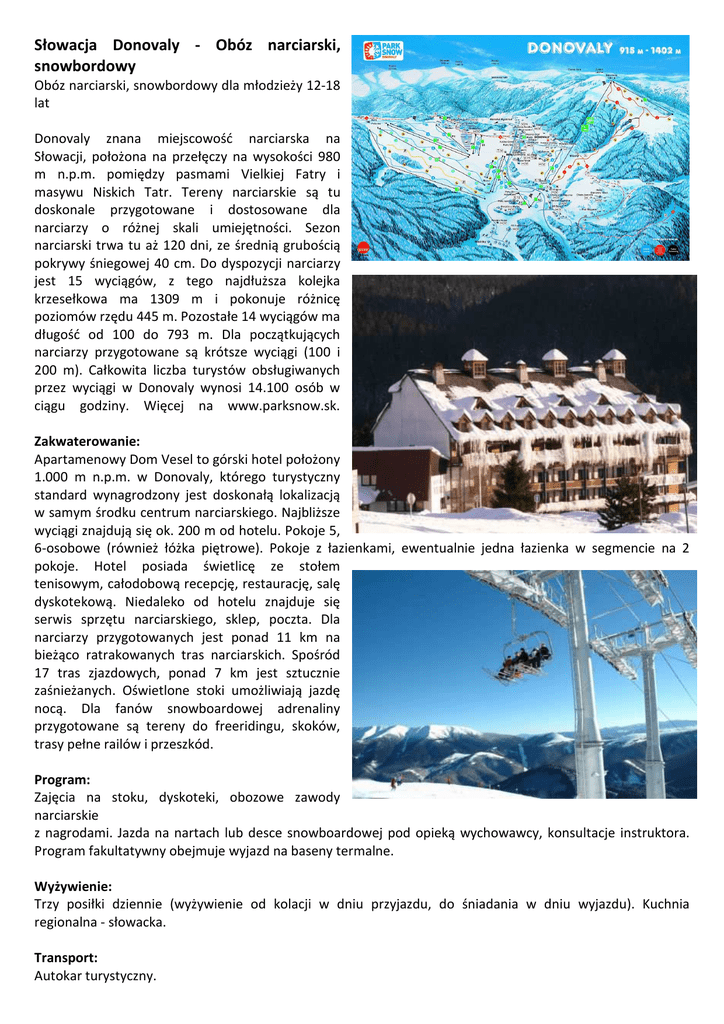 Słowacja Donovaly - Obóz narciarski, snowbordowy Obóz narciarski, snowbordowy dla młodzieży 12-18 lat Donovaly znana miejscowość narciarska na Słowacji, położona na przełęczy na wysokości 980 m n.p.m. pomiędzy pasmami Vielkiej Fatry i masywu Niskich Tatr. Tereny narciarskie są tu doskonale przygotowane i dostosowane dla narciarzy o różnej skali umiejętności. Sezon narciarski trwa tu aż 120 dni, ze średnią grubością pokrywy śniegowej 40 cm. Do dyspozycji narciarzy jest 15 wyciągów, z tego najdłuższa kolejka krzesełkowa ma 1309 m i pokonuje różnicę poziomów rzędu 445 m. Pozostałe 14 wyciągów ma długość od 100 do 793 m. Dla początkujących narciarzy przygotowane są krótsze wyciągi (100 i 200 m). Całkowita liczba turystów obsługiwanych przez wyciągi w Donovaly wynosi 14.100 osób w ciągu godziny. Więcej na www.parksnow.sk. Zakwaterowanie: Apartamenowy Dom Vesel to górski hotel położony 1.000 m n.p.m. w Donovaly, którego turystyczny standard wynagrodzony jest doskonałą lokalizacją w samym środku centrum narciarskiego. Najbliższe wyciągi znajdują się ok. 200 m od hotelu. Pokoje 5, 6-osobowe (również łóżka piętrowe). Pokoje z łazienkami, ewentualnie jedna łazienka w segmencie na 2 pokoje. Hotel posiada świetlicę ze stołem tenisowym, całodobową recepcję, restaurację, salę dyskotekową. Niedaleko od hotelu znajduje się serwis sprzętu narciarskiego, sklep, poczta. Dla narciarzy przygotowanych jest ponad 11 km na bieżąco ratrakowanych tras narciarskich. Spośród 17 tras zjazdowych, ponad 7 km jest sztucznie zaśnieżanych. Oświetlone stoki umożliwiają jazdę nocą. Dla fanów snowboardowej adrenaliny przygotowane są tereny do freeridingu, skoków, trasy pełne railów i przeszkód. Program: Zajęcia na stoku, dyskoteki, obozowe zawody narciarskie z nagrodami. Jazda na nartach lub desce snowboardowej pod opieką wychowawcy, konsultacje instruktora. Program fakultatywny obejmuje wyjazd na baseny termalne. Wyżywienie: Trzy posiłki dziennie (wyżywienie od kolacji w dniu przyjazdu, do śniadania w dniu wyjazdu). Kuchnia regionalna - słowacka. Transport: Autokar turystyczny. Ubezpieczenie: Signal Iduna S.A. – Ski Informacje dodatkowe: Cena nie zawiera opłaty za karnety narciarskie, na które należy przygotować dla młodzieży około 90 EUR (ceny grupowe) + kaucja za skipass ok. 5 EUR. Biuro nie ponosi odpowiedzialności w przypadku zmiany ceny karnetów. W karcie zdrowia musi być zapisana informacja lekarza o braku przeciwwskazań do udziału w obozie sportowym. Zalecane jest posiadanie kasku ochronnego, szczególnie dla początkujących narciarzy i snowboardzistów. Dodatkowo dla snowboardzistów zalecamy zabranie i używanie ochraniaczy na nadgarstki. Konieczny paszport lub dowód osobisty.