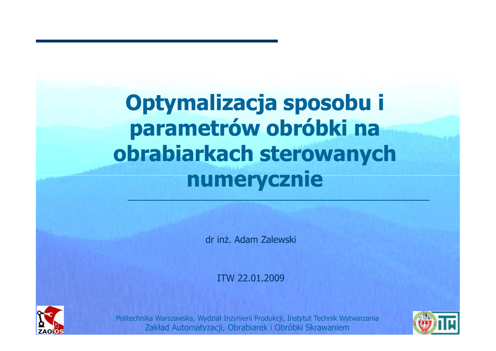 Optymalizacja sposobu i parametrów obróbki na obrabiarkach sterowanych numerycznie dr inŜ. Adam Zalewski ITW 22.01.2009 Politechnika Warszawska, Wydział InŜynierii Produkcji, Instytut Technik Wytwarzania Zakład Automatyzacji, Obrabiarek i Obróbki Skrawaniem Plan wystąpienia Przegląd problematyki Istniejący stan wiedzy Integrator CNC/CAM Wniosek o grant badawczy Dalsze plany Politechnika Warszawska, Wydział InŜynierii Produkcji, Instytut Technik Wytwarzania Zakład Automatyzacji, Obrabiarek i Obróbki Skrawaniem Przegląd problematyki „Inteligentne” OSN Funkcje wspomagające elastyczność wytwarzania Zastosowanie czujników i dodatkowych sygnałów sprzęŜenia zwrotnego Zastosowanie sond pomiaru N i PO Połączenie z LAN, wymiana danych, raportowanie, funkcje serwisowe, automatyczny nadzór Konfiguracja układu kinematycznego OSN ze względu na przeznaczenie technologiczne analizę dynamiczną pracy OSN wynikową dokładność geometryczną PO Program CAM a OSN Postprocesory do wymiany danych między CAM i OSN „Inteligentny” program CAM Optymalizacja parametrów obróbki Parametryzacja technik CAM i programowania CAM a OSN Politechnika Warszawska, Wydział InŜynierii Produkcji, Instytut Technik Wytwarzania Zakład Automatyzacji, Obrabiarek i Obróbki Skrawaniem Przegląd problematyki „Inteligentny” program CAM (cd) Symulacja i weryfikacja procesów off-line Baza wiedzy technologicznej – wiedza ogólna, poziom zakładu, poziom indywidualnego technologa Cykle, funkcje pomocnicze, podprogramy, programowanie za pomocą makr, programowanie parametryczne Korekcja 2/3d -> 5 osi – moŜliwość wymiany N bez modyfikacji programu NC Nowe strategie obróbki (HSM, obróbki wydajnościowe, materiałów twardych, cienkościennych, …) Wykorzystanie narzędzi specjalnych na tle integracji CAx Wykrywanie kolizji i innych nieprawidłowości Optymalizacja parametrów obróbki Optymalizacja pracy OSN i R (ESW) Analiza dynamiczna Kierunki rozwoju, perspektywy, prognozy Politechnika Warszawska, Wydział InŜynierii Produkcji, Instytut Technik Wytwarzania Zakład Automatyzacji, Obrabiarek i Obróbki Skrawaniem Istniejący stan wiedzy Ograniczenia techniczne (1) Integracja CAM i OSN Ograniczenia metodologiczne (2) Rys. 1 Trudności w integracji CAM/OSN Politechnika Warszawska, Wydział InŜynierii Produkcji, Instytut Technik Wytwarzania Zakład Automatyzacji, Obrabiarek i Obróbki Skrawaniem Istniejący stan wiedzy ograniczenia techniczne (1): brak dostosowania OSN do moŜliwości CAM brak dostosowania CAM do moŜliwości OSN Politechnika Warszawska, Wydział InŜynierii Produkcji, Instytut Technik Wytwarzania Zakład Automatyzacji, Obrabiarek i Obróbki Skrawaniem Ograniczenia techniczne • Wolne i długie dojazdy i odjazdy N. Brak dostosowania OSN do moŜliwości CAM • Występują istotne róŜnice między modelem półfabrykatu i rzeczywistym półfabrykatem. • Optymalizacja parametrów w CAM nie jest 100% efektywna. • symulacje VR nie uwzględniają dynamiki maszyny, napędów, dokładności geometrycznej i ruchowej OSN. Politechnika Warszawska, Wydział InŜynierii Produkcji, Instytut Technik Wytwarzania Zakład Automatyzacji, Obrabiarek i Obróbki Skrawaniem Ograniczenia techniczne • Brak poprawnej symulacji cykli maszynowych Brak dostosowania CAM do moŜliwości OSN • Brak aktualnej informacji o dostępności, numeracji i parametrach narzędzi w magazynie OSN • Brak informacji o parametrach konfiguracyjnych OSN (ma to szczególnie znaczenie dla układów wieloosiowych) • Długi okres wdraŜania i aktualizacji programów CAM oraz postprocesorów dostosowanych do konkretnych OSN Politechnika Warszawska, Wydział InŜynierii Produkcji, Instytut Technik Wytwarzania Zakład Automatyzacji, Obrabiarek i Obróbki Skrawaniem Ograniczenia techniczne CAD CAM Uniwersalny zapis (APT,NCI,CLDATA,…) Postprocesor Program (NC) OSN Rys. 2 Przepływ informacji CAD/CAM/OSN Politechnika Warszawska, Wydział InŜynierii Produkcji, Instytut Technik Wytwarzania Zakład Automatyzacji, Obrabiarek i Obróbki Skrawaniem Przepływ informacji CAD/CAM/OSN Dane OSN Dane US CAD CAM Uniwersalny zapis (APT,NCI,CLDATA,…) Postprocesor Program (NC) OSN Rys. 3 Zastosowanie dodatkowych definicji US i OSN Politechnika Warszawska, Wydział InŜynierii Produkcji, Instytut Technik Wytwarzania Zakład Automatyzacji, Obrabiarek i Obróbki Skrawaniem Przepływ informacji CAD/CAM/OSN CAD CAM Uniwersalny zapis (APT,NCI,CLDATA,…) Postprocesor Symulacja (VR OSN) Program (NC) OSN Rys. 4 Symulacja obróbki na podstawie uniwersalnego zapisu technologii Politechnika Warszawska, Wydział InŜynierii Produkcji, Instytut Technik Wytwarzania Zakład Automatyzacji, Obrabiarek i Obróbki Skrawaniem Przepływ informacji CAD/CAM/OSN Symulacja (VR OSN) CAD CAM Uniwersalny zapis (APT,NCI,CLDATA,…) Postprocesor Postprocesor odwrotny Program (NC) OSN Rys. 5 Symulacja obróbki wykorzystująca tzw. postprocesor odwrotny Politechnika Warszawska, Wydział InŜynierii Produkcji, Instytut Technik Wytwarzania Zakład Automatyzacji, Obrabiarek i Obróbki Skrawaniem Przepływ informacji CAD/CAM/OSN CAD Uniwersalny zapis CAM (APT,NCI,CLDATA,…) Postprocesor Program (NC) OSN Symulacja (Panel OSN) Rys. 6 Symulacja obróbki w panelu sterowania OSN Politechnika Warszawska, Wydział InŜynierii Produkcji, Instytut Technik Wytwarzania Zakład Automatyzacji, Obrabiarek i Obróbki Skrawaniem Przepływ informacji CAD/CAM/OSN CAD (model testowy) Symulacja (VR OSN) Wstępna Konfiguracja postprocesora Dokumentacja techniczna i programowania OSN Uniwersalny zapis CAM (APT,NCI,CLDATA,…) Modyfikacja postprocesora Rys. 7 Schemat typowego algorytmu dostosowania postprocesora do współpracy CAM - OSN Postprocesor Program (NC) Korekcja Programu NC Testy OSN Symulacja (Panel OSN) Politechnika Warszawska, Wydział InŜynierii Produkcji, Instytut Technik Wytwarzania Zakład Automatyzacji, Obrabiarek i Obróbki Skrawaniem Koncepcja Integratora C