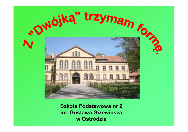 Szkoła Podstawowa nr 2 im. Gustawa Gizewiusza w Ostródzie „Edukacja zdrowotna jest to proces, w którym ludzie uczą się dbać o zdrowie własne i społeczności , w której żyją”. T. Williams Zgodnie z prezentowanym cytatem nasza szkoła zaangażowała się w edukacje uczniów, rodziców i nauczycieli zgodnie z celami programu „Trzymaj Formę” pod hasłem projektu edukacyjnego „Z „Dwójką” trzymam formę”. listopad 2007- maj 2008 Uczniowie klas I- VI ( 405 z 445 osób) Nauczyciele i pracownicy szkoły (40 osób) Rodzice uczniów (140 osób) Zapoznanie grona pedagogicznego z programem „Trzymaj Formę”. Ustalenie działań w ramach realizacji programu; Ustalenie harmonogramu działań; Podział obowiązków pomiędzy grono pedagogiczne; Zapoznanie rodziców na zebraniach klasowych z celami programu edukacyjnego „Trzymaj formę”. Program artystyczny i konkursy dla uczniów i rodziców z wiedzy z zakresu zdrowego odżywiania. Zajęcia edukacyjne na lekcjach przedmiotowych z zakresu korzystania z informacji zamieszczonych na opakowaniach produktów spożywczych. Zawody sportowe w ramach aktywności fizycznej oraz kiermasz zdrowej żywności. Plastyczny. LiterackiAby cera była biała i się nigdy nie starzała, Aby zdrowym być i nie tyć, Aby mieć apetyt Trzeba jeść owoce miła, Abyś długo, długo żyła. uczniowie klasy III c Kto owoce i warzywa konsumuje, Temu zdrowie i uroda dopisuje. Dominik Grzymkowski kl. II a W zdrowym ciele zdrowy duch, Gdy warzywa idą w ruch. Zdrowa buzia, zdrowe ciało, Gdy z owocem się widziało. Arek Walewski kl. II a pisać każdy może. O, mój panie! Na śniadanie zjedz melona i całego winogrona. Będziesz Brzuszek mieć płaski, jeśli zjesz różne sałatki. Wzrok sokoli, jeśli owoców będziesz jadł do woli. Cerę gładką, jeśli zjesz jabłko. Zęby zdrowe, gdy zjesz krowę, która mleko daje zdrowe. Bo to wszystko jest wesołe, smaczne, zdrowe, kolorowe. uczniowie klasy III c Marchewkę chrupiemy jak małe zajączki, Pomidory też zjadamy, gdy nam wpadną w rączki. Natalia Nowocińska kl. II a Program został dobrze przyjęty przez społeczność szkolną. Uczniowie z wielkim zaangażowaniem wykonywali powierzone im zadania, rodzice aktywnie włączyli się do realizacji projektu. Dzięki udziałowi w projekcie udało nam się uświadomić dzieciom i rodzicom jak ważny jest codzienny ruch, prawidłowe odżywianie oraz ile istnieje różnych form aktywnego wypoczynku. Koordynator szkolny i współkoordynatorzy programu w Szkole Podstawowej nr 2 w Ostródzie.
