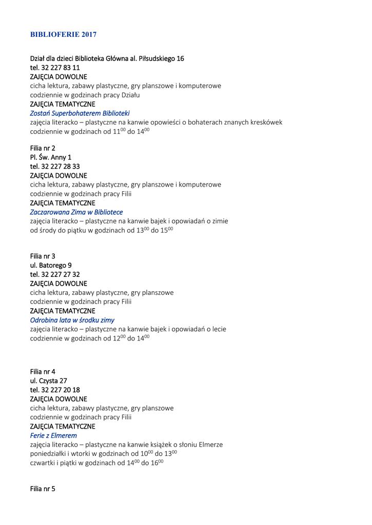 BIBLIOFERIE 2017 Dział dla dzieci Biblioteka Główna al. Piłsudskiego 16 tel. 32 227 83 11 ZAJĘCIA DOWOLNE cicha lektura, zabawy plastyczne, gry planszowe i komputerowe codziennie w godzinach pracy Działu ZAJĘCIA TEMATYCZNE Zostań Superbohaterem Biblioteki zajęcia literacko – plastyczne na kanwie opowieści o bohaterach znanych kreskówek codziennie w godzinach od 1100 do 1400 Filia nr 2 Pl. Św. Anny 1 tel. 32 227 28 33 ZAJĘCIA DOWOLNE cicha lektura, zabawy plastyczne, gry planszowe i komputerowe codziennie w godzinach pracy Filii ZAJĘCIA TEMATYCZNE Zaczarowana Zima w Bibliotece zajęcia literacko – plastyczne na kanwie bajek i opowiadań o zimie od środy do piątku w godzinach od 1300 do 1500 Filia nr 3 ul. Batorego 9 tel. 32 227 27 32 ZAJĘCIA DOWOLNE cicha lektura, zabawy plastyczne, gry planszowe codziennie w godzinach pracy Filii ZAJĘCIA TEMATYCZNE Odrobina lata w środku zimy zajęcia literacko – plastyczne na kanwie bajek i opowiadań o lecie codziennie w godzinach od 1200 do 1400 Filia nr 4 ul. Czysta 27 tel. 32 227 20 18 ZAJĘCIA DOWOLNE cicha lektura, zabawy plastyczne, gry planszowe codziennie w godzinach pracy Filii ZAJĘCIA TEMATYCZNE Ferie z Elmerem zajęcia literacko – plastyczne na kanwie książek o słoniu Elmerze poniedziałki i wtorki w godzinach od 1000 do 1300 czwartki i piątki w godzinach od 1400 do 1600 Filia nr 5 ul. Dąbrowskiego 5 tel. 32 227 62 71 ZAJĘCIA DOWOLNE cicha lektura, zabawy plastyczne, gry planszowe codziennie w godzinach pracy Filii ZAJĘCIA TEMATYCZNE Zimowa Kraina Smoków zajęcia literacko – plastyczne na kanwie bajek i opowiadań o smokach środy w godzinach od 1200 do 1300 Filia nr 6 ul. Edukacji 64 tel. 32 227 85 59 ZAJĘCIA DOWOLNE cicha lektura, zabawy plastyczne, gry planszowe poniedziałki, środy, piątki w godzinach pracy Filii Filia nr 10 (Urbanowice) ul. Przejazdowa 6 tel. 32 216 92 42 ZAJĘCIA DOWOLNE cicha lektura, zabawy plastyczne, gry planszowe codziennie w godzinach pracy Filii ZAJĘCIA TEMATYCZNE Biblioferie z Detektywem Pozytywką zajęcia literacko – plastyczne na kanwie opowiadań o Detektywie Pozytywce codziennie w godzinach od 1100 do 1300 Filia nr 11 ul. Kopernika 3 tel. 32 218 14 53 ZAJĘCIA DOWOLNE cicha lektura, zabawy plastyczne, gry planszowe codziennie w godzinach pracy Filii ZAJĘCIA TEMATYCZNE Zimowe zabawy na śniegu zajęcia literacko – plastyczne na kanwie bajek i wierszy o zimie wtorki w godzinach od 1200 do 1400 piątki w godzinach od 1500 do 1700 Filia nr 12 ul. Zaręby 31a tel. 32 219 73 75 ZAJĘCIA DOWOLNE cicha lektura, zabawy plastyczne, gry planszowe i komputerowe codziennie w godzinach pracy Filii ZAJĘCIA TEMATYCZNE Drugie Życie Książki zajęcia literacko – plastyczne na kanwie dawnych bajek i opowiadań z wykorzystaniem makulatury pochodzącej z zubytkowanych książek codziennie w godzinach od 1000 do 1200 Filia nr 13 al. Niepodległości 110 tel. 32 217 31 52 ZAJĘCIA DOWOLNE cicha lektura, zabawy plastyczne, gry planszowe i komputerowe codziennie w godzinach pracy Filii ZAJĘCIA TEMATYCZNE Całkiem (nie)straszne ferie z Trzynastką zajęcia literacko – plastyczne na kanwie bajek i opowiadań z dreszczykiem codziennie w godzinach od 1300 do 1400 SZCZEGÓŁY 16.01. PORA NA POTWORA NA CMENTARZYSKU KSIĄŻEK – spotkanie z książkowymi straszydłami, rysowanie własnego potwora na podstawie opisu literackiego 17.01. STRASZNA GRA – tworzenie gry rządzącej się własnymi zasadami, ale też rozgrywki w coś znanego 18.01. STRACH MA WIELKIE OCZY – tworzenie masek, w których strach zajrzeć do zwierciadła 19.01. SMOK, CZY SMAK – wielki test odwagi. Czy spróbujesz to zjeść? Chcesz zielone, czy… 20.01. LOCHY NA WYCIĄGNIĘCIE RĘKI – escape room w bibliotecznej piwniczce 23.01. ZLOT CZAROWNIC I WIEDŹMINÓW – zabawy ruchowe dla potwornych gości (w programie taniec szaleńca, wygibasy mumii i inne pląsy straszydeł) 24.01. WYCIE, JĘCZENIE I ŚMIECH – zabawa w dźwiękowców, szukanie najstraszniejszego odgłosu 25.01. STRASZNY PAN CIASTEK – dekorowanie, a potem pożarcie strasznych ciasteczek 26.01. WARSZTATY „JAK ZROBIĆ FRANKENSTEINA” – grupowe tworzenie oraz nadanie imienia stworowi Frankensteina 27.01. KOSZMARNY KONIEC – konkurs na najstraszniejszego potwora w dowolnej technice Filia nr 18 ul. Konfederatów Barskich 17-19 tel. 32 219 50 66 ZAJĘCIA DOWOLNE cicha lektura, zabawy plastyczne, gry planszowe codziennie w godzinach pracy Filii ZAJĘCIA TEMATYCZNE Ciekawość – pierwszy stopień do… zabawy zajęcia literacko – plastyczne na kanwie książki Wścibscy Doroty Gellner codziennie w godzinach od 1100 do 1400