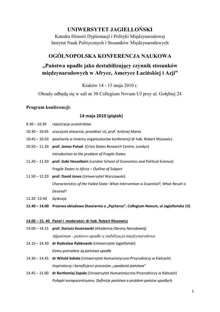 UNIWERSYTET JAGIELLOŃSKI Katedra Historii Dyplomacji i Polityki Międzynarodowej Instytut Nauk Politycznych i Stosunków Międzynarodowych OGÓLNOPOLSKA KONFERENCJA NAUKOWA „Państwa upadłe jako destabilizujący czynnik stosunków międzynarodowych w Afryce, Ameryce Łacińskiej i Azji” Kraków 14 - 15 maja 2010 r. Obrady odbędą się w sali nr 30 Collegium Novum UJ przy ul. Gołębiej 24 Program konferencji: 14 maja 2010 (piątek) 9.30 – 10.30 rejestracja uczestników 10.30 – 10.45 uroczyste otwarcie, prorektor UJ, prof. Andrzej Mania 10.45 – 10.50 powitanie w imieniu organizatorów konferencji dr hab. Robert Kłosowicz 10.50 – 11.20 prof. James Putzel (Crisis States Research Centre, Londyn) Introduction to the problem of Fragile States 11.20 – 11.50 prof. Gabi Hesselbein (London School of Economics and Political Science) Fragile States in Africa – Outline of Subject 11.50 – 12.20 prof. David Jones (Uniwersytet Warszawski) Characteristics of the Failed State: What Intervention is Essential?, What Result is Desired? 12.20 -12.40 dyskusja 12.40 – 14.00 Przerwa obiadowa (Kawiarnia u „Pęcherza”, Collegium Novum, ul Jagiellońska 15) 14.00 – 15. 40 Panel I moderator: dr hab. Robert Kłosowicz 14.00 – 14.15 prof. Dariusz Kozerawski (Akademia Obrony Narodowej) Afganistan - państwo upadłe a stabilizacja międzynarodowa 14.15 – 14.30 dr Radosław Rybkowski (Uniwersytet Jagielloński) Komu potrzebne są państwa upadłe 14.30 – 14.45 dr Witold Sokała (Uniwersytet Humanistyczno-Przyrodniczy w Kielcach) Inspiratorzy i beneficjenci procesów „upadania państwa” 14.45 – 15.00 dr Bartłomiej Zapała (Uniwersytet Humanistyczno-Przyrodniczy w Kielcach) Pułapki europocentryzmu. Definicje państwa a problem państw upadłych 1 15.00 – 15.15 mgr Margot Stańczyk-Minkiewicz (Akademia Marynarki Wojennej w Gdyni) Państwa upadłe jako przestrzeń sprzyjająca powstawaniu, rozwojowi i działalności organizacji terrorystycznych 15.15 – 15.40 dyskusja 15.40 – 16.00 przerwa kawowa 16.00 – 17.45 Panel II moderator: Prof. Dariusz Kozerawski 16.00 – 16.15 prof. Tomasz Szubrycht (Akademia Marynarki Wojennej w Gdyni) Nadbrzeżne państwa upadłe a bezpieczeństwo transportu morskiego 16.15 – 16.30 dr Andrzej Bursztyński (Akademia Marynarki Wojennej w Gdyni) Współpraca cywilno-wojskowa w ramach wielonarodowych misji wojskowych w państwach upadłych 16.30 – 16.45 dr Artur Gruszczak (Uniwersytet Jagielloński) Państwa upadłe jako zagrożenie bezpieczeństwa wewnętrznego Unii Europejskiej 16.45 – 17.00 dr Rafał Ożarowski (Uniwersytet Gdański) Liban jako państwo upadłe i konsekwencje tego dla regionu Bliskiego Wschodu 17.00 – 17.15 dr Wojciech Michnik (Krakowska Akademia) Jedzenie zupy nożem”? - Doświadczenia militarne Stanów Zjednoczonych w państwach upadłych: Przyczynek do badań 17.15 - 17.45 dyskusja 17.45 – 19.10 Panel III moderator: prof. Tomasz Szubrycht 17.45 – 18.00 prof. Magdalena Śniadecka-Kotarska (Uniwersytet Łódzki) Instytucjonalizacja protestów ulicznych w Boliwii – kryzys państwowości czy zmiany etnopolityczne 18.00 – 18.15 dr Karol Derwich (Uniwersytet Jagielloński) „Niejedyna” gra w mieście – czynniki destabilizujące sytuację polityczną na Haiti 18.15– 18.30 dr Anna Kaganiec-Kamieńska (Uniwersytet Jagielloński) Odarci z dzieciństwa – udział dzieci żołnierzy w konflikcie zbrojnym w Kolumbii 18.30 – 18.45 dr Donata Rossa-Kilian (Akademia Marynarki Wojennej w Gdyni) Meksyk – przegrane państwo: Przyczyny i skutki braku efektywności polityki bezpieczeństwa w Meksykańskich Stanach Zjednoczonych. 18.45 – 19.10 dyskusja 19.30 – 22.00 Uroczysta kolacja (restauracja „Wierzynek”, Rynek Główny 15) 2 15 maja 2010 (sobota) 9.15 – 10.15 Panel IV moderator: prof. David Jones 9:15 – 9.30 dr Marcin Grabowski (Uniwersytet Jagielloński) Asian Development Patterns in Africa 9.30 – 9.45 mgr Anna Wnuk (Lazarski University) Colonial Heritage and African State Failure 9.45 – 10.00 mgr Monika Różalska (Instytut Studiów Politycznych PAN) Poor Leadership as the Crucial Factor of Sub-Saharan African Countries’ Weakness 10 .00 – 10.15 dyskusja 10.15 – 11.50 Panel V moderator: dr Marcin Grabowski 10.15 – 10.30 dr Radosław Domke (Uniwersytet Zielonogórski) Geopolityczne znaczenie państw upadłych w Afryce 10.30 – 10.45 dr Grzegorz Gil (UMCS w Lublinie) Sekurytyzacja upadania państwa po zimnej wojnie 10.45 – 11.00 dr Dariusz Góra-Szopiński (Uniwersytet Mikołaja Kopernika w Toruniu) Amerykańscy neokonserwatyści i kryterium jakościowe w polityce międzynarodowej 11.00 – 11.15 mgr Piotr Pietrzak (Uniwersytet Warmińsko-Mazurski w Olsztynie) Teoria Francisa Fukuyamy a praktyka Baracka Obamy na gruncie rozważań o żywotności państwowości afgańskiej w perspektywie roku 2011. 11.15 – 11.30 mgr Alicja Głuszek (Uniwersytet Jagielloński) Inicjatywa Merida: Współpraca amerykańsko-meksykańska w zakresie wymiaru sprawiedliwości i bezpieczeństwa 11.30 – 11.50 dyskusja 11.50 - 12.10 przerwa kawowa 12.10 – 13.55 Panel VI, moderator: dr Marcin Fatalski 12.10 – 12.25 dr Katarzyna Wardin, (Akademia Marynarki Wojennej w Gdyni) Skuteczność działań Unii Europejskiej w rozwiązywaniu problemów państwa upadłych na przykładzie operacji morskiej „Atalanta” 12.25 – 12.40 mgr Magdalena Rekść (Uniwersytet Łódzki) Kosowo - europejski przedstawiciel "państw upadłych" 3 12.40 – 12.55 mgr Marika Kosiel (Uniwersytet Warszawski) Współpraca rozwojowa UE-Boliwia w kontekście stabilizacji państwa 12.55 – 13.10 mgr Maciej Peter-Wirski (Uniwersytet Łódzki) Wpływ czynników ponowoczesności na powstanie fenomenu państw upadłych 13.10 – 13.25 mgr Tomasz Gajewski (Uniwersytet Humanistyczno-Przyrodniczy w Kielcach) Regionalny wymiar libańskich konfliktów wewnętrznych 13.25 – 13.40 mgr Krzysztof Pająk (Dywizjon Okrętów Podwodnych) Postkonfliktowa S