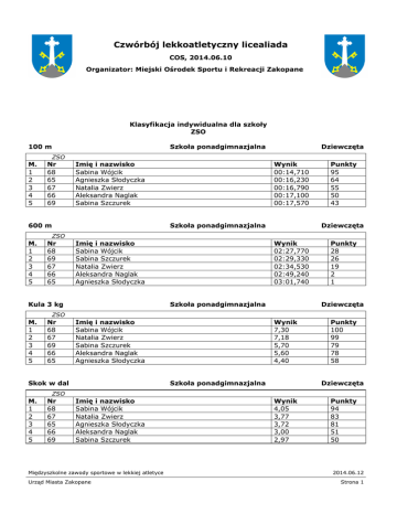 Czwórbój lekkoatletyczny licealiada COS, 2014.06.10 Organizator: Miejski Ośrodek Sportu i Rekreacji Zakopane Klasyfikacja indywidualna dla szkoły ZSO 100 m Szkoła ponadgimnazjalna Dziewczęta ZSO M. 1 2 3 4 5 Nr 68 65 67 66 69 Imię i nazwisko Sabina Wójcik Agnieszka Słodyczka Natalia Zwierz Aleksandra Naglak Sabina Szczurek 600 m Wynik 00:14,710 00:16,230 00:16,790 00:17,100 00:17,570 Szkoła ponadgimnazjalna Punkty 95 64 55 50 43 Dziewczęta ZSO M. 1 2 3 4 5 Nr 68 69 67 66 65 Imię i nazwisko Sabina Wójcik Sabina Szczurek Natalia Zwierz Aleksandra Naglak Agnieszka Słodyczka Kula 3 kg Wynik 02:27,770 02:29,330 02:34,530 02:49,240 03:01,740 Szkoła ponadgimnazjalna Punkty 28 26 19 2 1 Dziewczęta ZSO M. 1 2 3 4 5 Nr 68 67 69 66 65 Imię i nazwisko Sabina Wójcik Natalia Zwierz Sabina Szczurek Aleksandra Naglak Agnieszka Słodyczka Skok w dal Wynik 7,30 7,18 5,70 5,60 4,40 Szkoła ponadgimnazjalna Punkty 100 99 79 78 58 Dziewczęta ZSO M. 1 2 3 4 5 Nr 68 67 65 66 69 Imię i nazwisko Sabina Wójcik Natalia Zwierz Agnieszka Słodyczka Aleksandra Naglak Sabina Szczurek Międzyszkolne zawody sportowe w lekkiej atletyce Urząd Miasta Zakopane Wynik 4,05 3,77 3,72 3,00 2,97 Punkty 94 83 81 51 50 2014.06.12 Strona 1 Czwórbój lekkoatletyczny licealiada COS, 2014.06.10 Organizator: Miejski Ośrodek Sportu i Rekreacji Zakopane 100 m Szkoła ponadgimnazjalna Chłopcy ZSO M. 1 Nr 70 Imię i nazwisko Marcin Milan 1000 m Wynik 00:12,150 Szkoła ponadgimnazjalna Punkty 107 Chłopcy ZSO M. 1 Nr 70 Imię i nazwisko Marcin Milan Kula 5 kg Wynik 03:40,440 Szkoła ponadgimnazjalna Punkty 42 Chłopcy ZSO M. 1 Nr 70 Imię i nazwisko Marcin Milan Skok w dal Wynik 9,18 Szkoła ponadgimnazjalna Punkty 95 Chłopcy ZSO M. 1 Nr 70 Imię i nazwisko Marcin Milan Wynik 5,22 Punkty 84 Sędziowie zawodów: Międzyszkolne zawody sportowe w lekkiej atletyce Urząd Miasta Zakopane 2014.06.12 Strona 2