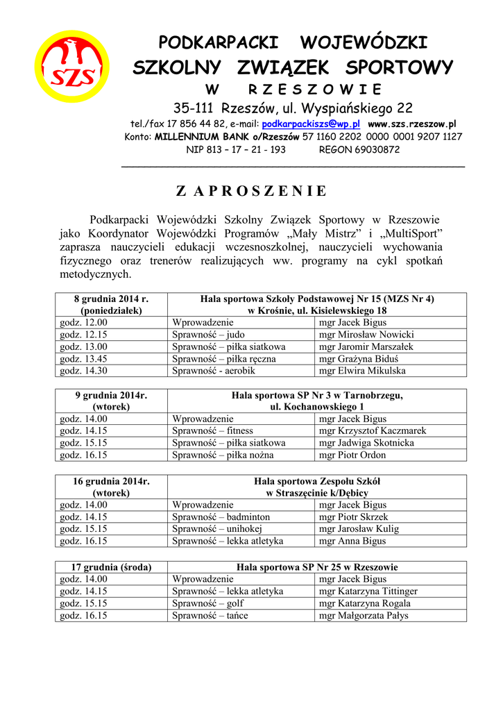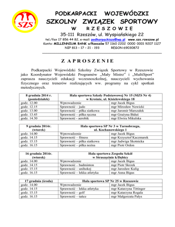 PODKARPACKI WOJEWÓDZKI SZKOLNY ZWIĄZEK SPORTOWY W R Z E S Z O W I E 35-111 Rzeszów, ul. Wyspiańskiego 22 tel./fax 17 856 44 82, e-mail: [email protected] www.szs.rzeszow.pl Konto: MILLENNIUM BANK o/Rzeszów 57 1160 2202 0000 0001 9207 1127 NIP 813 – 17 – 21 - 193 REGON 69030872 ___________________________________________________________ Z APROSZENIE Podkarpacki Wojewódzki Szkolny Związek Sportowy w Rzeszowie jako Koordynator Wojewódzki Programów „Mały Mistrz” i „MultiSport” zaprasza nauczycieli edukacji wczesnoszkolnej, nauczycieli wychowania fizycznego oraz trenerów realizujących ww. programy na cykl spotkań metodycznych. 8 grudnia 2014 r. (poniedziałek) godz. 12.00 godz. 12.15 godz. 13.00 godz. 13.45 godz. 14.30 Hala sportowa Szkoły Podstawowej Nr 15 (MZS Nr 4) w Krośnie, ul. Kisielewskiego 18 Wprowadzenie mgr Jacek Bigus Sprawność – judo mgr Mirosław Nowicki Sprawność – piłka siatkowa mgr Jaromir Marszałek Sprawność – piłka ręczna mgr Grażyna Biduś Sprawność - aerobik mgr Elwira Mikulska 9 grudnia 2014r. (wtorek) godz. 14.00 godz. 14.15 godz. 15.15 godz. 16.15 Hala sportowa SP Nr 3 w Tarnobrzegu, ul. Kochanowskiego 1 Wprowadzenie mgr Jacek Bigus Sprawność – fitness mgr Krzysztof Kaczmarek Sprawność – piłka siatkowa mgr Jadwiga Skotnicka Sprawność – piłka nożna mgr Piotr Ordon 16 grudnia 2014r. (wtorek) godz. 14.00 godz. 14.15 godz. 15.15 godz. 16.15 Hala sportowa Zespołu Szkół w Straszęcinie k/Dębicy Wprowadzenie mgr Jacek Bigus Sprawność – badminton mgr Piotr Skrzek Sprawność – unihokej mgr Jarosław Kulig Sprawność – lekka atletyka mgr Anna Bigus 17 grudnia (środa) godz. 14.00 godz. 14.15 godz. 15.15 godz. 16.15 Hala sportowa SP Nr 25 w Rzeszowie Wprowadzenie mgr Jacek Bigus Sprawność – lekka atletyka mgr Katarzyna Tittinger Sprawność – golf mgr Katarzyna Rogala Sprawność – tańce mgr Małgorzata Pałys PODKARPACKI WOJEWÓDZKI SZKOLNY ZWIĄZEK SPORTOWY W R Z E S Z O W I E 35-111 Rzeszów, ul. Wyspiańskiego 22 tel./fax 17 856 44 82, e-mail: [email protected] www.szs.rzeszow.pl Konto: MILLENNIUM BANK o/Rzeszów 57 1160 2202 0000 0001 9207 1127 NIP 813 – 17 – 21 - 193 REGON 69030872 ___________________________________________________________ 18 grudnia 2014. (czwartek) godz. 13.00 godz. 13.15 godz. 14.15 godz. 15.15 Hala sportowa POSiR Przemyśl, ul. Mickiewicza 30 Wprowadzenie mgr Jacek Bigus Sprawność – do ustalenia Sprawność – do ustalenia Sprawność – do ustalenia Podczas zajęć obowiązują stroje sportowe. Zajęcia prowadzone będą z udziałem uczestniczących nauczycieli. Prosimy o zgłaszanie się na poszczególne spotkania telefonicznie (17 856 44 82) lub e-mailem ([email protected]) najpóźniej 2 dni przed konferencją. Koszty konferencji (wynajem sali, wykładowcy, serwis kawowy) pokrywa samorząd Województwa Podkarpackiego. Uczestniczy przyjeżdżają na własny koszt. Zapraszamy również nauczycieli edukacji wczesnoszkolnej oraz nauczycieli wychowania fizycznego prowadzących zajęcia w klasach I – III SP na konferencję metodyczno-szkoleniową, która odbędzie się w Dębicy w dniach 12-13 grudnia. Szczegóły w osobnym zaproszeniu. Wiceprezes PW SZS w Rzeszowie Jacek Bigus
