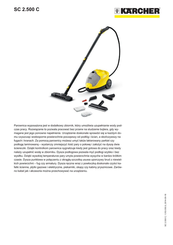 SC 2.500 C SC 2.500 C, 1.512-350.0, 2014-09-18 Parownica wyposażona jest w dodatkowy zbiornik, który umożliwia uzupełnianie wody podczas pracy. Rozwiązanie to pozwala pracować bez przerw na studzenie bojlera, gdy wymagane jest jego ponowne napełnienie. Urządzenie doskonale sprawdzi się w każdym domu czyszcząc wodooporne powierzchnie począwszy od podłóg i ścian, a skończywszy na fugach i kranach. Za pomocą parownicy możesz umyć także lakierowany parkiet czy podłogę laminowaną – wystarczy zmniejszyć ilość pary o połowę i założyć na dyszę dwie ściereczki. Dzięki kontrolkom parownica sygnalizuje kiedy jest gotowa do pracy oraz kiedy należy uzupełnić wodę w zbiorniku. Dysza podłogowa pozwala myć podłogi szybko i bez wysiłku. Dzięki wysokiej temperaturze pary umyta powierzchnia wysycha w bardzo krótkim czasie. Dysza punktowa w połączeniu z okrągłą szczotką usuwa uporczywy brud z niewielkich powierzchni – fug czy armatury. Dysza ręczna wraz z powłoczką doskonale czyści kafelki ścienne, płytki gazowe i elektryczne, piekarniki, okapy czy kabiny prysznicowe. Zarówno kabel jak i akcesoria można przechowywać na urządzeniu. SC 2.500 C Dane techniczne Numer katalogowy 1.512-350.0 4039784452015 V 220–240 Częstotliwość Hz 50–60 Moc grzałki W 1500 Maks. ciśnienie pary bar 3,2 Czas podgrzewania min 6 Pojemność kotła / zbiornika wyrównawczego Przewód zasilający l 0,5 / 0,8 m 4 Ciężar bez wyposażenia kg 4,1 Wyposażenie standardowe Zabezpieczenie przed dziećmi Zawór bezpieczeństwa Wbudowany lejek do napełniania System dwóch zbiorników Pozycja parking Wąż parowy z pistoletem m Dysza punktowa 2 Dysza ręczna Szczotka okrągła, czarna Stück 1 Ściereczka frotte do dyszy ręcznej Stück 1 Objęte dostawą. SC 2.500 C, 1.512-350.0, 2014-09-18 Napięcie Akcesoria dla SC 2.500 C 1.512-350.0 1 2 3 4 5 7 8 9 10 11 12 13 14 15 Numer katalogowy Cena Opis Dysze Dysza ręczna 1 2.884-280.0 Dysza podłogowa 2 2.885-142.0 Dysza do pielęgnacji tekstyliów 3 4.130-390.0 Przedłużka z dyszą Power 4 2.884-282.0 Dysza do okien 5 4.130-115.0 Gumowa listwa do dyszy do okien 6 6.273-140.0 Dysza punktowa 7 2.884-281.0 Doskonała do czyszczenia szczelin, rogów, krawędzi i innych trudnodostępnych miejsc. W połączeniu z szczotką okrągłą daje wiele zastosowań. Parowa szczotka Turbo 8 2.863-159.0 Zestaw okrągłych szczotek 9 2.863-058.0 Parowa szczotka Turbo ogranicza czas czyszczenia o połowę. Dzięki jej silnemu działaniu nie ma potrzeby szorowa- nia. Umożliwia oszczędność czasu. Praktyczny zestaw okrągłych szczotek dostępny w dwóch kolorach Zestaw szczotek okrągłych z mosiężną szczeciną do usuwania uporczywych, zaschniętych zabrudzeń. Doskonałe do niewrażliwych powierzchni. Zestaw szczotek z mosiężną szczeciną 10 2.863-061.0 Round brush large special accessories Szczotka okrągła ze skrobakiem 11 2.863-022.0 12 2.863-140.0 Szczotka okrągła z dwoma rzędami odpornej na wysokie temperatury szczeciny oraz skrobakiem do łatwego usuwania uporczywych zabrudzeń. Nie nadaje się do czyszczenia powierzchni wrażliwych. Zdzieracz do tapet 13 2.863-062.0 Zestaw uniwersalnych akcesoriów 14 2.863-215.0 Zestaw O-ringów 15 2.884-312.0 Zdzieracz do tapet doskonale usuwa tapety oraz pozostałości kleju wykorzystując działanie pary. Zestaw akcesoriów do parownic. W skład zestawu wchodzą: trzy bawełniane ściereczki podłogowe, trzy bawełniane powłoczki na dyszę ręczną, dwie czerwone i dwie czarne okrągłe szczotki. Zamienny zestaw O-ringów do wyposażenia parownic. Inne akcesoria Zestawy ściereczek Zestaw ściereczek z mikrofibry – do łazienki Zestaw ściereczek z mikrofibry – do kuchni 16 2.863-171.0 Ściereczki podłogowe z mikrofibry 19 2.863-173.0 Miękkie powłoczki z mikrofibry 20 2.863-174.0 17 2.863-172.0 18 2.863-020.0 Objęte dostawą. Dostępne akcesoria. Zestaw ściereczek zawiera cztery różne rodzaje ściereczek z mikrofibry do czyszczenia łazienki. Zestaw ściereczek zawiera cztery różne rodzaje ściereczek z mikrofibry do czyszczenia kuchni. Dwie miękkie welurowe ściereczki podłogowe do łatwego usuwania zabrudzeń. Zapewniają doskonale czystą podłogę. Zestaw składa się z dwóch miękkich powłoczek z mikrofibry na dyszę ręczną przeznaczonych do czyszczenia silnie zab- rudzonych powierzchni w kuchni i w łazience. SC 2.500 C, 1.512-350.0, 2014-09-18 Zestawy szczotek Dysza ręczna ze szczeciną do czyszczenia niewielkich powierzchni np. kabiny prysznicowe, płytki ścienne itp. Przeznaczona do pracy z lub bez powłoczki z mikrofibry. Nowa, innowacyjna dysza podłogowa zapewniająca lepszy efekt czyszczenia - dzięki lepszemu wykorzystaniu pary i większej powierzchni czyszczącej. Dysza do pielęgnacji tekstyliów odświeża i usuwa zagięcia ubrań i tekstyliów, efektywnie usuwając nieprzyjemne zapachy. Posiada warstwę usuwającą meszek. Dysza Power z przedłużką znacznie zwiększa siłę czyszczenia dyszy do detali. Doskonała do łatwego, ekologicznego czyszczenia trudnodostępnych miejsc np. rogów. Dysza do okien dokładnie czyści szkło, okna oraz lustra przy użyciu parownicy. Gumowa listwa do dyszy do okien dla parownic. Akcesoria dla SC 2.500 C 1.512-350.0 21–22 23 24 Numer katalogowy Zestaw ściereczek frotte 21 6.960-019.0 Ściereczki podłogowe frotte, wąskie 22 6.369-357.0 Ściereczki podłogowe frotte 23 6.369-481.0 Powłoczki frotte 24 6.370-990.0 Zubehörsets 25 2.863-019.0 Cena Opis Zestaw pięciu ściereczek (2 podłogowych i 3 powłoczek na dyszę ręczną) z wysokiej jakości bawełny. Zestaw pięciu wysoce chłonnych, wąskich ściereczek podłogowych z wysokiej jakości bawełny. Zestaw pięciu wysoce chłonnych ściereczek podłogowych z wysokiej jakości bawełny. Zestaw pięciu wysoce chłonnych powłoczek na dyszę ręczną z wysokiej jakości bawełny. SC 2.500 C, 1.512-350.0, 2014-09-18 Objęte dostawą. Dostępne akcesoria.