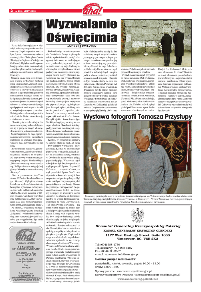 2 nr 215 - LUTY 2015 Po raz któryś tam oglądam w telewizji, zaliczany do gatunku mockumentary (zlepek wyrazów mock – kpić, kpina, i documentary – dokumentalny), film Christophera Guesta Waiting for Guffman (Czekając na Guffmana). Oglądam ten film po raz kolejny, żeby – taką mam nadzieję – uwolnić głowę od ciężkich myśli, odprężyć się, mieć szanse na lżejszej treści sny... Okazuje się, że nic z tego; tym razem Waiting for Guffman nie bawi mnie jak przedtem. Zamiast śmiechu pojawia się myśl, że ta filmowa opowieść o fikcyjnym miasteczku Blaine, o jego mało inteligentnych mieszkańcach, z których kilkoro stało się niespodziewanie aktorami, pełnymi entuzjazmu, ale pozbawionymi talentu – o zachwycaniu się żenującymi popisami scenicznymi – że otóż to wszystko jest okropnie prawdziwe. Każdego dnia ocieram się o takich mieszkańców Blaine, nierzadko staję z nimi twarzą w twarz. Charakterystyczne dla nich jest dążenie, wewnętrzny nakaz, do łączenia się w grupy, w których ich umysłowa mizeria jest mniej widoczna. Są niebezpieczni, bo mają ogromną przewagę liczebną i są idealnym materiałem do urabiania przez przywódców mas. Indywidualnie się nie liczą. Zwolennikom masówek, grupowym patriotom, zadedykować można (chociaż i tak nic to im nie pomoże) trzywersowy wiersz romantycznego poety Lucjana Siemieńskiego: „Nie wiem co znaczy rozum narodowy,/ Jeśli go nie ma w mózgu jednej głowy./ Ni trochę w rozum nie wierzę zbiorowy.” Pisze w tym numerze „Aha!” na stronie 16 Paulina Skrodzka (Wracając z Grodna): „Ogłupione, niewykształcone społeczeństwo staje się bezmyślnie wykonującą rozkazy masą. Nie widzi delikatnych niuansów władzy. Nie widzi kierunku, w którym zmierza.” Ale także wszystkie inne publikowane w „Aha!” rozważania są de facto poszukiwaniem ratunku przed „mieszkańcami Blaine”. Na stronie 23 wiadomość od Redaktora Naczelnego gazety literackiej „Migotania” – wiadomość, która według mnie koresponduje w jakiś sposób z tym wstępniakiem. Być może wzbudzi ona w kimś refleksję. Published in Canada by THE AHA! SOCIETY FOR CULTURAL DEVELOPMENT #316-3640 Victoria Drive Vancouver, BC, V5N 5P1 tel. 604-251-1485 e-mail: [email protected] Editor Andrzej Jar The Aha! accepts no responsibility for, and will not necessarily respond to, unsolicited manuscripts and art. Wyzwalanie Oświęcimia ANDRZEJ KWIATEK Siedemdziesiąta rocznica wyzwolenia Oświęcimia. Pamięć kopie wyobraźnię, wyobraźnia miele pamięć, chce ogarnąć i nie może, im bardziej ogarnia, tym bardziej ogarnąć nie jest w stanie, snem się staje skłębionym, rhizomą bez początku i końca. Nie ma podpory, nie ma zaczepu, nie ma przyczepu, nie ma mowy, zdania nie ma, wyrazu nie ma. Bez wyrazu. Rozrasta się, puchnie, rozlewa, posoką chlusta na wszystkie strony. Stajesz z boku siłą woli, aby wysnuć i nanizać, zatrzymać utrwalić, przechować, wyjaśnić, zrozumieć, uporządkować i na koniec – albo początek – zdać sobie sprawę ze zdawania sprawy, i na powrót bezwolny salta wywijasz, rozpływasz się, spływasz, kurczysz się, i eksplodujesz. Szczegół, epizod, drobiazg, zdarzenie, „prozaiczne”, „trywialne, „nieistotne” – zwiastuny, zwieńczenia – początki wzniosłe i końce żałosne. Początki nijakie i końce imponujące. Skoki i podrygi jedynie stały się naszym udziałem. Skoczkami, jesteśmy, podrygiwaczami nieustającymi – myślenia, dumania, wyobrażania, odczuwania, wyrażania, komunikowania, oznajmiania, uzasadniania, oceniania. Kiedyś. W gościnie u Niemców w Berlinie. Matki nie mieli. Ich ojciec – były żołnierz Wermachtu – miły, gościnny. Kiedyś. W czterdziestym pierwszym, w styczniu, dziadek żony, lat trzydzieści cztery, otrzymał w Oświęcimiu numer osiem tysięcy pięćdziesiąt pięć. W czerwcu tegoż roku już nie żył. Dopiero po nim zaczęli przywozić Żydów. Przywozić? Eufemizm… przywlekać – tak, zaczęli przywlekać Żydów. Smród rzeźni poleciał w kosmos i chyba już dawno przekroczył granice galaktyki. Być może został przechwycony przez jakąś pozagalaktyczną cywilizację. Co ona, ta cywilizacja, z nim pocznie? Co pocznie? Nie wiemy do dziś i nie dowiemy się nigdy, co kryje się w słowie „umarł”. I nie chcemy się dowiedzieć. Kiedyś. Po wojnie. Rodzina żony zamieszkała na Placu Grzybowskim. Tuż obok Próżna. Nowolipki – nie mniej ważne miejsce na mapie. Tam z kolei po wojnie zamieszkała moja ciotka. Z mapy walk w gettcie wynika, że w miejscu dzisiejszego osiedla ciotki toczyły się jedne z cięższych. A Próżna? – szkoda gadać – konanie na konaniu. Pamiętam słoneczne i ciche Nowolipki w latach sześćdziesiątych i grę w piłkę z chłopakami na placyku – tym placyku. Dopiero dziś czuję wyraźnie słodki zapach krwi, wówczas wydawało mi się, że wdycham zapach kwitnącej Warszawy. W domu, w którym mieszkamy (dzielnica Rembertów) – domu przedwojennego właściciela, podkablowanego przez rodaka-sąsiada, uwięzionego na Pawiaku (październik 1940 r.) za słuchanie radia (Londyn?), wywiezionego wraz z bratem do Oświęcimia (7 I 1941 r.), napiętnowanego numerem osiem tysięcy pięćdziesiąt pięć – ulokował się sztab niemiecki w czasie okupacji. Kiedyś. Sztab niemiecki sobie był, a gospodarza domu od czerwca czterdziestego pierwszego już nie było. Niektóre meble zostały do dziś – siadamy na tych samych krzesłach, jadamy przy tym samym stole pod tym samym żyrandolem – on przed wojną, oni w czasie wojny, my po wojnie. Niemcy kłamali, że mają Polaków za podludzi, a Żydów za robactwo, spali przecież w łóżkach jednych i drugich, jedli w ich naczyniach, używali ich sztućców, nosili ich palta i obrączki. Ja bym za żadne skarby nie nosił ciuchów świni. Kłamali. Poza tym byli debilami. Jak mogli nie wiedzieć, że dwadzieścia parę lat późn