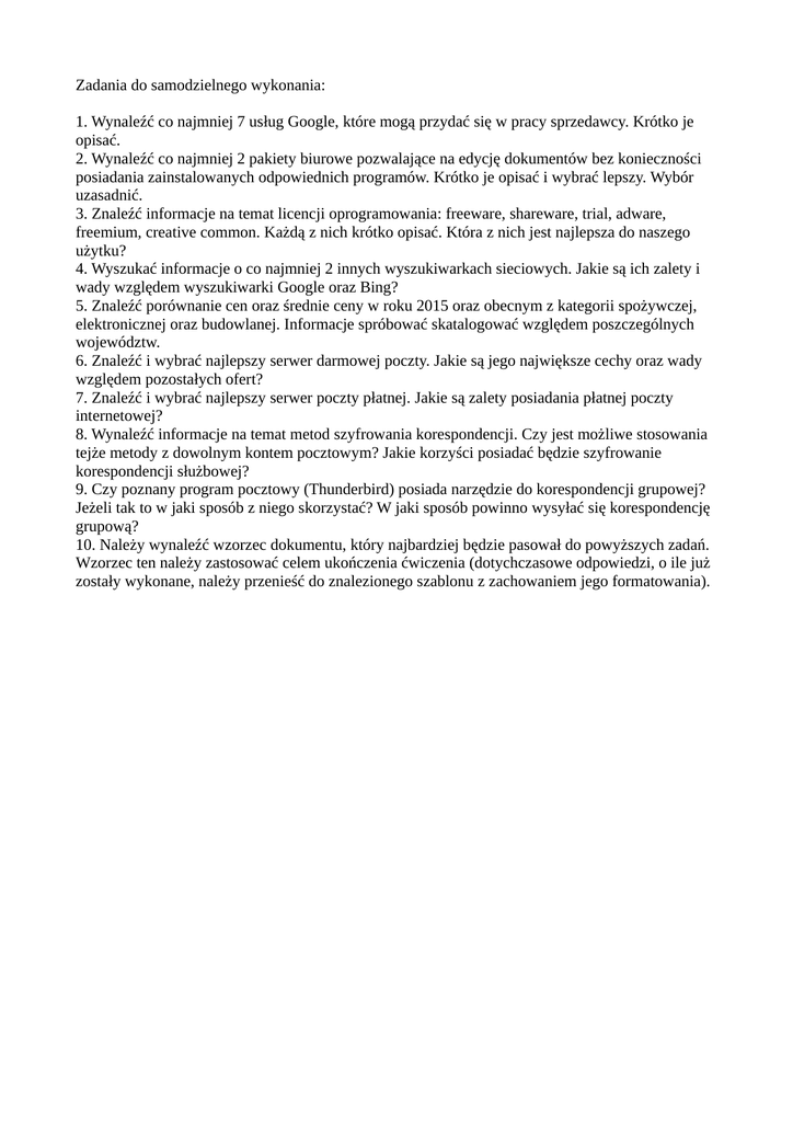 Zadania do samodzielnego wykonania: 1. Wynaleźć co najmniej 7 usług Google, które mogą przydać się w pracy sprzedawcy. Krótko je opisać. 2. Wynaleźć co najmniej 2 pakiety biurowe pozwalające na edycję dokumentów bez konieczności posiadania zainstalowanych odpowiednich programów. Krótko je opisać i wybrać lepszy. Wybór uzasadnić. 3. Znaleźć informacje na temat licencji oprogramowania: freeware, shareware, trial, adware, freemium, creative common. Każdą z nich krótko opisać. Która z nich jest najlepsza do naszego użytku? 4. Wyszukać informacje o co najmniej 2 innych wyszukiwarkach sieciowych. Jakie są ich zalety i wady względem wyszukiwarki Google oraz Bing? 5. Znaleźć porównanie cen oraz średnie ceny w roku 2015 oraz obecnym z kategorii spożywczej, elektronicznej oraz budowlanej. Informacje spróbować skatalogować względem poszczególnych województw. 6. Znaleźć i wybrać najlepszy serwer darmowej poczty. Jakie są jego największe cechy oraz wady względem pozostałych ofert? 7. Znaleźć i wybrać najlepszy serwer poczty płatnej. Jakie są zalety posiadania płatnej poczty internetowej? 8. Wynaleźć informacje na temat metod szyfrowania korespondencji. Czy jest możliwe stosowania tejże metody z dowolnym kontem pocztowym? Jakie korzyści posiadać będzie szyfrowanie korespondencji służbowej? 9. Czy poznany program pocztowy (Thunderbird) posiada narzędzie do korespondencji grupowej? Jeżeli tak to w jaki sposób z niego skorzystać? W jaki sposób powinno wysyłać się korespondencję grupową? 10. Należy wynaleźć wzorzec dokumentu, który najbardziej będzie pasował do powyższych zadań. Wzorzec ten należy zastosować celem ukończenia ćwiczenia (dotychczasowe odpowiedzi, o ile już zostały wykonane, należy przenieść do znalezionego szablonu z zachowaniem jego formatowania).