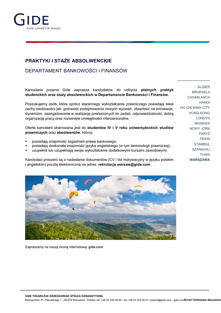PRAKTYKI I STAŻE ABSOLWENCKIE DEPARTAMENT BANKOWOŚCI I FINANSÓW Kancelaria prawna Gide zaprasza kandydatów do odbycia płatnych praktyk studenckich oraz staży absolwenckich w Departamencie Bankowości i Finansów. Poszukujemy osób, które oprócz starannego wykształcenia prawniczego posiadają takie cechy osobowości jak: gotowość podejmowania nowych wyzwań, otwartość na innowacje, dynamizm, zaangażowanie w realizację powierzonych im zadań, odpowiedzialność, dobrą organizację pracy oraz rozwinięte umiejętności interpersonalne. ALGIER BRUKSELA CASABLANCA HANOI HO CHI MINH CITY HONG-KONG LONDYN MOSKWA Oferta kancelarii skierowana jest do studentów IV i V roku uniwersyteckich studiów prawniczych oraz absolwentów, którzy: posiadają znajomość zagadnień prawa bankowego, posiadają doskonałą znajomość języka angielskiego (w tym terminologii prawniczej), uzupełnili lub uzupełniają swoje wykształcenie dodatkowymi kursami zawodowymi. NOWY JORK PARYŻ PEKIN STAMBUŁ SZANGHAJ TUNIS Kandydaci proszeni są o nadesłanie dokumentów (CV i list motywacyjny w języku polskim i angielskim) pocztą elektroniczną na adres: [email protected] WARSZAWA Zapraszamy na naszą stronę internetową: gide.com GIDE TOKARCZUK GRZEŚKOWIAK SPÓŁKA KOMANDYTOWA Metropolitan, Pl. Piłsudskiego 1 - 00-078 Warszawa - Polska | tel. +48 22 344 00 00 - fax +48 22 344 00 01 | [email protected] - gide.comError! Unknown document
