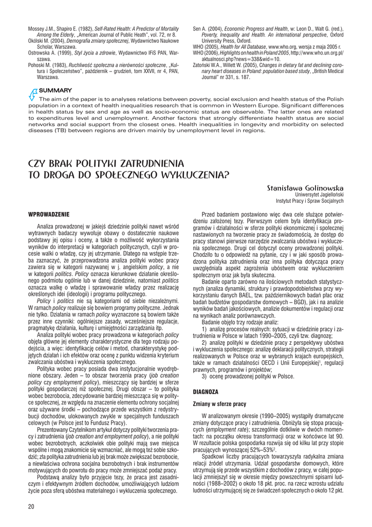 Mossey J.M., Shapiro E. (1982), Self-Rated Health: A Predictor of Mortality Among the Elderly, „American Journal of Public Heath”, vol. 72, nr 8. Okólski M. (2004), Demografia zmiany społecznej, Wydawnictwo Naukowe Scholar, Warszawa. Ostrowska A. (1999), Styl życia a zdrowie, Wydawnictwo IFiS PAN, Warszawa. Pohoski M. (1983), Ruchliwość społeczna a nierówności społeczne, „Kultura i Społeczeństwo”, październik – grudzień, tom XXVII, nr 4, PAN, Warszawa. Sen A. (2004), Economic Progress and Health, w: Leon D., Walt G. (red.), Poverty, Inequality and Health. An international perspective, Oxford University Press, Oxford. WHO (2005), Health for All Database, www.who.org, wersja z maja 2005 r. WHO (2006), Highlights on health in Poland 2005, http://www.who.un.org.pl/ aktualnosci.php?news=338&wid=10. Zatoński W.A., Willett W. (2005), Changes in dietary fat and declining coronary heart diseases in Poland: population based study, „British Medical Journal” nr 331, s. 187. SUMMARY The aim of the paper is to analyses relations between poverty, social exclusion and health status of the Polish population in a context of health inequalities research that is common in Western Europe. Significant differences in health status by sex and age as well as socio-economic status are observable. The latter ones are related to expenditures level and unemployment. Another factors that strongly differentiate health status are social networks and social support from the closest ones. Health inequalities in longevity and morbidity on selected diseases (TB) between regions are driven mainly by unemployment level in regions. CZY BRAK POLITYKI ZATRUDNIENIA TO DROGA DO SPOŁECZNEGO WYKLUCZENIA? Stanisława Golinowska Uniwersytet Jagielloński Instytut Pracy i Spraw Socjalnych WPROWADZENIE Analiza prowadzonej w jakiejś dziedzinie polityki nawet wśród wytrawnych badaczy wywołuje obawy o dostatecznie naukowe podstawy jej opisu i oceny, a także o możliwość wykorzystania wyników do interpretacji w kategoriach politycznych, czyli w procesie walki o władzę, czy jej utrzymanie. Dlatego na wstępie trzeba zaznaczyć, że przeprowadzona analiza polityki wobec pracy zawiera się w kategorii nazywanej w j. angielskim policy, a nie w kategorii politics. Policy oznacza kierunkowe działanie określonego podmiotu ogólnie lub w danej dziedzinie, natomiast politics oznacza walkę o władzę i sprawowanie władzy przez realizację określonych idei (ideologii) i programu politycznego. Policy i politics nie są kategoriami od siebie niezależnymi. W ramach policy realizuje się bowiem programy polityczne. Jednak nie tylko. Działania w ramach policy wyznaczone są bowiem także przez inne czynniki: ogólniejsze zasady, wcześniejsze regulacje, pragmatykę działania, kulturę i umiejętności zarządzania itp. Analiza polityki wobec pracy prowadzona w kategoriach policy objęła główne jej elementy charakterystyczne dla tego rodzaju podejścia, a więc: identyfikację celów i metod, charakterystykę podjętych działań i ich efektów oraz ocenę z punktu widzenia kryterium zwalczania ubóstwa i wykluczenia społecznego. Polityka wobec pracy posiada dwa instytucjonalnie wyodrębnione obszary. Jeden – to obszar tworzenia pracy (job creation policy czy employment policy), mieszczący się bardziej w sferze polityki gospodarczej niż społecznej. Drugi obszar – to polityka wobec bezrobocia, zdecydowanie bardziej mieszcząca się w polityce społecznej, ze względu na znaczenie elementu ochrony socjalnej oraz używane środki – pochodzące przede wszystkim z redystrybucji dochodów, ulokowanych zwykle w specjalnych funduszach celowych (w Polsce jest to Fundusz Pracy). Prezentowany Czytelnikom artykuł dotyczy polityki tworzenia pracy i zatrudnienia (job creation and employment policy), a nie polityki wobec bezrobotnych, aczkolwiek obie polityki mają swe miejsca wspólne i mogą znakomicie się wzmacniać, ale mogą też sobie szkodzić; zła polityka zatrudnienia lub jej brak może zwiększać bezrobocie, a niewłaściwa ochrona socjalna bezrobotnych i brak instrumentów motywujących do powrotu do pracy może zmniejszać podaż pracy. Podstawą analizy było przyjęcie tezy, że praca jest zasadniczym i efektywnym źródłem dochodów, umożliwiających ludziom życie poza sferą ubóstwa materialnego i wykluczenia społecznego. 20 Przed badaniem postawiono więc dwa cele służące potwierdzeniu założonej tezy. Pierwszym celem była identyfikacja programów i działalności w sferze polityki ekonomicznej i społecznej nastawionych na tworzenie pracy ze świadomością, że dostęp do pracy stanowi pierwsze narzędzie zwalczania ubóstwa i wykluczenia społecznego. Drugi cel dotyczył oceny prowadzonej polityki. Chodziło tu o odpowiedź na pytanie, czy i w jaki sposób prowadzona polityka zatrudnienia oraz inna polityka dotycząca pracy uwzględniała aspekt zagrożenia ubóstwem oraz wykluczeniem społecznym oraz jak była skuteczna. Badanie oparto zarówno na ilościowych metodach statystycznych (analiza dynamiki, struktury i prawdopodobieństwa przy wykorzystaniu danych BAEL, tzw. październikowych badań płac oraz badań budżetów gospodarstw domowych – BGD), jak i na analizie wyników badań jakościowych, analizie dokumentów i regulacji oraz na wynikach analiz porównawczych. Badanie objęło trzy rodzaje analiz: 1) analizę procesów realnych: sytuacji w dziedzinie pracy i zatrudnienia w Polsce w latach 1990–2005, czyli tzw. diagnozę; 2) analizę polityki w dziedzinie pracy z perspektywy ubóstwa i wykluczenia społecznego: analizę deklaracji politycznych, strategii realizowanych w Polsce oraz w wybranych krajach europejskich, także w ramach działalności OECD i Unii Europejskiej1, regulacji prawnych, programów i projektów; 3) ocenę prowadzonej polityki w Polsce. DIAGNOZA Zmiany w sferze pracy W analizowanym okresie (1990–2005) wystąpiły dramatyczne zmiany dotycząc