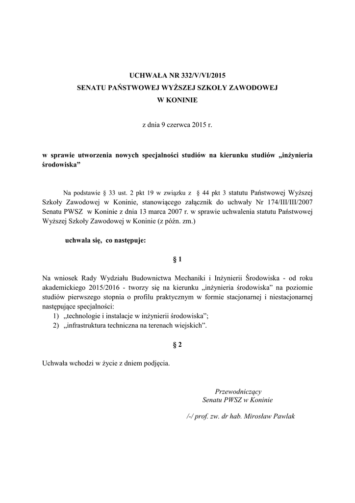 UCHWAŁA NR 332/V/VI/2015 SENATU PAŃSTWOWEJ WYŻSZEJ SZKOŁY ZAWODOWEJ W KONINIE z dnia 9 czerwca 2015 r. w sprawie utworzenia nowych specjalności studiów na kierunku studiów „inżynieria środowiska” Na podstawie § 33 ust. 2 pkt 19 w związku z § 44 pkt 3 statutu Państwowej Wyższej Szkoły Zawodowej w Koninie, stanowiącego załącznik do uchwały Nr 174/III/III/2007 Senatu PWSZ w Koninie z dnia 13 marca 2007 r. w sprawie uchwalenia statutu Państwowej Wyższej Szkoły Zawodowej w Koninie (z późn. zm.) uchwala się, co następuje: §1 Na wniosek Rady Wydziału Budownictwa Mechaniki i Inżynierii Środowiska - od roku akademickiego 2015/2016 - tworzy się na kierunku „inżynieria środowiska” na poziomie studiów pierwszego stopnia o profilu praktycznym w formie stacjonarnej i niestacjonarnej następujące specjalności: 1) „technologie i instalacje w inżynierii środowiska”; 2) „infrastruktura techniczna na terenach wiejskich”. §2 Uchwała wchodzi w życie z dniem podjęcia. Przewodniczący Senatu PWSZ w Koninie /-/ prof. zw. dr hab. Mirosław Pawlak