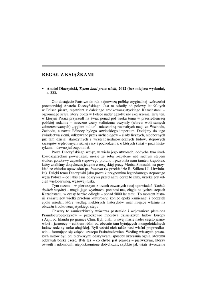 REGAŁ Z KSIĄŻKAMI • Anatol Diaczyński, Tętent koni przez wieki, 2012 (bez miejsca wydania), s. 223. Oto dostajecie Państwo do rąk najnowszą próbkę oryginalnej twórczości prozatorskiej Anatola Diaczyńskiego. Jest to osiadły od połowy lat 90-tych w Polsce pisarz, repatriant z dalekiego środkowoazjatyckiego Kazachstanu – ogromnego kraju, który budzi w Polsce nader egzotyczne skojarzenia. Kraj ten, w którym Pisarz przyszedł na świat ponad pół wieku temu w przesiedleńczej polskiej rodzinie – mroczne czasy stalinizmu uczyniły (wbrew woli samych zainteresowanych) „tyglem kultur”, mieszaniną rozmaitych nacji ze Wschodu, Zachodu, a nawet Północy byłego sowieckiego imperium. Dodajmy do tego świadectwa ziemi, odkrywane przez archeologów – ślady licznych, nieobecnych już tam dzisiaj starożytnych i wczesnośredniowiecznych ludów, stepowych szczepów wędrownych różnej rasy i pochodzenia, o których świat – poza historykami – dawno już zapomniał. Proza Diaczyńskiego wciąż, w wielu jego utworach, oddycha tym środkowoazjatyckim powietrzem, niesie ze sobą rozpalone nad suchym stepem słońce, gorzkawy zapach stepowego piołunu i przybliża nam tamten krajobraz, który znaliśmy dotychczas jedynie z rosyjskiej prozy Morisa Simaszki, na przykład ze zbiorku opowiadań pt. Jemszan (w przekładzie R. Stillera i J. Litwiniuka). Dzięki temu Diaczyński jako prozaik przypomina legendarnego stepowego węża Połoza – co jakiś czas odkrywa przed nami coraz to inny, urzekający odcień wielobarwnej, wężowej łuski. Tym razem – w pierwszym z trzech zawartych tutaj opowiadań (Ludzie dzikich stepów) – magia jego wyobraźni przenosi nas, ciągle na tychże stepach Kazachstanu, w czasy bardzo odległe – ponad 5000 lat temu. To moment historii zwiastujący wielki przełom kulturowy: koniec epoki kamiennej i początek epoki miedzi, który według niektórych historyków miał miejsce właśnie na obrzeżu środkowoazjatyckiego stepu. Obszary te zamieszkiwały wówczas pasterskie i wojownicze plemiona Praindoeuropejczyków – przodkowie mnóstwa dzisiejszych ludów Europy i Azji, od Irlandii po granice Chin. Byli biali, w swej masie nader często jasnowłosi i jasnoocy – całkiem różni od obecnie tam bytujących mongoloidalnych ludów rodziny turko-ałtajskiej. Byli wśród nich także nasi właśni praprzodkowie – formujące się zalążki szczepu Prabałtosłowian. Według własnych prastarych mitów byli oni pierwszymi odkrywcami sposobu krzesania ognia, któremu oddawali boską cześć. Byli też – co chyba jest prawdą – pierwszymi, którzy oswoili i udomowili nieposkromione dotychczas, szybkie jak wiatr stworzenie 80 REGAŁ Z KSIĄŻKAMI stepowe – konia. Następnie zaś – wziąwszy pomysł wozu od bardziej południowych ludów – udoskonalili koło przez dodanie szprych i stworzyli lekki, niezwykle szybki rydwan bojowy, zaprzężony w to przez nich samych udomowione zwierzę – konia. Na tych rydwanach dokonali inwazji olbrzymich obszarów Eurazji, rozbili w pył prastare cywilizacje Indii, Mezopotamii, Anatolii i Morza Egejskiego – i stworzyli w ten sposób podwaliny całej, obecnie ogromnej, rodziny narodów białej rasy Starego Świata. W 1983 roku młody wówczas Autor uczestniczył w ekspedycji archeologicznej na stepach obwodu kokszetauskiego, co rozbudziło w nim fascynację historią, a zwłaszcza stuleciami zamierzchłej, legendarnej przeszłości. Fascynacja ta pozostała mu na całe życie, do dziś. Własnymi oczyma oglądał ślady dawnego obozu, którego mieszkańcy – ciągle jeszcze polujący na dzikie konie, by zjadać ich mięso przechodzili stopniowo do prób ich oswojenia, udomowienia i świadomej hodowli. Wszystko to – spowite w mity, szamańskie czary, dawne wierzenia, prastary stepowy obyczaj oplecione wątkiem romansowym – znalazło wyraz w opowiadaniu Ludzie dzikich stepów. Drugie opowiadanie pt. Idę oto w delegację pojawia się po tym pierwszym prawem kontrastu. Oto mamy przed sobą te same obszary, ale po upływie około 5000 lat, z okresu całkiem dla nas niedawnego, sprzed kilkudziesięciu lat, na które to czasy przypadły dzieciństwo i młodość Autora. Zawiera ono satyryczny i, jak by się zdawało, banalny wątek fabularny o młodzieńcu pragnącym dostać wolne na ślub siostry, którego biurokraci zmuszają do udania się w delegacyjną podróż, w dużej części odbywaną pieszo. Inny wątek to potraktowana z humorem „pomoc” zakładu dla stepowego sowchozu (odpowiednika naszego peerelowskiego PGR). Wdziera się tu jednak również, jako odniesienie do nostalgicznie przeżywanej przeszłości – wspomnienie starego Kazacha o dawnym, czystym i dziewiczym stepie i nieodłącznych odeń pięknych stworzeniach – koniach. To też już kawałek historii, obrazek świata, którego już nie ma (co miłośnikom prozy Diaczyńskiego przypomina tytuł jednej z jego dawniejszych książek). Wiele się tam zmieniło, w miejsce sowieckiej republiki Kazachstan mamy teraz Kazachstan w pełni niepodległy, rządzący się u siebie samodzielnie. Wiele stepów zaorano, zanikają tak liczne niegdyś konie, a także wiele ze stepowego obyczaju; pojawiły się nowe budowle, nowe środki lokomocji. Ale jednak ciągle żal czegoś, co odchodzi w niebyt, wypierane przez cywilizację XXI wieku – i stepu, i koni. Ostatnie opowiadanie przenosi nas w początkowe lata XVII stulecia, do młodego, liczącego wówczas dopiero 37 lat polsko-litewskiego państwa związkowego. Była to Rzeczpospolita Obojga Narodów, utworzona na mocy Unii Lubelskiej w 1569 roku z Wielkiego Księstwa Litewskiego i Korony Królestwa Polskiego (przedtem połączonych tylko osobą króla). Pośmiertny już owoc wieloletnich, skomplikowanych zabiegów ostatniego Jagiellona, króla Zygmunta Augusta – w tamtych czasach fenomen równości stron, nie wymuszony podbojem ani inną formą siły ze strony narodu polskiego. Uzasadnio