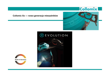 Collomix Xo --- nowa generacja mieszalników Collomix Xo --- nowa generacja mieszalników • Dane techniczne Xo 1 • Moc: 1010 Wat • Napięcie zasilania: 230-240Volt • Częstotliwość: 50/60 Hz • Obroty - 925 min-1 • Obroty pod obciążeniem - 680 min-1 • Średnica mieszadła : 120 mm • Waga (bez mieszadła): 4,2 kg • Emisja hałasu LpA [dB(A)] 82 dB(a) • Emisja hałasu LWA [dB(A)] 93 dB(A) • CX- odpowiednik: CX 100 Collomix Xo --- nowa generacja mieszalników Xo- konstrukcja i design • Mieszalniki Xo mają bardzo nowoczesny design, przypominający kształtem kierownicę formuły 1 • Design jest futurystyczny, prezentuje profesjonalizm, prestiż oraz jakość „Made in Germany” •Dzięki zwiększeniu wysokości umieszczenia rękojeści o ok. 5 cm Collomix ułatwia wygodną pracę również dla wysokich osób • Wyeliminowanie szczelin i dopracowanie szczegółów obudowy zwiększyło odporność mieszalników na zabrudzenia oraz znacznie zredukowało poziom hałasu • Masywne stalowe rękojeści, zabezpieczenia na końcach rękojeści, obudowa silnika i przekładni z tworzywa sztucznego wzmacnianego włóknem szklanym zapewnia niezwykłą trwałość i odporność na uszkodzenia Collomix Xo --- nowa generacja mieszalników Xo- konstrukcja i design Collomix Xo --- nowa generacja mieszalników Xo- konstrukcja i design Collomix Xo --- nowa generacja mieszalników Xo- konstrukcja i design Collomix Xo --- nowa generacja mieszalników Xo- konstrukcja i design Collomix Xo --- nowa generacja mieszalników Xo- solidne wykonanie • Przekładnia jest idealnie spasowana, zębatki są hartowane (63 HRC wg skali twardości Rockwella – jeden z najwyższych poziomów twardości stali) , co powoduje znaczne zwiększenie żywotności (liczonej w godzinach pracy) i zarazem obniżenie emisji hałasu (z 85 db do 82 db) • Wysokiej jakości silnik i elektronika gwarantują stałe obroty niezależnie od obciążenia nawet materiałami o najwyższej lepkości • Szczotki węglowe są wyższej jakości niż w serii CX, są większe i szersze. Ponadto ich równa powierzchnia oraz centralne umieszczenie silnika gwarantuje żywotność ok. 150 godzin (w przypadku serii CX żywotność szczotek wynosiła ok. 70 godzin) • Silnik umieszczony jest w obudowie o konstrukcji dwuściennej (PA30 włókno szklane), co daje dodatkową ochronę przed uszkodzeniem • Każdy mieszalnik Xo ma poziom wibracji HAV poniżej 2,5 m/s², co oznacza że maszyny te mogą być używane bez ograniczeń czasowych w ciągu dnia pracy Collomix Xo --- nowa generacja mieszalników Xo- solidne wykonanie Collomix Xo --- nowa generacja mieszalników Xo- perfekcja szczegółów • W serii Xo przewód zasilający zamontowany jest pionowo, przez co nie jest narażony na złamanie czy uszkodzenie w czasie odkładania na bok • Położenie wentylatora chłodzącego silnik i otworów wentylacyjnych uniemożliwiają przedostanie się z góry zanieczyszczeń oraz kropli deszczu • Włącznik oraz spust zabezpieczający są umieszczone w odpowiedniej pozycji tak, aby były wygodne w użyciu przez każdą dłoń • Zastosowano wyższej jakości spust, który dodatkowo dzięki innemu układowi pozwala na dokładne wybranie prędkości obrotowej • Smar użyty w przekładni jest sklasyfikowany jako substancja organiczna, przesącza się pomiędzy wszystkimi elementami metalowymi w przekładni smarując je i ułatwiając pracę • Mieszadło może być łatwo transportowane poprzez umieszczenie w sześciokątnym otworze w uchwycie mieszalnika Collomix Xo --- nowa generacja mieszalników Xo- perfekcja szczegółów Collomix Xo --- nowa generacja mieszalników Xo- perfekcja szczegółów Collomix Xo --- nowa generacja mieszalników Xo- perfekcja szczegółów Collomix Xo --- nowa generacja mieszalników Xo- perfekcja szczegółów Collomix Xo --- nowa generacja mieszalników Xo- maksymalna kontrola jakości • Każdy mieszalnik serii Xo opuszczający fabrykę Collomix jest testowany przez przynajmniej 6 minut • Podczas tych 6 minut sprawdzana jest zarówno elektronika jak i elementy mechaniczne. Zmniejsza to znacznie ilość reklamacji oraz gwarantuje najwyższą jakość Collomix Xo --- nowa generacja mieszalników Xo- maksymalna kontrola jakości Collomix Xo --- nowa generacja mieszalników Xo- porównanie z serią CX • kontrola jakości – każdy Xo jest testowany przez min. 6 minut • nowy design, bardziej wytrzymała konstrukcja (zwłaszcza rękojeści) • umieszczenie rękojeści 5 cm wyżej • oddalenie od siebie rękojeści – łatwiejsze sterowanie, wygodniejsza praca • zwiększenie wymiarów i żywotności szczotek węglowych z 70 do 150 godzin • zmniejszenie emisji hałasu z 85 do 82 dB • zmniejszenie/wyeliminowanie szczelin – maszyna cicha i bardziej odporna na zabrudzenia • przewód zasilający w izolacji poliuretanowej ( odporność -35 ºC do +80 ºC) tylko Xo4 i Xo6 • inny kąt mocowania przewodu – nie narażony na uszkodzenie w czasie odkładania maszyny • łatwy demontaż rękojeści (3 śruby zamiast 10) • wygodniejszy spust • możliwość transportu mieszadła (HF) w maszynie