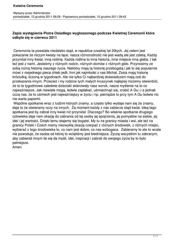 Kwietna Ceremonia Wpisany przez Administrator poniedziałek, 12 grudnia 2011 09:29 - Poprawiony poniedziałek, 12 grudnia 2011 09:42 Zapis wystąpienia Piotra Osiadłego wygłoszonego podczas Kwietnej Ceremonii która odbyła się w czerwcu 2011 Ceremonia ta powstała niedaleko stąd, w republice czeskiej lat 20tych. Jej celem jest pokazanie że niczym kwiaty na łące, nasza różnorodność nie jest wadą ale jest zaletą. Każdy przyniósł inny kwiat, inną roślinę. Każda roślina to inna historia, inne miejsce inna gleba. I tak też jest z nami. Jesteśmy z różnych rodzin, różnych domów z różnych gleb. Przynosimy ze sobą rożną historię naszego życia. Niektóry mają tą historię przebogatą i jak to się popularnie mówi z niejednego pieca chleb jedli. Inni jak najmłodsi z nas Michał, Zosia mają historię króciutką, liczoną w tygodniach. Ale nie tylko Ci najbardziej doświadczeni mają coś do przekazania innym. Przecież i my rodzice tych małych kruszynek najlepiej możemy stwierdzić, że to te tygodniowe zaledwie dzieciaki skierowały nasz wzrok, nasze myślenie na to co najważniejsze. Jak niewiele mogą, ledwie zapłakać, uśmiechnąć się, zrobić A Gu:-) a jednak uczą nas, że to uśmiech jest najważniejszy w życiu i np. pieniądze to przy tym A Gu ledwie nic nie warte papierki. Wspólne spotkanie wraz z ludźmi których znamy, a często tylko wydaje nam się że znamy, daje to że otwieramy oczy na innych. Za moment każdy z nas zabierze stąd kwiat. Ideą tego spotkania jest by zabrał inny kwiat niż przyniósł. Dlaczego? Bo właśnie spotkanie drugiego człowieka daje nam okazję do zabrania od tej osoby jej spojrzenia, jej pomysłów na siebie, jej idei i jej wartości. Dzięki temu stajemy się bogatsi. My tu na granicy miasta i wsi, ale też na granicy Polski i Czech mamy niezwykłą okazję czerpać z różnych środowisk, z różnych miejsc, wybierać z tego środowiska to, co nam jest dobre, co nas wzbogaca. Zabieramy to ale to wcale nie powoduje, że osoba od której to wzięliśmy jest biedniejsza. Życzę wszystkim tu zebranym, aby zabierali innym ile się da myśli, idei, inspiracji i zabrali do swojego życia by to było pełniejsze. Amen 1/1