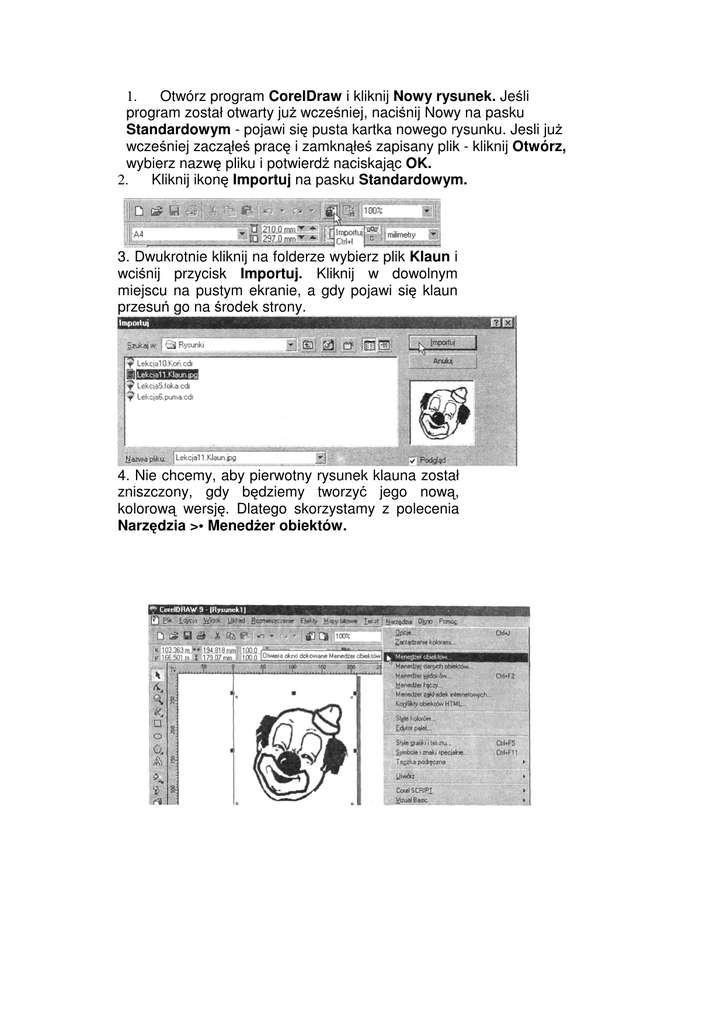 1. Otwórz program CorelDraw i kliknij Nowy rysunek. Je li program został otwarty ju wcze niej, naci nij Nowy na pasku Standardowym - pojawi si pusta kartka nowego rysunku. Jesli ju wcze niej zacz łe prac i zamkn łe zapisany plik - kliknij Otwórz, wybierz nazw pliku i potwierd naciskaj c OK. 2. Kliknij ikon Importuj na pasku Standardowym. 3. Dwukrotnie kliknij na folderze wybierz plik Klaun i wci nij przycisk Importuj. Kliknij w dowolnym miejscu na pustym ekranie, a gdy pojawi si klaun przesu go na rodek strony. 4. Nie chcemy, aby pierwotny rysunek klauna został zniszczony, gdy b dziemy tworzy jego now , kolorow wersj . Dlatego skorzystamy z polecenia Narz dzia >• Mened er obiektów. 5. Pojawiło si okno dialogowe Mened er obiektów. Kliknij na wizerunku ołówka w rz dzie Warstwa l, aby usun zaznaczenie warstwy aktywnej. Dzi ki temu, e rysunek klauna nie jest znajduje si ju na warstwie aktywnej nie ulegnie zmianie ani deformacji podczas dalszej pracy. 6. Kliknij ikon Nowa warstwa, aby powstała Warstwa 2 a nast pnie wci nij Enter. To warstwa, na której b dziesz od tej chwili pracował. Zamknij okno Mened era obiektów klikaj c znak X w prawym górnym rogu. 7. Spróbuj klikaj c zaznaczy który z elementów klauna - nie przynosi to adnych efektów. Oryginalny rysunek został zabezpieczony i b dzie słu ył jedynie jako wzorzec do dalszej pracy. 8. Korzystaj c z Powiekszenia powi ksz kapelusz klauna, obwodz c go kursu uko nie w dół. 9. Kliknij czarn strzałk w prawym dolnym rogu ikony Rysunek odr czny i, z wysuwanej palety, wybierz rodki artystyczne. 10. Kliknij ikon Kaligrafia na pasku Wła ciwo ci i ustal Szeroko narz dzia rodki artystyczne na 3,25 milimetra. 11. Przejed kursorem po linii, która znajduje si na górnej cz ci kapelusza - kliknij na jej górnym ko cu i po prostu przeci gnij w dół, a cała zostanie pokryta. Mo esz zmieni Szeroko narz dzia rodki artystyczne, je li to konieczne. 12. Wybierz kolor Zielony z Palety CorelDraw - linia zmieniła zabarwienie. 13. Za pomoc Powi kszenia obwied lini , aby uzyska jeszcze wi ksze jej przybli enie. 14. Korzystaj c ze Wska nika zaznacz lini i dopasuj j , aby pokrywała jak najdokładniej oryginalny rysunek. 15. Wybierz Powi kszenie i uzyskaj widok całej strony, klikaj c prawym przyciskiem myszy. 16. Skorzystamy teraz z Rysunku odr cznego. Aby jego ikona była ponownie osi galna, kliknij czarn strzałk w prawym dolnym rogu ikony rodki artystyczne i z rozsuwanej palety wybierz wła ciwe narz dzie. 17. Kliknij lewy kraniec linii, która symbolizuje załamanie ronda kapelusza, przesu kursor na prawo i kliknij przeciwległy jej koniec. Prawym przyciskiem myszy wybierz kolor Czerwony z Palety CorelDraw. 18. Wci nij Kontur i wybierz pozycj Kontur - 8 punktów. 19. Wybierz narz dzie Kształt, kliknij na rodku czerwonej linii, a nast pnie kliknij ikon Przekształ w krzyw . 20. Przeci gnij rodek linii w dół, a b dzie pokrywała si z kształtem linii wzorcowej. Wydłu lub skró ko ce linii, je li to konieczne. 21. Za pomoc Elipsy narysuj - trzymaj c cały czas wci ni ty klawisz Shift -okr g, którego rodek le y w rodku kapelusza a kraw dzie otaczaj cego obrys. 22. Kliknij prawym przyciskiem myszy na kraw dzi okr gu i - gdy zostanie rozwini te menu podr czne - wybierz pozycj Przekształ w krzywe. 23. Wybierz narz dzie Kontur i zaznacz na rozsuwanej palecie Kontur - 8 punktów (pkt 18.). 24. Prawym przyciskiem myszy wybierz kolor Czerwony z Palety CorelDraw, aby kontur uzyskał t barw . 25. Wci nij Kształt - zwró uwag , e na okr gu pojawiły si 4 w zły. Kliknij na w le w pobli u wierzchołka kapelusza. 26. Przeci gnij w zeł ponad obrys kapelusza. Mo esz wykorzysta uchwyty kontrolne, które pojawiły si po obu stronach w zła, aby precyzyjniej zmienia kształt okr gu i aby jak najbardziej przypominał on kształtem ten fragment kapelusza. 27. Klikaj i zmieniaj poło enie w zła po prawej i po lewej stronie. Mo esz upro ci prac klikaj c ikon Dodaj w zły umieszczon na pasku Wła ciwo ci - pojawi si nowe w zły. Im g ciej b d rozmieszczone, tym dokładniej mo esz zmienia kształt okr gu. 28. Wykorzystaj równie uchwyty nowo utworzonych w złów do dopasowania okr gu do wzoru kapelusza (pkt 26.). 29. Kliknij na linii krzywej pomi dzy w złami i wyginaj j dowolnie to równie pomaga osi gn wła ciwy kształt. 30. Za pomoc Wska nika zaznacz kapelusz i wybierz kolor ółty z Palety. Kapelusz stał si ółty, lecz znikła równie zielona linia biegn ca w pobli u jego wierzchołka. Postaramy si j ponownie wy wietli . Wydaj polecenie Rozmieszczenie >Kolejno >• Przesu ni ej. 31. Narysowana przez nas krótka linia jest nadal niewidoczna. Aby j znale wciskaj klawisz Tab na klawiaturze, a stwierdzisz, e została zaznaczona. Wydaj polecenie Rozmieszczenie >• Kolejno >• Przesu wy ej. Dzi ki temu linia powinna si ponownie pojawi na tle kapelusza. 32. Wybierz Powi kszenie i uzyskaj widok całej strony, klikaj c prawym przyciskiem myszy. 33. Za pomoc Wska nika usu zaznaczenie z klauna klikaj c na pustym miejscu na ekranie. Obwied kapelusz i wci nij CtrI+G, aby zgrupowa jego elementy. 34. Zapisz plik w wybranym folderze. Nadaj mu nazw Klaun Imi Nazwisko. 35. Wybierz Powi kszenie i obwied oko znajduj ce si z lewej strony. 36. Rozwi rozsuwan palet klikaj c czarn strzałk w prawym dolnym rogu ikony Rysunek odr czny i wybierz pozycj rodki artystyczne. 37. Kliknij ikon P dzel na pasku Wła ciwo ci, a nast pnie kliknij czarn , strzałk skierowan w dół, aby rozwin List poci gni p dzla. Zaznacz dwunast pozycj od góry, ustal Szeroko narz dzia rodki artystyczne na 2,5 milimetra i poci gnij po łukowatym obrysie oka. 38. Wybierz Powi kszenie i uzyskaj widok całej strony, klikaj c prawym przyciskiem myszy. Obwied drugie oko i powtórz czynno ci z punktów 36-37. 39. Wybierz Powi kszenie i obwied dolny fragment oka po lewej stronie. 40. Wybierz Elips i narysuj małe kółeczko na tle oryginalnej renicy. Naci nij prawym przyciskiem myszy na kole i, gdy poja