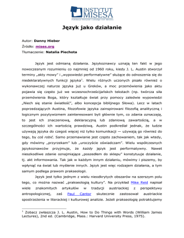 Język jako działanie Autor: Danny Hieber Źródło: mises.org Tłumaczenie: Natalia Piechota Język jest odmianą działania. Językoznawcy uznają ten fakt w jego nowoczesnym rozumieniu co najmniej od 1960 roku, kiedy J. L. Austin stworzył terminy „akty mowy” i „wypowiedzi performatywne” służące do odnoszenia się do niedeklaratywnych funkcji języka1. Wielu różnych uczonych pisało również o wykonawczej naturze języka już u Greków, a moc przemówienia jako aktu pojawia się często już we wczesnochrześcijańskch tekstach (np. twórcza siła przemówienia Boga, który kształtuje świat przy pomocy zaledwie wypowiedzi „Niech się stanie światłość”, albo koncepcja biblijnego Słowa). Lecz w latach poprzedzających Austina, filozofowie języka zainspirowani filozofią analityczną i logicznym pozytywizmem zainteresowani byli głównie tym, co zdania oznaczają, to jest ich znaczeniową, deklaracyjną lub zdaniową zawartością, a w szczególności ich wartością prawdziwą. Austin podkreślał jednak, że ludzie używają języka do czegoś więcej niż tylko komunikacji — używają go również do tego, by coś robić. Samo przemawianie jest często zachowaniem, tak jak wtedy, gdy mówimy „przyrzekam” lub „uroczyście oświadczam”. Wielu współczesnych językoznawców przyjmuje, że każdy język jest performatywny. Nawet nieszkodliwe zdanie oznajmiające „poszedłem do sklepu” konstytuuje działanie, tj. akt informowania. Tak jak w każdym innym działaniu, mówimy i piszemy, by wpłynąć na świat lub myślenie innych. Język jest więc rodzajem działania, a tym samym podlega prawom prakseologii. Język jest tylko jednym z wielu nieodkrytych obszarów na szerszym polu tego, co można nazwać „prakseologią kultury”. Na przykład Mike Reid napisał wiele znakomitych antropologicznej, artykułów zaś Paul w Cantor tradycji austriackiej skutecznie z zastosował perspektywy austriackie spostrzeżenia w literackiej i kulturowej analizie. Jeżeli prakseologię potraktujemy 1 Zobacz zwłaszcza J. L. Austin, How to Do Things with Words (William James Lectures), 2nd ed. (Cambridge, Mass.: Harvard University Press, 1975). jako naukę o ludzkim działaniu, to te dziedziny zasługują na swoje miejsce w nowej gałęzi w rothbardowskiej taksonomii dziedziny prakseologii2. Co więcej socjologia, antropologia i studia kulturowe są dziedzinami, które najbardziej potrzebują wglądu prakseologii i metodologicznego indywidualizmu, od kiedy ideologicznie stały się notorycznie kolektywistyczne. Mike Reid napisał raz do mnie, Z mojego doświadczenie wynika, że zagorzali kolektywiści opuścili obszar ekonomii, co oznacza, że nie możemy do nich tam dotrzeć. Zasłonili się antropologią, socjologią, literaturą, językoznawstwem i wszechobecną nauką o krzywdzie. Nasza praca może dotrzeć do górskich twierdz błędów i trzymać świecę prawdy u wejść do ich jaskiń. Wyjdźcie! Wyjdźcie! Tutaj jest prawda i nadzieja! Mimo to prakseologia języka jako pomysł nie zyskała uznania wśród austriaków. Jednym szczególnym wyjątkiem jest Ludwig von Mises, sam ojciec prakseologii. W Ludzkim Działaniu zwięźle ilustruje performatywną naturę języka: Działanie to stosowanie środków do osiągnięcia celów. Z reguły jeden z zastosowanych środków to praca działającego człowieka. Nie zawsze jednak tak jest. W wyjątkowych okolicznościach, słowo jest wszystkim, czego potrzeba. Ten, kto wydaje rozkazy lub zakazy, może postępować bez jakiegokolwiek nakładu pracy. Mówienie lub niemówienie, uśmiechanie się lub pozostanie poważnym, też może być działaniem3. Choć Mises pisze też obszernie na temat związku pomiędzy językiem i narodem, oraz o polityce języka, w swojej książce Nation, State, and Economy te komentarze są raczej komentarzami politycznymi niż spostrzeżeniami prakseologicznymi per se. 2 Murray N. Rothbard, “Praxeology: Reply to Mr. Schuller,” American Economic Review, Grudzień 1951, pp. 943-946. 3 Ludwig von Mises, Human Action: A Treatise on Economics. Scholar’s Edition / Kindle Edition (Auburn, Ala.: Ludwig von Mises Institute, 2008 [1949, 1998]), pp. 931-934. Wielu znaczących ekonomistów austriackich (Menger, Hayek, Mises, Rothbard) także wskazuje na język jako przykład spontanicznego porządku w społeczeństwie. W tej kwestii najbardziej znane są komentarze Hayeka: Podstawowe narzędzia cywilizacji — język, obyczaje, prawo i pieniądze — są wynikiem spontanicznego wzrostu, a nie projektu4. Jako rodzaj spontanicznego porządku, nie jest zaskoczeniem, że język jest poddany tym samym, centralnie planowanym zakłóceniom, co systemy gospodarcze, co zauważył Rothbard: System przymusowej państwowej edukacji stał się straszną bronią w rękach rządów, mającą na celu narzucenie pewnych języków i zniszczenie języków różnych grup językowych i narodowych wewnątrz ich kręgów. Był to szczególny problem w centralnej i wschodniej Europie. Rządzące państwo narzuca własny oficjalny język i kulturę ludziom innej kultury i języka, czego rezultatem był nieoszacowane krzywdy. Gdyby edukacja była dobrowolna, taki problem by nie powstał5. Te ustępy stanowią jedyny prawdziwy wkład w prakseologię języka w austriackiej tradycji, poza częstymi, lecz źle doinformowanymi stwierdzeniami, że język ulega rozkładowi i jest to objaw rozpadającego się społeczeństwa (dobrze znany przesąd w językoznawstwie). Mimo to znaczące spostrzeżenia można wyciągnąć nawet z pobieżnego zastosowania lekcji prakseologii. Weźmy najważniejszą zasadę ekonomii, na przykład koszt alternatywny. Albo używając słów Bastiata „to, czego nie widać”. Jak pokazuje to Mises, Ale działający człowiek wybiera, decyduje i próbuje dotrzeć do celu. Z dwóch rzeczy, których nie może posiadać jednocześnie, wybiera jedną i odpuszcza drugą. Dlatego działanie 4 Friedrich A. 