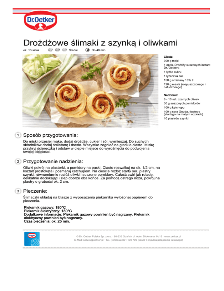 Drożdżowe ślimaki z szynką i oliwkami ok. 16 sztuk Średni Do 40 min. Ciasto: 300 g mąki 1 opak. Drożdży suszonych instant Dr. Oetkera 1 łyżka cukru 1 łyżeczka soli 150 g śmietany 18% tł. 120 g masła (rozpuszczonego i ostudzonego) Nadzienie: 8 - 10 szt. czarnych oliwek 30 g suszonych pomidorów 100 g ketchupu 100 g sera Gouda, tłustego (startego na małych oczkach) 10 plastrów szynki 1 Sposób przygotowania: Do miski przesiej mąkę, dodaj drożdże, cukier i sól, wymieszaj. Do suchych składników dodaj śmietanę i masło. Wszystko zagnieć na gładkie ciasto. Miskę przykryj ściereczką i odstaw w ciepłe miejsce do wyrośnięcia do podwojenia swojej objętości. 2 Przygotowanie nadzienia: Oliwki pokrój na plasterki, a pomidory na paski. Ciasto rozwałkuj na ok. 1/2 cm, na kształt prostokąta i posmaruj ketchupem. Na cieście rozłóż starty ser, plastry szynki, równomiernie rozłóż oliwki i suszone pomidory. Całość zwiń jak roladę, delikatnie dociskając i zlep dobrze oba końce. Za pomocą ostrego noża, pokrój na plastry o grubości ok. 2 cm. 3 Pieczenie: Ślimaczki układaj na blasze z wyposażenia piekarnika wyłożonej papierem do pieczenia. Piekarnik gazowy: 180°C Piekarnik elektryczny: 180°C Dodatkowe informacje: Piekarnik gazowy powinien być nagrzany. Piekarnik elektryczny powinien być nagrzany. Czas pieczenia: ok. 25 min. © Dr. Oetker Polska Sp. z o.o. · 80-339 Gdańsk ul. Adm. Dickmana 14/15 · www.oetker.pl E-Mail: [email protected] · Tel. (Infolinia) 801 100 700 (koszt 1 impulsu połączenia lokalnego)