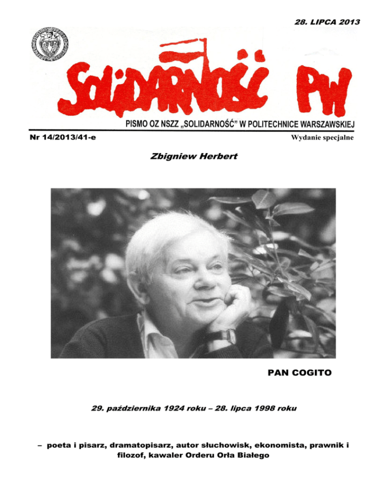 28. LIPCA 2013 Nr 14/2013/41-e Wydanie specjalne Zbigniew Herbert PAN COGITO 29. października 1924 roku – 28. lipca 1998 roku – poeta i pisarz, dramatopisarz, autor słuchowisk, ekonomista, prawnik i filozof, kawaler Orderu Orła Białego Przesłanie Pana Cogito Idź dokąd poszli tamci do ciemnego kresu po złote runo nicości twoją ostatnią nagrodę idź wyprostowany wśród tych co na kolanach wśród odwróconych plecami i obalonych w proch ocalałeś nie po to aby żyć masz mało czasu trzeba dać świadectwo bądź odważny gdy rozum zawodzi bądź odważny w ostatecznym rachunku jedynie to się liczy a Gniew twój bezsilny niech będzie jak morze ilekroć usłyszysz głos poniżonych i bitych niech nie opuszcza ciebie twoja siostra Pogarda dla szpiclów katów tchórzy - oni wygrają pójdą na twój pogrzeb i z ulgą rzucą grudę a kornik napisze twój uładzony życiorys i nie przebaczaj zaiste nie w twojej mocy przebaczać w imieniu tych których zdradzono o świcie strzeż się jednak dumy niepotrzebnej oglądaj w lustrze swą błazeńską twarz powtarzaj: zostałem powołany - czyż nie było lepszych strzeż się oschłości serca kochaj źródło zaranne ptaka o nieznanym imieniu dąb zimowy światło na murze splendor nieba one nie potrzebują twego ciepłego oddechu są po to aby mówić: nikt cię nie pocieszy czuwaj - kiedy światło na górach daje znak - wstań i idź dopóki krew obraca w piersi twoją ciemną gwiazdę powtarzaj stare zaklęcia ludzkości bajki i legendy bo tak zdobędziesz dobro którego nie zdobędziesz powtarzaj wielkie słowa powtarzaj je z uporem jak ci co szli przez pustynię i ginęli w piasku a nagrodzą cię za to tym co mają pod ręką chłostą śmiechu zabójstwem na śmietniku idź bo tylko tak będziesz przyjęty do grona zimnych czaszek do grona twoich przodków: Gilgamesza Hektora Rolanda obrońców królestwa bez kresu i miasta popiołów Bądź wierny Idź 2 Przesłanie Pana Cogito kończy tomik Pan Cogito i zgodnie z tytułem jest przesłaniem wieńczącym cały cykl. Wieńczy łączność z przedstawioną w innych wierszach ideą godnego postępowania w warunkach totalitarnego zniewolenia. Wierszem poprzedzającym Przesłanie Pana Cogito jest Pan Cogito o postawie wyprostowanej. Takie zestawienia nie są u Herberta przypadkowe. Poeta podkreśla wagę chwili, która wymaga wyboru. Właściwa jest tylko jedna droga – dochowanie wierności własnym ideałom, zachowanie postawy. Nie ma w wierszu oznak wahania. Przesłanie... napisane jest w trybie rozkazującym: idź, bądź odważny, strzeż się, czuwaj! Te słowa brzmią jak rozkaz dowódcy przed decydującą bitwą. Herbert wzywa do walki i ma świadomość nieuchronności starcia. Przesłanie Pana Cogito zawiera prawdy, które poeta uznał za najważniejsze dla tych, którzy nie chcą się poddać niedemokratycznej władzy. Nie przeciera jednak nowego szlaku – tą drogą poszło już wielu. Czeka na nich złote runo nicości. Wiersz kończy się opisem nagrody, która czeka idącego za radą Pana Cogito: a nagrodzą cię za to tym co mają pod ręką chłostą śmiechu zabójstwem na śmietniku Herbert nie chce oszukiwać odbiorcy wobec faktów. Jeśli chce iść za nim – musi wiedzieć, że jest to droga trudna. Jeśli nie chce – zostanie jednym z tych co na kolanach. Znaleźć się pośród nich oznacza być niezłomnym w służbie Prawdy. Słowa pożegnania: „Bądź wierny. Idź” brzmią jak wielkie zobowiązanie. Obyśmy mieli siłę je wypełnić. 3 Urodzony we Lwowie. Naukę rozpoczął w 1937 r w państwowym VIII Gimnazjum i Liceum im. Króla Kazimierza Wielkiego. Gdy w 1941 r. wojska niemieckie wkroczyły do Lwowa, kontynuował naukę na tajnych kompletach, a w 1944 r. zdał egzamin maturalny. W tym czasie ukończył tajną szkołę podchorążych i wstąpił w szeregi AK. Przez kilka miesięcy studiował polonistykę na Konspiracyjnym Uniwersytecie im. Jana Kazimierza, jednak w marcu 1944 r. musiał przerwać studia i razem z rodziną wyjechał do Krakowa. Tu rozpoczął studia ekonomiczne na Akademii Handlowej, prawo na UJ, a także uczestniczył w wykładach na wydziale filozofii oraz na ASP. W 1947 r. otrzymał tytuł magistra ekonomii, a dwa lata później na Uniwersytecie im. Mikołaja Kopernika w Toruniu – magistra prawa. W Toruniu poznał swojego mistrza Henryka Elzenberga, u którego studiował filozofię. . W 1948 r. został członkiem Związku Literatów Polskich, a w 1950 r. zadebiutował jako poeta na łamach tygodnika „Dziś i Jutro”. Również w tym roku przeprowadził się do Warszawy. 4 Pisał do gazet, współpracował z PAX-owskim tygodnikiem „Słowo Powszechne”, w którym drukował recenzje i felietony, a także z „Tygodnikiem Powszechnym”. Ale nie tylko pióro było źródłem utrzymania poety. Pracował w Inwalidzkiej Spółdzielni Emerytów Nauczycieli „Wspólna Sprawa” jako kalkulator i chronometrażysta (1953-54), starszy asystent w Centralnym Biurze Studiów i Projektów Przemysłu Torfowego (1954), a w latach 1956-57 jako dyrektor biura Zarządu Głównego Związku Kompozytorów Polskich. Leopold Tyrmand w Dzienniku z 1954 r. zanotował: „pogoda, z jaką Herbert znosi tę mordęgę po ukończeniu trzech fakultetów, jest wprost z wczesnochrześcijańskiej hagiografii”. W tym samym roku Instytut Wydawniczy PAX wydał 20 wierszy w almanachu poetyckim „...każdej chwili wybierać muszę”. Rok później poeta rozpoczął współpracę z miesięcznikiem „Twórczość”. W 1956 r. ukazał się Jego pierwszy tom poetycki „Struna światła”. Tym debiutem zdobył uznanie krytyków i zwierzchników w ZLP, dzięki czemu w 1958 roku otrzymał stypendium Związku i wyruszył w pierwszą podróż zagraniczną. Od tego czasu żył między Wschodem a Zachodem, starając się jednocześnie nie zamknąć sobie możliwości powrotu do Polski, ale też za wszelką cenę nie stracić szansy na kolejny wyjazd –