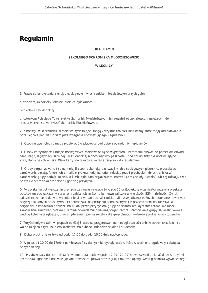 Szkolne Schronisko Młodzieżowe w Legnicy tanie noclegi hostel – Witamy! Regulamin REGULAMIN SZKOLNEGO SCHRONISKA MŁODZIEŻOWEGO W LEGNICY 1. Prawo do korzystania z miejsc noclegowych w schronisku młodzieżowym przysługuje: a)dzieciom, młodzieży szkolnej oraz ich opiekunom b)młodzieży studenckiej c) członkom Polskiego Towarzystwa Schronisk Młodzieżowych, jak również obcokrajowcom należącym do macierzystych stowarzyszeń Schronisk Młodzieżowych. 2. Z noclegu w schronisku, w razie wolnych miejsc, mogą korzystać również inne osoby,które mają zameldowanie poza Legnicą pod warunkiem przestrzegania obowiązującego Regulaminu. 3. Osoby niepełnoletnie mogą przebywać w placówce pod opieką pełnoletnich opiekunów. 4. Osoby korzystające z miejsc noclegowych meldowane są po wypełnieniu kart meldunkowej na podstawie:dowodu osobistego, legitymacji szkolnej lub studenckiej a obcokrajowcy paszportu. Inne dokumenty nie uprawniają do korzystania ze schroniska. Wzór karty meldunkowej określa załącznik do regulaminu. 5. Grupy zorganizowane ( co najmniej 5 osób) dokonują rezerwacji miejsc noclegowych pisemnie, przesyłając zamówienie pocztą, faxem lub e-mailem przynajmniej na jeden miesiąc przed przybyciem do schroniska.W zamówieniu grupy podają: nazwisko i imię opiekuna/organizatora, nazwę i adres szkoły (uczelni) lub organizacji, czas pobytu w schronisku oraz dzień i godzinę przybycia. 6. Po uzyskaniu potwierdzenia przyjęcia zamówienia grupy (w ciągu 10 dni)opiekun/ organizator przesyła przekazem pocztowym pod wskazany adres schroniska lub na konto bankowe zaliczkę w wysokości 25% należności. Zwrot zaliczki może nastąpić w przypadku nie skorzystania ze schroniska tylko z wyjątkowo ważnych i udokumentowanych przyczyn uznanych przez dyrektora schroniska, po potrąceniu poniesionych już przez schronisko kosztów. W przypadku nienadesłania zaliczki na 10 dni przed przybyciem grupy do schroniska, dyrektor schroniska może zamówienie anulować, o czym pisemnie powiadamia opiekuna/ organizatora . Zamówienia grupy są kwalifikowane według kolejności zgłoszeń, z uwzględnieniem pierwszeństwa dla grup dzieci, młodzieży szkolnej oraz studenckiej. 7. Turyści indywidualni w grupach poniżej 5 osób są przyjmowani na noclegi bezpośrednio w schronisku, jeżeli są wolne miejsca z tym, że pierwszeństwo mają dzieci, młodzież szkolna i studencka. 8. Doba w schronisku trwa od godz. 17:00 do godz. 10:00 dnia następnego. 9. W godz. od 10:00 do 17:00 z pomieszczeń sypialnych korzystają osoby, które wcześniej uregulowały opłatę za pobyt dzienny. 10. Przybywający do schroniska (powinno to nastąpić w godz. 17:00 - 21:00) są wpisywani do książki rejestracyjnej schroniska, zgodnie z obowiązującymi przepisami prawa oraz regulują należne opłaty, według cennika wywieszonego 1 Szkolne Schronisko Młodzieżowe w Legnicy tanie noclegi hostel – Witamy! w schronisku w widocznym miejscu. 11. Ze schroniska można korzystać nie dłużej niż przez 3 kolejne noce - chyba, że są wolne miejsca i dyrektor schroniska wyrazi zgodę na dłuższy pobyt. 12. Osoby płci męskiej i żeńskiej kwateruje się w oddzielnych pomieszczeniach, przydzielonych przez pracownika recepcji. 13. Osoby, które przebyły chorobę zakaźną, nie mogą w okresie kwarantanny korzystać ze schroniska. 14. Organizatorzy/opiekunowie obowiązani są nocować w schronisku razem z uczestnikami. W przeciwnym wypadku grupa nie może być przyjęty do schroniska. 15. Korzystający z noclegu w schronisku, o ile rezygnują ze schroniskowej bielizny pościelowej muszą być wyposażeni we własną bieliznę pościelową (dwa prześcieradła i poszewkę na poduszkę) lub śpiwór bieliźniany. 16. Nocujący powinni przygotować łóżka do snu przed godz. 21:00 tak, aby można było sprawdzić, czy wszyscy mają bieliznę pościelową lub śpiwór. Bez bielizny pościelowej nie można korzystać z noclegu. 17. Od godziny 22:00 do 6:00 obowiązuje cisza nocna. Turyści, którzy przychodzą późno lub bardzo rano wychodzą ze schroniska, nie powinni zakłócać wypoczynku pozostałym osobom. Odstępstwa od ustalonych godzin ciszy nocnej są możliwe tylko w wyjątkowych przypadkach za zgodą dyrektora schroniska. 18. Pracownik SSM ze względu na bezpieczeństwo ma prawo odmówić otwarcia obiektu w godzinach od 23:00 do 6:00. 19. Korzystający ze schroniska powinni najpóźniej do godz. 8:00 zasłać łóżka i sprzątnąć pomieszczenia schroniska. 20. Przygotowanie posiłków może się odbywać jedynie w kuchni samoobsługowej; po posiłku należy pozmywać naczynia kuchenne a kuchnię dokładnie posprzątać. 21. Używanie grzałek, kuchenek elektrycznych w Schronisku jest zabronione jak również przemieszczanie lub przesuwanie wyposażenia w sypialniach. 22. Wszelkie zniszczenia i uszkodzenia przedmiotów stanowiących własność schroniska należy zgłaszać w recepcji schroniska, która ustali wysokość odszkodowania. 23. W schronisku zabrania się: a)uprawiania gier hazardowych, b)spożywania alkoholu, c)sprzedaży, podawania i używania narkotyków i innych środków odurzających, d)palenia tytoniu. 23. Schronisko nie ponosi odpowiedzialności za przedmioty pozostawione w pokoju oraz za pojazdy zaparkowane przy budynku. 24. Schronisko ponosi odpowiedzialność jedynie za przedmioty wartościowe i pieniądze oddane do depozytu schroniska. 25. Przy każdorazowym opuszczaniu budynku klucz od drzwi pokoju należy zostawić w recepcji. 26. W razie nieprzestrzegania postanowień regulaminu schroniska lub nieodpowiedniego zachowania, dyrektor 2 Szkolne Schronisko Młodzieżowe w Legnicy tanie noclegi hostel – Witamy! schroniska lub pracownik recepcji jest uprawniony do zatrzymania winnemu legitymacji (uczniowskiej, studenckiej, członkowskiej, dokumentu tożsamości) i usunięcie go ze schroniska z równoczesnym powiadomieniem właściwej szkoły, uczelni lub organiza