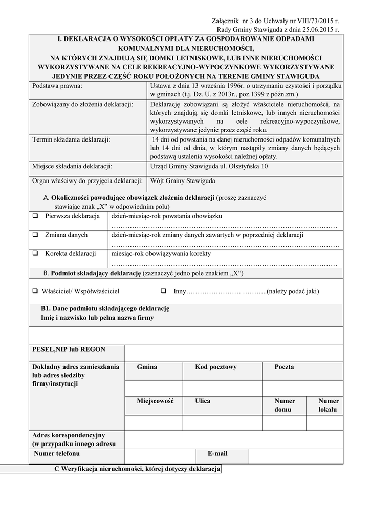 Załącznik nr 3 do Uchwały nr VIII/73/2015 r. Rady Gminy Stawiguda z dnia 25.06.2015 r. I. DEKLARACJA O WYSOKOŚCI OPŁATY ZA GOSPODAROWANIE ODPADAMI KOMUNALNYMI DLA NIERUCHOMOŚCI, NA KTÓRYCH ZNAJDUJĄ SIĘ DOMKI LETNISKOWE, LUB INNE NIERUCHOMOŚCI WYKORZYSTYWANE NA CELE REKREACYJNO-WYPOCZYNKOWE WYKORZYSTYWANE JEDYNIE PRZEZ CZĘŚĆ ROKU POŁOŻONYCH NA TERENIE GMINY STAWIGUDA Podstawa prawna: Ustawa z dnia 13 września 1996r. o utrzymaniu czystości i porządku w gminach (t.j. Dz. U. z 2013r., poz.1399 z późn.zm.) Zobowiązany do złożenia deklaracji: Deklarację zobowiązani są złożyć właściciele nieruchomości, na których znajdują się domki letniskowe, lub innych nieruchomości wykorzystywanych na cele rekreacyjno-wypoczynkowe, wykorzystywane jedynie przez część roku. Termin składania deklaracji: 14 dni od powstania na danej nieruchomości odpadów komunalnych lub 14 dni od dnia, w którym nastąpiły zmiany danych będących podstawą ustalenia wysokości należnej opłaty. Miejsce składania deklaracji: Urząd Gminy Stawiguda ul. Olsztyńska 10 Organ właściwy do przyjęcia deklaracji: Wójt Gminy Stawiguda A. Okoliczności powodujące obowiązek złożenia deklaracji (proszę zaznaczyć stawiając znak „X” w odpowiednim polu) Pierwsza deklaracja dzień-miesiąc-rok powstania obowiązku ……………………………………………………………………………………… Zmiana danych dzień-miesiąc-rok zmiany danych zawartych w poprzedniej deklaracji ………………………………………………………………………………………. Korekta deklaracji miesiąc-rok obowiązywania korekty ……………………………………………………………………………………… B. Podmiot składający deklarację (zaznaczyć jedno pole znakiem „X”) Właściciel/ Współwłaściciel Inny…………………… ………..(należy podać jaki) B1. Dane podmiotu składającego deklarację Imię i nazwisko lub pełna nazwa firmy PESEL,NIP lub REGON Dokładny adres zamieszkania lub adres siedziby firmy/instytucji Adres korespondencyjny (w przypadku innego adresu Numer telefonu Gmina Kod pocztowy Poczta Miejscowość Ulica Numer domu E-mail C Weryfikacja nieruchomości, której dotyczy deklaracja Numer lokalu Adres nieruchomości dla której złożona jest deklaracja Kod pocztowy Miejscowość Ulica Numer domu Numer lokalu Numer działki z rejestru gruntów D. Sposób zbierania odpadów Oświadczam, że będę prowadzić selektywną zbiórkę odpadów TAK NIE (zaznaczyć właściwy kwadrat) E. Wysokość rocznej ryczałtowej opłaty za gospodarowanie odpadami komunalnymi Wysokość rocznej ryczałtowej opłaty za gospodarowanie odpadami komunalnymi stanowić będzie iloczyn domków letniskowych lub innych nieruchomości wykorzystywanych na cele rekreacyjno – wypoczynkowe oraz stawki opłaty zatwierdzonej uchwałą Rady Gminy Stawiguda w sprawie ustalenia ryczałtowej stawki opłaty za gospodarowanie odpadami komunalnymi na nieruchomościach, na których znajdują się domki letniskowe , lub innych nieruchomości wykorzystywanych na cele rekreacyjno- wypoczynkowe. Stawka rocznej ryczałtowej opłaty za gospodarowanie odpadami komunalnymi …… …. .……….zł/rok Liczba domków letniskowych lub innych nieruchomości sztuk ……………… Wysokość rocznej ryczałtowej opłaty za gospodarowanie odpadami …………....…………....................zł F. Podpis składającego deklarację ………………………………………………………........................ (miejscowość i data wypełnienia) G. Adnotacje urzędowe Kartoteka …………………………. (czytelny podpis) Data wprowadzenia do kartoteki H. Pouczenie Niniejsza deklaracja stanowi podstawę prawną do wystawienia tytułu wykonawczego, zgodnie z art. 3a Ustawy z dnia 17 czerwca 1966 r. o postępowaniu egzekucyjnym w administracji ( Dz. U. z 2014 r. , poz. 1619 ze zmianami) Objaśnienia 1. W przypadku korekty deklaracji wynikającej z błędów rachunkowych lub oczywistych omyłek należy dołączyć pisemne uzasadnienie przyczyny korekty deklaracji art. 81 ustawy z dnia 29 sierpnia 1997 r. Ordynacja podatkowa ( Dz. U. z 2012 r. poz. 749. z późn.zm.) 2. Jeżeli obowiązek złożenia deklaracji może jednocześnie dotyczyć kilku podmiotów spośród wskazanych w art. 2 ust. 1 pkt 4 Ustawy o utrzymaniu czystości i porządku w gminach obowiązany do ich wykonania jest podmiot lub podmioty faktycznie władające nieruchomością. W takim przypadku podmioty, których mowa w 2 ust. 1 pkt 4 Ustawy mogą w drodze umowy zawartej w formie pisemnej, wskazać podmiot obowiązany do wykonania obowiązków wynikających z ustawy i załączyć ją do deklaracji . 3. W przypadku zmiany danych będących podstawą ustalenia należnej opłaty za gospodarowanie odpadami komunalnymi,(np. zmiana ilości domków letniskowych, przystąpienie bądź odstąpienie od zbierania odpadów w sposób selektywny) właściciel nieruchomości jest obowiązany złożyć nową deklarację w terminie 14 dni od dnia nastąpienia zmiany (art. 6m ust. 2 Ustawy). 4. W przypadku podpisania deklaracji przez pełnomocnika, zgodnie z art. 80a ustawy z dnia 29 sierpnia 1997 r. Ordynacja podatkowa (Dz. U. z 2012 r. poz. 749. Z późn.zm.) pełnomocnictwo do podpisywania deklaracji składa się wraz z deklaracją. Z chwilą złożenia pełnomocnictwa powstaje obowiązek uiszczenia opłaty skarbowej.. 5. Roczna opłata za gospodarowanie odpadami komunalnymi obliczona i wskazana w deklaracji płatna jest bez wezwania na właściwy rachunek Urzędu Gminy Stawiguda , w terminie określonym w uchwale Rady Gminy Stawiguda w sprawie terminu, częstotliwości i trybu uiszczania opłat za gospodarowanie odpadami komunalnymi .