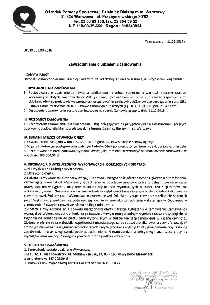 Ośrodek Pomocy Społecznej Dzielnicy Bielany m.st. Warszawy 01-824 Warszawa , ul. Przybyszewskiego 80/82, tel. 22 56 89 100, fax. 22 864 59 52 NIP 118-09-35-660 ; Regon : 010843854 Warszawa, dn. 11.01.2017 r. OPS IX.251.80.2016 Zawiadomienie o udzieleniu zamówienia I. ZAMAWIAJĄCY Ośrodek Pomocy Społecznej Dzielnicy Bielany m. st. Warszawy, 01-824 Warszawa, ul. Przybyszewskiego 80/82 II. TRYB UDZIELENIA ZAMÓWIENIA 1. Postępowanie o udzielenie zamówienia publicznego na usługę społeczną o wartości nieprzekraczającej wyrażonej w złotych równowartości 750 tys. Euro, prowadzone w trybie publicznego zaproszenia do składania ofert na podstawie wewnętrznych uregulowań organizacyjnych Zamawiającego, zgodnie z art. 138o ustawy z dnia 29 stycznia 2004 r. - Prawo zamówień publicznych (t.j. Dz. U. z 2015 r., poz. 2164 ze zm.). 2. Ogłoszenie o zamówieniu zostało zamieszczone na stronie Zamawiającego w dniu 01.12.2016 r. III. PRZEDMIOT ZAMÓWIENIA 1. Przedmiotem zamówienia jest świadczenie usług polegających na przygotowywaniu i dostarczaniu gorących posiłków (obiadów) dla klientów placówek na terenie Dzielnicy Bielany m. st. Warszawy. IV. TERMIN I MIEJSCE OTWARCIA OFERT. 1. Otwarcie ofert nastąpiło w dniu 09.12.2016 r. o godz. 12.15 w siedzibie Zamawiającego. 2. W przedmiotowym postępowaniu wpłynęły 4 oferty. Ofert po wyznaczonym terminie składania ofert nie było. 3. Przed otwarciem ofert Zamawiający podał kwotę, jaką zamierza przeznaczyć na finansowanie zamówienia w wysokości 265 500,00 zł. V. INFORMACJA O WYKLUCZONYCH WYKONAWCACH I ODRZUCONYCH OFERTACH. 1. Nie wykluczono żadnego Wykonawcy. 2. Odrzucono oferty: 2.1 oferta Firmy Granatoil Graniszewscy sp.j. - z powodu niezgodności oferty z treścią Ogłoszenia o zamówieniu. Zamawiający wymagał od Wykonawcy zatrudnienia na podstawie umowy o pracę w pełnym wymiarze czasu pracy, pięć dni w tygodniu od poniedziałku do piątku osób wykonujących w trakcie realizacji zamówienia wskazane czynności. Złożona w ofercie cena wzbudziła wątpliwości Zamawiającego co do sposobu skalkulowania ceny ofertowej. Złożone przez Wykonawcę na wezwanie wyjaśnienia dotyczące ceny oraz przeliczenie podanych przez Wykonawcę wartości nie potwierdzają spełniania warunku zatrudnienia wskazanego w Ogłoszeniu o zamówieniu. Z uwagi na powyższe oferta podlega odrzuceniu. 2.2 oferta Firmy Toscana sc. z powodu niezgodności oferty z treścią Ogłoszenia o zamówieniu. Zamawiający wymagał od Wykonawcy zatrudnienia na podstawie umowy o pracę w pełnym wymiarze czasu pracy, pięć dni w tygodniu od poniedziałku do piątku osób wykonujących w trakcie realizacji zamówienia wskazane czynności. Złożona w ofercie cena wzbudziła wątpliwości Zamawiającego co do sposobu skalkulowania ceny ofertowej. W złożonych na wezwanie wyjaśnieniach dotyczących ceny Wykonawca wyliczył koszty jakie poniesie przy realizacji zamówienia, jednak w wyliczeniu podał zatrudnienie na Zi etatu zamiast w pełnym wymiarze czasu pracy jak wymagała Zamawiający. Z uwagi na powyższe oferta podlega odrzuceniu. VI. UDZIELENIE ZAMÓWIENIA. 1. Zamówienie zostało udzielone Wykonawcy: J&J Łu.Ko. Łukasz Kowalczyk, ul. Mickiewicza 326/17,05 -1 6 0 Nowy Dwór Mazowiecki z ceną ofertową 147 205,00 zł 2. Umowa z ww. Wykonawcą została zawarta w dniu 02.01.2017 r. ZASTE, PC A D/PkEKTC RA A POMC7CY sr>pt.FCZNEJ cn. i / W a r s z a w y /phO (Ji M a i fi o wzut\r S p y c h a lih n