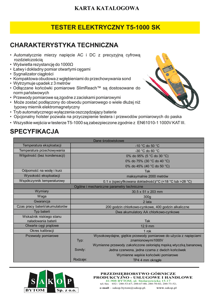 KARTA KATALOGOWA TESTER ELEKTRYCZNY T5-1000 SK CHARAKTERYSTYKA TECHNICZNA • Automatycznie mierzy napięcie AC i DC z precyzyjną cyfrową rozdzielczością • Wyświetla rezystancję do 1000Ω • Łatwy i dokładny pomiar otwartymi cęgami • Sygnalizator ciągłości • Kompaktowa obudowa z wgłębieniami do przechowywania sond • Wytrzymuje upadek z 3 metrów • Odłączane końcówki pomiarowe SlimReach™ są dostosowane do norm państwowych • Przewody pomiarowe są zgodne z zaciskami pomiarowymi • Może zostać podłączony do obwodu pomiarowego o wiele dłużej niż typowy miernik elektromagnetyczny • Tryb automatycznego wyłączenia oszczędzający baterie • Opcjonalny holster pozwala na przyczepienie testera i przewodów pomiarowych do paska • Wszystkie wejścia w testerze T5-1000 są zabezpieczone zgodnie z EN61010-1 1000V KAT III. SPECYFIKACJA Dane środowiskowe Temperatura eksploatacji Temperatura przechowywania Wilgotność (bez kondensacji) Odporność na wodę i kurz Wysokość eksploatacji Współczynnik temperaturowy Wymiary Waga Gwarancja Czas pracy baterii/akumulatorów Typ baterii Wskaźnik niskiego stanu naładowania baterii Otwarte cęgi prądowe Okres kalibracji Przewody pomiarowe -10 °C do 50 °C -30 °C do 60 °C 0% do 95% (5 °C do 30 °C) 0% do 75% (30 °C do 40 °C) 0% do 45% (40 °C do 50 °C) Tak maksymalnie 2000 metrów 0.1 x (specyfikowana dokładność)/°C (<18 °C lub >28 °C) Ogólne i mechaniczne parametry techniczne 30.5 x 51 x 203 mm 300g 2 lata 200 godzin chlorkowo-cynkowe, 400 godzin alkaliczne Dwa akumulatory AA chlorkowo-cynkowe Typ: Sondy: Rodzaje: Tak 12.9 mm 1 rok Wysokowydajne, giętkie przewody pomiarowe do użycia z napięciami znamionowymi1000V Wymienne przewody zakończone osłoniętą męską wtyczką bananową Jedna czerwona, jedna czarna z dwóch końcówek Wymienne wąskie końcówki pomiarowe TP4 4 mm okrągłe PRZEDSIĘBIORSTWO GÓRNICZE PRODUKCYJNO - USŁUGOWE I HANDLOWE 41-908 BYTOM, ul. Stolarzowicka 15-17 tel./fax 032 / 280-53-67; 280-67-00; 280-70-02; 280-73-52; e-mail – [email protected]. www.sakop.pl