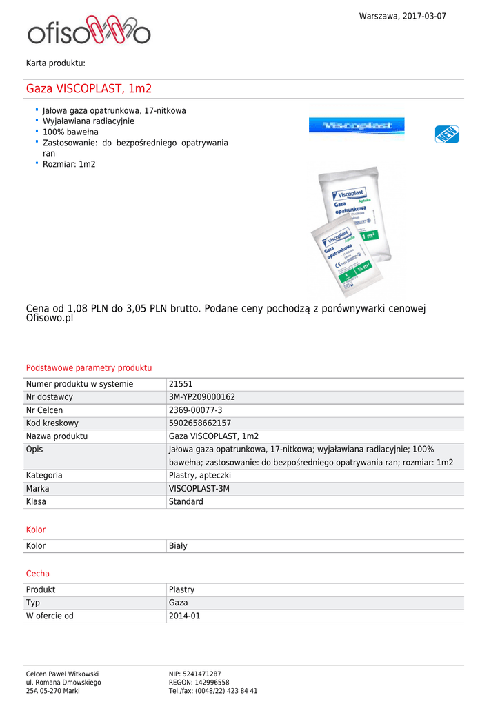 Warszawa, 2017-03-07 Karta produktu: Gaza VISCOPLAST, 1m2 Jałowa gaza opatrunkowa, 17-nitkowa Wyjaławiana radiacyjnie 100% bawełna Zastosowanie: do bezpośredniego opatrywania ran Rozmiar: 1m2 Cena od 1,08 PLN do 3,05 PLN brutto. Podane ceny pochodzą z porównywarki cenowej Ofisowo.pl Podstawowe parametry produktu Numer produktu w systemie 21551 Nr dostawcy 3M-YP209000162 Nr Celcen 2369-00077-3 Kod kreskowy 5902658662157 Nazwa produktu Gaza VISCOPLAST, 1m2 Opis Jałowa gaza opatrunkowa, 17-nitkowa; wyjaławiana radiacyjnie; 100% bawełna; zastosowanie: do bezpośredniego opatrywania ran; rozmiar: 1m2 Kategoria Plastry, apteczki Marka VISCOPLAST-3M Klasa Standard Kolor Kolor Biały Cecha Produkt Plastry Typ Gaza W ofercie od 2014-01 Celcen Paweł Witkowski ul. Romana Dmowskiego 25A 05-270 Marki NIP: 5241471287 REGON: 142996558 Tel./fax: (0048/22) 423 84 41 Warszawa, 2017-03-07 Karta katalogowa produktu cd. Gaza VISCOPLAST, 1m2 Certyfikaty Hit Standard Nowy produkt w ofercie Standard Wspólny słownik zamówień CPV 33141114-2 Serdecznie zapraszamy do współpracy zespół. Ofisowo.pl Celcen Paweł Witkowski ul. Romana Dmowskiego 25A 05-270 Marki NIP: 5241471287 REGON: 142996558 Tel./fax: (0048/22) 423 84 41