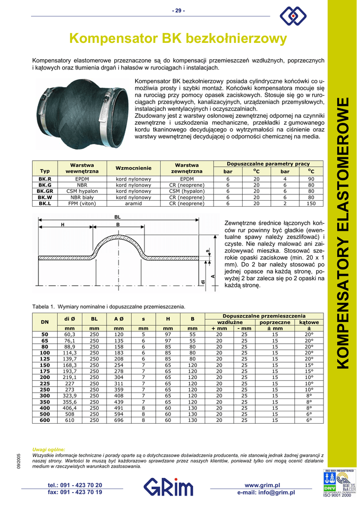 - 29 - Kompensator BK bezkołnierzowy Kompensator BK bezkołnierzowy posiada cylindryczne końcówki co umożliwia prosty i szybki montaż. Końcówki kompensatora mocuje się na rurociąg przy pomocy opasek zaciskowych. Stosuje się go w rurociągach przesyłowych, kanalizacyjnych, urządzeniach przemysłowych, instalacjach wentylacyjnych i oczyszczalniach. Zbudowany jest z warstwy osłonowej zewnętrznej odpornej na czynniki zewnętrzne i uszkodzenia mechaniczne, przekładki z gumowanego kordu tkaninowego decydującego o wytrzymałości na ciśnienie oraz warstwy wewnętrznej decydującej o odporności chemicznej na media. Dopuszczalne parametry pracy Typ Warstwa wewnętrzna Wzmocnienie Warstwa zewnętrzna bar BK.R BK.G BK.GR BK.W BK.L EPDM NBR CSM hypalon NBR biały FPM (viton) kord nylonowy kord nylonowy kord nylonowy kord nylonowy aramid EPDM CR (neoprene) CSM (hypalon) CR (neoprene) CR (neoprene) 6 6 6 6 6 O C bar 20 20 20 20 20 4 6 6 6 2 O C 90 80 80 80 150 Zewnętrzne średnice łączonych końców rur powinny być gładkie (ewentualne spawy należy zeszlifować) i czyste. Nie należy malować ani zaizolowywać mieszka. Stosować szerokie opaski zaciskowe (min. 20 x 1 mm). Do 2 bar należy stosować po jednej opasce na każdą stronę, powyżej 2 bar zaleca się po 2 opaski na każdą stronę. Tabela 1. Wymiary nominalne i dopuszczalne przemieszczenia. DN 09/2005 50 65 80 100 125 150 175 200 225 250 300 350 400 500 600 di Ø BL AØ s H B mm 60,3 76,1 88,9 114,3 139,7 168,3 193,7 219,1 227 273 323,9 355,6 406,4 508 610 mm 250 250 250 250 250 250 250 250 250 250 250 250 250 250 250 mm 120 135 158 183 208 254 278 304 311 359 408 439 491 594 696 mm 5 6 6 6 6 7 7 7 7 7 7 7 8 8 8 mm 97 97 85 85 85 65 65 65 65 65 65 65 60 60 60 mm 55 55 80 80 80 120 120 120 120 120 120 120 130 130 130 Dopuszczalne przemieszczenia wzdłużne poprzeczne kątowe + mm - mm ± mm ± 20 25 15 20° 20 25 15 20° 20 25 15 20° 20 25 15 20° 20 25 15 20° 20 25 15 15° 20 25 15 15° 20 25 15 10° 20 25 15 10° 20 25 15 10° 20 25 15 8° 20 25 15 8° 20 25 15 8° 20 25 15 6° 20 25 15 6° Uwagi ogólne: Wszystkie informacje techniczne i porady oparte są o dotychczasowe doświadczenia producenta, nie stanowią jednak żadnej gwarancji z naszej strony. Wartości te muszą być każdorazowo sprawdzane przez naszych klientów, ponieważ tylko oni mogą ocenić działanie medium w rzeczywistych warunkach zastosowania. tel.: 091 - 423 70 20 fax: 091 - 423 70 19 www.grim.pl e-mail: [email protected] KOMPENSATORY ELASTOMEROWE Kompensatory elastomerowe przeznaczone są do kompensacji przemieszczeń wzdłużnych, poprzecznych i kątowych oraz tłumienia drgań i hałasów w rurociągach i instalacjach.