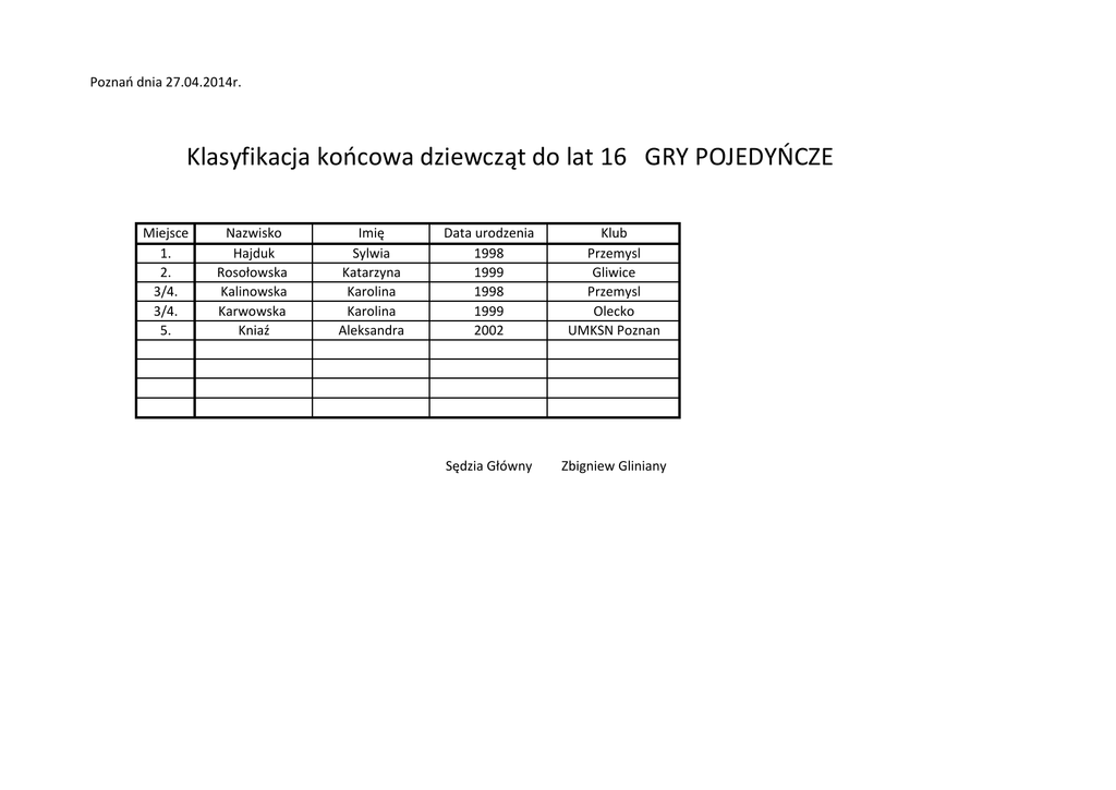 Poznań dnia 27.04.2014r. Klasyfikacja końcowa dziewcząt do lat 16 GRY POJEDYŃCZE Miejsce 1. 2. 3/4. 3/4. 5. Nazwisko Hajduk Rosołowska Kalinowska Karwowska Kniaź Imię Sylwia Katarzyna Karolina Karolina Aleksandra Data urodzenia 1998 1999 1998 1999 2002 Klub Przemysl Gliwice Przemysl Olecko UMKSN Poznan Sędzia Główny Zbigniew Gliniany