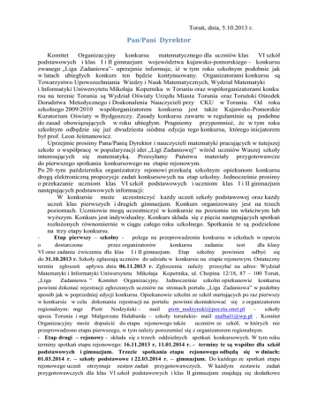 Toruń, dnia, 5.10.2013 r. Pan/Pani Dyrektor Komitet Organizacyjny konkursu matematycznego dla uczniów klas VI szkół podstawowych i klas I i II gimnazjum województwa kujawsko-pomorskiego - konkursu zwanego „Liga Zadaniowa”- uprzejmie informuje, iż w tym roku szkolnym podobnie jak w latach ubiegłych konkurs ten będzie kontynuowany. Organizatorami konkursu są Towarzystwo Upowszechniania Wiedzy i Nauk Matematycznych, Wydział Matematyki i Informatyki Uniwersytetu Mikołaja Kopernika w Toruniu oraz współorganizatorami konku rsu na terenie Torunia są Wydział Oświaty Urzędu Miasta Torunia oraz Toruński Ośrodek Doradztwa Metodycznego i Doskonalenia Nauczycieli przy CKU w Toruniu. Od roku szkolnego 2009/2010 współorganizatorem konkursu jest także Kujawsko-Pomorskie Kuratorium Oświaty w Bydgoszczy. Zasady konkursu zawarte w regulaminie są podobne do zasad obowiązujących w roku ubiegłym. Pragniemy przypomnieć, że w tym roku szkolnym odbędzie się już dwudziesta siódma edycja tego konkursu, którego inicjatorem był prof. Leon Jeśmanowicz. Uprzejmie prosimy Pana/Panią Dyrektor i nauczycieli matematyki pracujących w tutejszej szkole o współpracę w popularyzacji idei „Ligi Zadaniowej” wśród uczniów Waszej szkoły interesujących się matematyką. Przesyłamy Państwu materiały przygotowawcze do pierwszego spotkania konkursowego na etapie rejonowym. Po 20–tym października organizatorzy rejonowi przekażą szkolnym opiekunom konkursu drogą elektroniczną propozycje zadań konkursowych na etap szkolny. Jednocześnie prosimy o przekazanie uczniom klas VI szkół podstawowych i uczniom klas I i II gimnazjum następujących podstawowych informacji: W konkursie może uczestniczyć każdy uczeń szkoły podstawowej oraz każdy uczeń klas pierwszych i drugich gimnazjum. Konkurs organizowany jest na trzech poziomach. Uczniowie mogą uczestniczyć w konkursie na poziomie im właściwym lub wyższym. Konkurs jest indywidualny. Konkurs składa się z pięciu następujących spotkań rozłożonych równomiernie w ciągu całego roku szkolnego. Spotkania te są podzielone na trzy etapy konkursu. Etap pierwszy – szkolny - polega na przeprowadzeniu konkursu w szkołach w oparciu o dostarczone przez organizatorów konkursu zadania: test dla klasy VI oraz zadania ćwiczenia dla klas I i II gimnazjum. Etap szkolny powinien odbyć się do 31.10.2013 r. Szkoły zgłaszają uczniów do udziału w konkursie na etapie rejonowym. Ostateczny termin zgłoszeń upływa dnia 06.11.2013 r. Zgłoszenia należy przesyłać na adres: Wydział Matematyki i Informatyki Uniwersytetu Mikołaja Kopernika, ul. Chopina 12/18, 87 – 100 Toruń, „Liga Zadaniowa ” Komitet Organizacyjny. Jednocześnie szkolni opiekunowie konkursu powinni dokonać rejestracji zgłoszonych uczniów na stronach portalu „Liga Zadaniowa” w podobny sposób jak w poprzedniej edycji konkursu. Opiekunowie szkolni ze szkół startujących po raz pierwszy w konkursie w celu dokonania rejestracji na portalu powinni skontaktować się z organizatorem regionalnym: mgr Piotr Nodzyński – mail [email protected] – szkoły spoza Torunia i mgr Małgorzata Hałaburda – szkoły toruńskie- mail [email protected] . Komitet Organizacyjny może dopuścić do etapu rejonowego także uczniów ze szkół, w których nie przeprowadzono etapu pierwszego, w tym należy porozumieć się z organizatorem regionalnym. - Etap drugi – rejonowy - składa się z trzech oddzielnych spotkań konkursowych. W tym roku terminy spotkań etapu rejonowego: 16.11.2013 r, 11.01.2014 r. - terminy te są wspólne dla szkół podstawowych i gimnazjum. Trzecie spotkania etapu rejonowego odbędą się w dniach: 01.03.2014 r. – szkoły podstawowe i 22.03.2014 r. – gimnazjum. Do każdego ze spotkań etapu rejonowego uczeń otrzymuje zestaw zadań przygotowawczych. W każdym zestawie zadań przygotowawczych dla klas VI szkół podstawowych i klas II gimnazjum znajdują się dodatkowe zadania przygotowawcze do etapu wojewódzkiego powiązane z aktualną tematyką. Zadania konkursowe przygotowane są na podstawie zadań przygotowawczych doręczonych uczniom wcześniej. W trakcie każdego z tych spotkań uczeń rozwiązuje zestaw zadań konkursowych w formie pisemnej. Po zakończeniu etapu rejonowego Komitet Organizacyjny ustala listy zdobywców I, II i III miejsca oraz wyróżnionych. Zdobywcy I miejsca i II miejsca z klas VI szkół podstawowych i klas II gimnazjum, którzy uzyskali co najmniej 75% punktów możliwych do zdobycia są zakwalifikowani do etapu finałowego - wojewódzkiego. – Etap finałowy – wojewódzki odbędzie się w Toruniu na Wydziale Matematyki i Informatyki UMK w dniu 15.03.2014 r. – szkoły podstawowe oraz 5.04.2014 r. gimnazjum. Każdy z uczniów w zawodach finałowych rozwiązuje zestaw zadań w formie pisemnej. Uczniowie nagrodzeni w tym etapie, zgodnie wymogami obowiązującymi w finale wojewódzkiego konkursu przedmiotowego z matematyki, otrzymują tytuł Laureata konkursu „Liga Zadaniowa” lub finalisty konkursu. Laureatom i finalistom przysługują uprawnienia takie same jak laureatom i finalistom kuratoryjnych konkursów przedmiotowych. Uprawnienia te są opisane w regulaminie ogólnym konkursów organizowanych przez Kuratora. - Piąte spotkanie ma charakter podsumowujący roczny konkurs. W rejonie toruńskim odbędzie się ono w dniu 17.05.2014 r. w auli Wydziału Matematyki i Informatyki UMK. Nagrodzeni uczniowie (laureaci, finaliści, zdobywcy I miejsca, II miejsca, III miejsca i wyróżnieni) oraz wyróżnieni nauczyciele otrzymują dyplomy. Dla uczniów szkół toruńskich zawody będą odbywały się w Gimnazjum nr 3 w Toruniu ul. Żwirki i Wigury 49. Spotkania dla pozostałych uczniów rejonu toruńskiego (powiaty toruński i golubsko dobrzyński) odbywać się będą w gmachu Wydziału Matematyki i Informatyki w Toruniu przy ul. Chopina 12/18. Zawody etapu rejonowego dla wszystkich uczniów (!) r