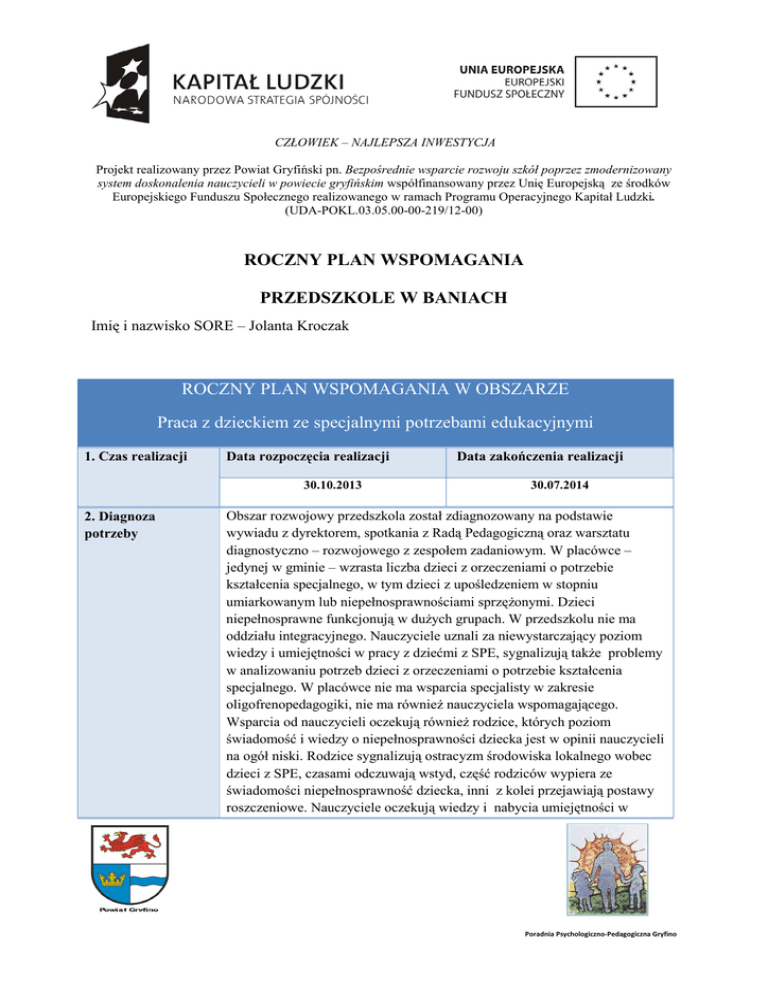 CZŁOWIEK – NAJLEPSZA INWESTYCJA Projekt realizowany przez Powiat Gryfiński pn. Bezpośrednie wsparcie rozwoju szkół poprzez zmodernizowany system doskonalenia nauczycieli w powiecie gryfińskim współfinansowany przez Unię Europejską ze środków Europejskiego Funduszu Społecznego realizowanego w ramach Programu Operacyjnego Kapitał Ludzki. (UDA-POKL.03.05.00-00-219/12-00) ROCZNY PLAN WSPOMAGANIA PRZEDSZKOLE W BANIACH Imię i nazwisko SORE – Jolanta Kroczak ROCZNY PLAN WSPOMAGANIA W OBSZARZE Praca z dzieckiem ze specjalnymi potrzebami edukacyjnymi 1. Czas realizacji Data rozpoczęcia realizacji 30.10.2013 2. Diagnoza potrzeby Data zakończenia realizacji 30.07.2014 Obszar rozwojowy przedszkola został zdiagnozowany na podstawie wywiadu z dyrektorem, spotkania z Radą Pedagogiczną oraz warsztatu diagnostyczno – rozwojowego z zespołem zadaniowym. W placówce – jedynej w gminie – wzrasta liczba dzieci z orzeczeniami o potrzebie kształcenia specjalnego, w tym dzieci z upośledzeniem w stopniu umiarkowanym lub niepełnosprawnościami sprzężonymi. Dzieci niepełnosprawne funkcjonują w dużych grupach. W przedszkolu nie ma oddziału integracyjnego. Nauczyciele uznali za niewystarczający poziom wiedzy i umiejętności w pracy z dziećmi z SPE, sygnalizują także problemy w analizowaniu potrzeb dzieci z orzeczeniami o potrzebie kształcenia specjalnego. W placówce nie ma wsparcia specjalisty w zakresie oligofrenopedagogiki, nie ma również nauczyciela wspomagającego. Wsparcia od nauczycieli oczekują również rodzice, których poziom świadomość i wiedzy o niepełnosprawności dziecka jest w opinii nauczycieli na ogół niski. Rodzice sygnalizują ostracyzm środowiska lokalnego wobec dzieci z SPE, czasami odczuwają wstyd, część rodziców wypiera ze świadomości niepełnosprawność dziecka, inni z kolei przejawiają postawy roszczeniowe. Nauczyciele oczekują wiedzy i nabycia umiejętności w Poradnia Psychologiczno-Pedagogiczna Gryfino CZŁOWIEK – NAJLEPSZA INWESTYCJA zakresie planowania pracy z dziećmi z orzeczeniami, prawidłowości realizacji zaleceń. Sygnalizowana jest potrzeba umiejętności w budowaniu IPET- u, karty obserwacji oraz realizacji zaplanowanych działań wobec dzieci z orzeczeniami w ramach zespołowej pracy nauczycieli. 3. Cel 4. Zakładane wskaźniki realizacji RPW Celem ogólnym jest utworzenie i wdrożenie efektywnego systemu pracy z dziećmi ze specjalnymi potrzebami edukacyjnymi, szczególnie tymi, które posiadają już orzeczenia o potrzebie kształcenia specjalnego i są w przedszkolu ogólnodostępnym w którym nie ma grupy integracyjnej. Cele szczegółowe: 1. Zwiększenie kompetencji kadry pedagogicznej w zakresie analizowania indywidualnych potrzeb dziecka. 2. Doskonalenie umiejętności zespołowego planowania pracy z dzieckiem posiadającym orzeczenie o potrzebie kształcenia specjalnego, w tym konstruowania IPET – u. 3. Wzrost poziomu umiejętności nauczycieli w realizowaniu zaplanowanych w indywidualnych programach terapeutyczno – edukacyjnych konkretnych działań. 4. Wzrost kompetencji nauczycieli w zakresie współpracy z rodzicami dzieci ZSP w celu zwiększenia szans powodzeni9a w realizacji celów określonych w IPET. 5. Integracja dzieci niepełnosprawnych z dziećmi zdrowymi (kształtowanie postaw tolerancji i akceptacji wśród dzieci i rodziców w przedszkolu). 1. Odbycie szkoleń na temat zasad pracy z dziećmi z SPE przez 100% nauczycieli uczestniczących w projekcie. 2. Zrealizowanie co najmniej 14 godzin szkoleniowych w obszarze j.w. w placówce. 3. Skonstruowanie zespołowo IPET, kart obserwacji. 4. Prawidłowa dokumentacja planowania działań dziecka posiadającego orzeczenie o potrzebie kształcenia specjalnego oraz realizacja działań. 5. Zwiększenie stopnia realizacji założonych celów. 6. Zrealizowanie co najmniej 10 godzin doradztwa indywidualnego dla nauczycieli. 7. Wsparcie – konsultacje i warsztaty dla rodziców. Poradnia Psychologiczno-Pedagogiczna Gryfino CZŁOWIEK – NAJLEPSZA INWESTYCJA 5. Harmonogram realizacji RPW Zadanie Termin realizacji zadania Miejsce realizacji zadania 1.Spotkanie szkolnego organizatora rozwoju edukacji z dyrektorem przedszkola (2 godz.) 18.11.2013 Pokój nauczycielski Przedszkole w Bani 2. Spotkanie SORE z Radą Pedagogiczną / utworzenie zespołu zadaniowego (2 godz.) 18.11.2013 Pokój nauczycielski Przedszkole w Bani 09.12.2013 Pokój nauczycielski Przedszkole w Bani 10.12.2013 Pokój nauczycielski Przedszkole w Bani 3. Warsztat diagnostyczno-rozwojowy (SORE, zespół zadaniowy) (4 godz.) 4. Wypracowanie rocznego planu wspomagania szkoły 5. Wykład na temat zasad pracy z dzieckiem z SPE, w tym zakres i sposoby dostosowania wymagań do możliwości psychofizycznych dziecka (2 godz.) 20.02.2014 godz. 9.30 Sala dydaktyczna Przedszkole w Bani 6.Warsztat I w zakresie tworzenia IPET (analiza orzeczenia, wielospecjalistyczna ocena poziomu funkcjonowania, sformułowanie potrzeb , określenie form, 17.02.2014 godz.12.30 Sala dydaktyczna Przedszkole w Bani Poradnia Psychologiczno-Pedagogiczna Gryfino CZŁOWIEK – NAJLEPSZA INWESTYCJA sposobów i metod pracy z dzieckiem) - (5 godz.) Sala dydaktyczna Przedszkole w Bani 7. Warsztat II w zakresie pracy z dzieckiem z SPE oraz wspomagania rodziców dziecka z SPE (5 godz.) 24.02.2014 godz.12.30 8. Konsultacje z ekspertem dla nauczycieli (2 godz.). 27.02.2014 godz.9.30 9. Konsultacje indywidualne i zbiorowe SORE z nauczycielami i/lub dyrektorem szkoły (min. 10 godz.). Na bieżąco według potrzeb min. 5 konsultacji po 2 godz. raz w miesiącu w okresie luty - czerwiec Pokój nauczycielski Przedszkole w Bani 10. Monitorowanie zaplanowanych działań – wsparcie dla dyrektora, uczestniczenie w spotkaniach zespołu nauczycielskiego. Na bieżąco wg potrzeb oraz harmonogramu zebrań zespołu nauczycieli Pokój nauczycielski, sala zajęć Przedszkole w Bani 11. Opracowanie sprawozdania z realizacji RPW (SORE) – 24 godz.