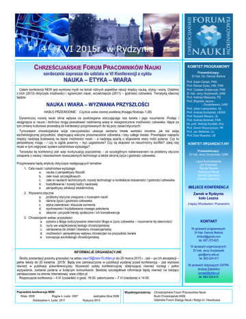 CCHHRRZZEEŚŚCCIIJJAAŃŃSSKKIIEE FFOORRUUMM PPRRAACCOOW WNNIIKKÓ ÓW WN NAAUUKKII KOMITET PROGRAMOWY sseerrddeecczznniiee zzaapprraasszzaa ddoo uuddzziiaałłuu ww VVII KKoonnffeerreennccjjii zz ccyykklluu Przewodniczący: Dr hab. Inż. Dariusz Badura NNAAUUKKAA –– EETTYYKKAA –– W WIIAARRAA Celem konferencji NEW jest wymiana myśli na temat różnych aspektów relacji między nauką, etyką i wiarą. Ostatnia z nich (2013) dotyczyła możliwości i ograniczeń nauki, wcześniejsza (2011) – godności człowieka. Tematyką obecnej będzie NAUKA I WIARA – WYZWANIA PRZYSZŁOŚCI HASŁO PRZEWODNIE: Czyńcie sobie ziemię poddaną (Księga Rodzaju 1,28) Dynamiczny rozwój nauki silnie wpływa na postrzeganie otaczającego nas świata i jego rozumienie. Postęp i osiągnięcia w nauce i technice mogą powodować nadmierną wiarę w nieograniczone możliwości człowieka. Idące za tym zmiany kulturowe prowadzą do kontestacji przyjmowanych do tej pory zasad etycznych. Tymczasem chrześcijańska wizja rzeczywistości ukazuje zarówno trwałe wartości moralne, jak też wizję eschatologicznej przyszłości, obejmującą wieczne przeznaczenie człowieka i losy całego świata. Powstające napięcie między nadzieją budowaną na bazie możliwości nauki – a nadzieją opartą o objawienie wiary rodzi pytania: Czy te perspektywy mogą – i czy w ogóle powinny – być uzgodnione? Czy są skazane na nieuchronny konflikt? Jaką rolę może w tym odgrywać system szkolnictwa wyższego? Tematyka tej konferencji jest więc kontynuacją poprzedniej – ze szczególnym nakierowaniem na problemy etyczne związane z nauką i stosowaniem nowoczesnych technologii a także obroną życia i godności człowieka. Przyjmowane będą artykuły dotyczące następujących tematów: 1. Cele nauki i szkolnictwa wyższego a. nauka z perspektywy filozofii b. cele nauk szczegółowych c. cele w naukach technicznych; rozwój technologii w kontekście tożsamości i godności człowieka d. kształtowanie i rozwój kadry naukowej e. perspektywy edukacji akademickiej 2. Wyzwania etyczne a. problemy etyczne związane z rozwojem nauki b. obrona życia i godności człowieka c. etyka zawodowa i klauzula sumienia d. wychowanie i kształtowanie nowego pokolenia e. obecne i przyszłe trendy społeczne i ich konsekwencje 3. Chrześcijanin wobec przyszłości a. pytania o Boga (odczytywanie obecności Boga w życiu człowieka – rozumienie tej obecności) b. nurty we współczesnej teologii chrześcijańskiej c. odniesienie do źródeł i literatury chrześcijańskiej d. możliwości i perspektywy wpływu chrześcijan na przyszłość świata e. koncepcje eschatologii chrześcijańskiej INFORMACJE ORGANIZACYJNE Skróty prezentacji prosimy przesyłać na adres [email protected] do 20 marca 2015 r., zaś – po ich akceptacji – pełne teksty do 20 kwietnia 2015r. Będą one zamieszczone w publikacji wydanej przed konferencją – zaś wybrane również w publikacji pokonferencyjnej. Wysokość opłaty konferencyjnej, obejmującej również noclegi i pełne wyżywienie, zostanie podana w kolejnym komunikacie. Bardziej szczegółowe informacje będą również na bieżąco zamieszczane na stronie internetowej www.chfpn.pl. Rozpoczęcie konferencji – 4.VI (czwartek) o godz. 16:00, zakończenie – 7.VI (niedziela) o 14:00. Poprzednie konferencje NEW: Wisła 2005 Rogów k. Łodzi 2007 Dobieszków k. Łodzi 2011 Jastrzębia Góra 2009 Rydzyna 2013 Prof. Adam Cenian, PAN Prof. Roman Duda, UWr, PAN Prof. Czesław Grabarczyk, PAN Dr hab. Jerzy Grzybowski, UAM Prof. Andrzej Hławiczka, PŚ Prof. Zbigniew Jacyna - Onyszkiewicz, UAM Prof. Julian Ławrynowicz, UŁ Prof. Andrzej Kochański, UKSW Prof. Ryszard Kleszcz, UŁ Prof. Andrzej Schinzel, PAN Ks. prof. Andrzej Szostek, KUL Prof. Zenon Waszczyszyn, PK Prof. Jan Woleński, UJ Prof. Ewa Wysocka, UŚ KOMITET ORGANIZACYJNY Przewodniczący: Dr hab. Jerzy Grzybowski, UAM Laura Suchostawska Jan Wadowski Wanda Nowara Katarzyna Mania Andrzej Zabołotny Elżbieta Zabołotny MIEJSCE KONFERENCJI Zamek w Rydzynie koło Leszna (między Wrocławiem i Poznaniem) KONTAKT W sprawach programowych: Dr hab. Dariusz Badura [email protected] tel. 607-372-823 W sprawach organizacyjnych: Dr hab. Jerzy Grzybowski [email protected] tel. 663-224-411 W sprawach dotyczących ChFPN: Andrzej Zabołotny [email protected] tel. 663-224-414 Współorganizatorzy: Chrześcijańskie Forum Pracowników Nauki Ruch Chrześcijański Mt28 Gdańskie Forum Dialogu Nauki i Religii im. Heweliusza