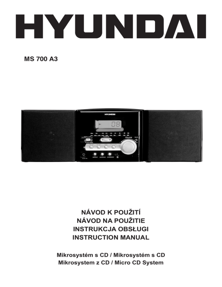 MS 700 A3 NÁVOD K POUŽITÍ NÁVOD NA POUŽITIE INSTRUKCJA OBSŁUGI INSTRUCTION MANUAL Mikrosystém s CD / Mikrosystém s CD Mikrosystem z CD / Micro CD System Obsah 1. Bezpečnost .................................................................................................................. 1. 1 Zamýšlený účel ..................................................................................................... 1.2 Symboly v tomto návodu . ..................................................................................... 1. 3 Všeobecné bezpečnostní pokyny ......................................................................... 2. Příprava k použití . ....................................................................................................... 2.1 Vybalení ................................................................................................................ 2.2 Obsah balení . ....................................................................................................... 3. Instalace ....................................................................................................................... 3.1 Instalace reproduktorů .......................................................................................... 4. Funkce .......................................................................................................................... 4.1 Čelní panel ............................................................................................................ 4.2 Dálkový ovladač .................................................................................................... 5. Provoz . ......................................................................................................................... 5.1 Obecné funkce ...................................................................................................... 5.2 Funkce rádia ......................................................................................................... 5.3 Funkce CD ............................................................................................................ 6. Čištění a údržba ........................................................................................................... 6.1 Zacházení s disky a péče o ně ............................................................................. 7. Řešení problémů ......................................................................................................... 8. Technické údaje ........................................................................................................... 9. Likvidace použitého elektrického a elektronického vybavení ................................ Upozornění na autorské právo Provedení a specifikace se mohou změnit bez předchozího upozornění. CZ - 3 3 3 3 4 4 4 4 5 5 5 6 6 6 6 7 8 8 9 9 10 CZ 1. Bezpečnost 1.1 Zamýšlený účel Hudební mikrosystém přehrává hudbu z CD a rádia. Před prvním použitím si pozorně přečtěte návod. 1.2 Symboly v tomto návodu UPOZORNĚNÍ Upozornění znamená, že v případě neuposlechnutí pokynů hrozí zranění nebo smrt. POZOR Pozor znamená, že je možné poškození přístroje. Poznámka poskytuje dodatečné informace, např. o postupu. 1.3 Všeobecné bezpečnostní pokyny UPOZORNĚNÍ Nezacházejte s přístrojem silou. Může dojít k jeho pádu a vážnému zranění. POZOR Dbejte, abyste přístroj nepolil tekutinou. UPOZORNĚNÍ Do ventilačních otvorů nevsunujte žádné předměty. POZOR Neblokujte ventilační otvory. Tento přístroj má dvojitou izolaci; proto není nutný zemnící vodič. Vždy zkontrolujte, zda napětí v síti odpovídá napětí uvedenému na typovém štítku. Tento spotřebič není určen pro používání osobami (včetně dětí), jimž fyzická, smyslová, nebo mentální neschopnost či nedostatek zkušeností a znalostí zabraňuje v bezpečném používání spotřebiče, pokud na ně nebude dohlíženo nebo pokud nebyly instruovány ohledně použití spotřebiče osobou zodpovědnou za jejich bezpečnost. Děti by měli být vždy pod dohledem, aby se zamezilo jejich hraní s tímto přístrojem. Tento přístroj využívá laserový systém. Aby nedošlo k přímému ozáření laserovým paprskem, přístroj neotvírejte. Po otevření a překonání bezpečnostních zámků je viditelné laserové záření. CZ - 2. Příprava k použití 2.1 Vybalení • Přístroj opatrně vybalte. • Zkontrolujte obsah balení dle popisu níže. Pokud chybí některá položka, kontaktuje prosím svého prodejce. • Pokud jsou na čelním panelu nálepky, opatrně je odstraňte. Doporučujeme, abyste si ponechali původní krabici a balící materiál pro případ, že byste museli výrobek vrátit do servisu. Je to jediný způsob, jak bezpečně ochránit výrobek proti poškození při dopravě. Pokud budete krabici a balící materiál likvidovat, mějte ohled na životní prostředí a recyklujte je. 2.2 Obsah balení Balení, které jste dostali, obsahuje následující položky: 1 hudební mikrosystém 2 reproduktory 1 dálkový ovladač 1 návod k použití Pokud některá položka chybí, kontaktuje prosím svého prodejce. 3. Instalace • • • • • Položte přístroj na vodorovný plochý povrch. Připojte k přístroji reproduktory. Předčtěte si odstavec „Instalace reproduktorů“. Připojte přístroj k síti. Instalujte baterie do dálkového ovladače. Přečtěte si odstavec „Dálkový ovladač“. POZOR • Neumísťujte přístroj blízko zdrojů tepla. • Nevystavujte přístroj přímému slunečnímu svitu. Tento přístroj je vybaven pryžovými nožkami, které brání jeho pohybu. Nožky jsou vyrobeny z neklouzavého materiálu speciálně vyvinutého, aby nenechával na nábytku žádné stopy ani skvrny. Avšak určité typy nábytkových leštidel, konzerv