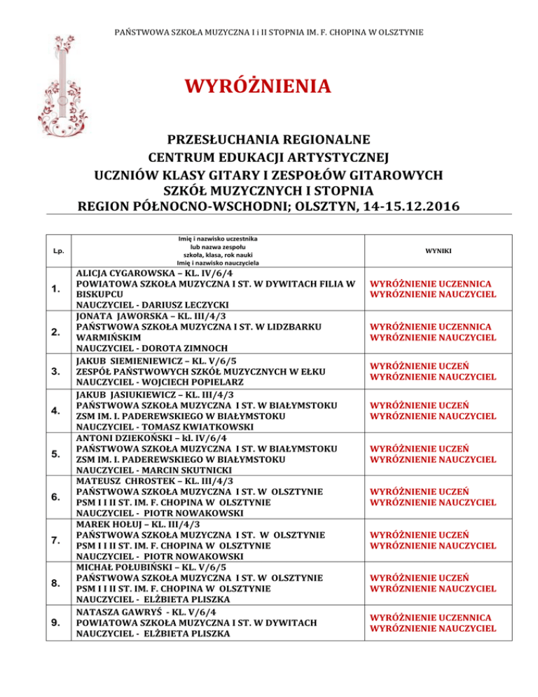 PAŃSTWOWA SZKOŁA MUZYCZNA I i II STOPNIA IM. F. CHOPINA W OLSZTYNIE WYRÓŻNIENIA PRZESŁUCHANIA REGIONALNE CENTRUM EDUKACJI ARTYSTYCZNEJ UCZNIÓW KLASY GITARY I ZESPOŁÓW GITAROWYCH SZKÓŁ MUZYCZNYCH I STOPNIA REGION PÓŁNOCNO-WSCHODNI; OLSZTYN, 14-15.12.2016 Lp. 1. 2. 3. 4. 5. 6. 7. 8. 9. Imię i nazwisko uczestnika lub nazwa zespołu szkoła, klasa, rok nauki Imię i nazwisko nauczyciela ALICJA CYGAROWSKA – KL. IV/6/4 POWIATOWA SZKOŁA MUZYCZNA I ST. W DYWITACH FILIA W BISKUPCU NAUCZYCIEL - DARIUSZ LECZYCKI JONATA JAWORSKA – KL. III/4/3 PAŃSTWOWA SZKOŁA MUZYCZNA I ST. W LIDZBARKU WARMIŃSKIM NAUCZYCIEL - DOROTA ZIMNOCH JAKUB SIEMIENIEWICZ – KL. V/6/5 ZESPÓŁ PAŃSTWOWYCH SZKÓŁ MUZYCZNYCH W EŁKU NAUCZYCIEL - WOJCIECH POPIELARZ JAKUB JASIUKIEWICZ – KL. III/4/3 PAŃSTWOWA SZKOŁA MUZYCZNA I ST. W BIAŁYMSTOKU ZSM IM. I. PADEREWSKIEGO W BIAŁYMSTOKU NAUCZYCIEL - TOMASZ KWIATKOWSKI ANTONI DZIEKOŃSKI – kl. IV/6/4 PAŃSTWOWA SZKOŁA MUZYCZNA I ST. W BIAŁYMSTOKU ZSM IM. I. PADEREWSKIEGO W BIAŁYMSTOKU NAUCZYCIEL - MARCIN SKUTNICKI MATEUSZ CHROSTEK – KL. III/4/3 PAŃSTWOWA SZKOŁA MUZYCZNA I ST. W OLSZTYNIE PSM I I II ST. IM. F. CHOPINA W OLSZTYNIE NAUCZYCIEL - PIOTR NOWAKOWSKI MAREK HOŁUJ – KL. III/4/3 PAŃSTWOWA SZKOŁA MUZYCZNA I ST. W OLSZTYNIE PSM I I II ST. IM. F. CHOPINA W OLSZTYNIE NAUCZYCIEL - PIOTR NOWAKOWSKI MICHAŁ POŁUBIŃSKI – KL. V/6/5 PAŃSTWOWA SZKOŁA MUZYCZNA I ST. W OLSZTYNIE PSM I I II ST. IM. F. CHOPINA W OLSZTYNIE NAUCZYCIEL - ELŻBIETA PLISZKA NATASZA GAWRYŚ - KL. V/6/4 POWIATOWA SZKOŁA MUZYCZNA I ST. W DYWITACH NAUCZYCIEL - ELŻBIETA PLISZKA WYNIKI WYRÓŻNIENIE UCZENNICA WYRÓZNIENIE NAUCZYCIEL WYRÓŻNIENIE UCZENNICA WYRÓZNIENIE NAUCZYCIEL WYRÓŻNIENIE UCZEŃ WYRÓZNIENIE NAUCZYCIEL WYRÓŻNIENIE UCZEŃ WYRÓZNIENIE NAUCZYCIEL WYRÓŻNIENIE UCZEŃ WYRÓZNIENIE NAUCZYCIEL WYRÓŻNIENIE UCZEŃ WYRÓZNIENIE NAUCZYCIEL WYRÓŻNIENIE UCZEŃ WYRÓZNIENIE NAUCZYCIEL WYRÓŻNIENIE UCZEŃ WYRÓZNIENIE NAUCZYCIEL WYRÓŻNIENIE UCZENNICA WYRÓZNIENIE NAUCZYCIEL KAROLINA SZYMAŃSKA – kl. II/4/2 PAŃSTWOWA SZKOŁA MUZYCZNA I ST. IM. F. CHOPINA W 10. SZCZYTNIE NAUCZYCIEL - BOGUSŁAW SITKO ALICJA ORENT – KL. V/6/5 11. POWIATOWA SZKOŁA MUZYCZNA I ST. W DYWITACH NAUCZYCIEL - JAROSŁAW JANIK FILIP SZCZEPKOWSKI – KL. V/6/5 12. PAŃSTWOWA SZKOŁA MUZYCZNA I I II ST. W SUWAŁKACH NAUCZYCIEL - DARIUSZ MICHAŁOWSKI OLIWIA INGIELEWICZ – KL. IV/6/4 ZESPÓŁ PAŃSTWOWYCH SZKÓŁ MUZYCZNYCH 13. IM. K. WIŁKOMIRSKIEGO W ELBLĄGU NAUCZYCIEL - MAŁGORZATA PIEJDAK MARIA DANIELEWSKA – KL. V/6/5 ZESPÓŁ PAŃSTWOWYCH SZKÓŁ MUZYCZNYCH 14. IM. K. WIŁKOMIRSKIEGO W ELBLĄGU NAUCZYCIEL - HANNA ORLEWICZ-OLCZAK 1. 2. DUET GITAROWY: ZUZANNA BONARSKA JAKUB TRUSZKOWSKI PSM I ST. IM. E. MŁYNARSKIEGO W AUGUSTOWIE DARIUSZ MICHAŁOWSKI DUET GITAROWY: MATEUSZ CHROSTEK MAREK HOŁUJ PSM I ST. PSM I I II ST. IM. F. CHOPINA W OLSZTYNIE PIOTR NOWAKOWSKI WYRÓŻNIENIE UCZENNICA WYRÓZNIENIE NAUCZYCIEL WYRÓŻNIENIE UCZENNICA WYRÓZNIENIE NAUCZYCIEL WYRÓŻNIENIE UCZEŃ WYRÓZNIENIE NAUCZYCIEL WYRÓŻNIENIE UCZENNICA WYRÓZNIENIE NAUCZYCIEL WYRÓŻNIENIE UCZENNICA WYRÓZNIENIE NAUCZYCIEL WYRÓŻNIENIE DUET WYRÓZNIENIE NAUCZYCIEL WYRÓŻNIENIE DUET WYRÓZNIENIE NAUCZYCIEL GRATULUJEMY SUKCESU UCZNIOM I ICH PEDAGOGOM