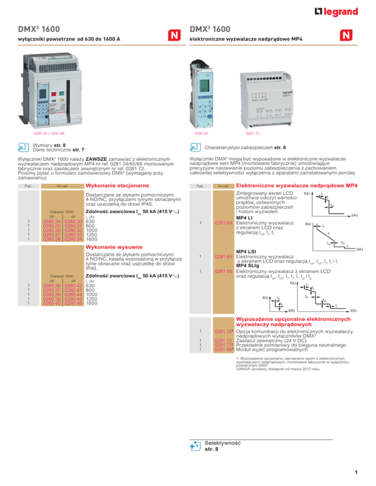 DMX3 1600 DMX3 1600 wyłączniki powietrzne od 630 do 1600 A elektroniczne wyzwalacze nadprądowe MP4 0280 28 + 0281 66 0281 65 Wymiary str. 8 Dane techniczne str. 7 Charakterystyki zabezpieczeń str. 6 Wyłączniki DMX3 1600 należy ZAWSZE zamawiać z elektronicznym wyzwalaczem nadprądowym MP4 nr ref. 0281 54/65/66 montowanym fabrycznie oraz zasilaczem zewnętrznym nr ref. 0281 72. Prosimy pytać o formularz zamówieniowy DMX3 (wymagany przy zamawianiu). Pak. Nr ref. Wykonanie stacjonarne Wyłączniki DMX3 mogą być wyposażone w elektroniczne wyzwalacze nadprądowe serii MP4 (montowane fabrycznie) umożliwiające precyzyjne nastawianie poziomu zabezpieczenia z zachowaniem całkowitej selektywności wyłączenia z aparatami zainstalowanymi poniżej. Pak. Dostarczane ze stykami pomocniczymi 4 NO/NC, przyłączami tylnymi obracanymi oraz uszczelką do drzwi IP40. 1 1 1 1 1 Gabaryt 1600 3P 4P 0280 24 0280 25 0280 26 0280 27 0280 28 0280 30 0280 31 0280 32 0280 33 0280 34 Zdolność zwarciowa Icu 50 kA (415 VA) In (A) 630 800 1000 1250 1600 1 Dostarczane ze stykami pomocniczymi 4 NO/NC, kasetą wyposażoną w przyłącza tylne obracane oraz uszczelkę do drzwi IP40. 1 1 1 1 1 0280 36 0280 37 0280 38 0280 39 0280 40 0280 42 0280 43 0280 44 0280 45 0280 46 Zdolność zwarciowa Icu 50 kA (415 VA) Nr ref. Elektroniczne wyzwalacze nadprądowe MP4 Zintegrowany ekran LCD umożliwia odczyt wartości prądów, ustawionych poziomów zabezpieczeń i historii wyzwoleń. MP4 LI 0281 64 Elektroniczny wyzwalacz z ekranem LCD oraz regulacją Isd, Ir, tr t(s) Ir tr Isd I(A) t(s) Ir tr tsd Isd Wykonanie wysuwne Gabaryt 1600 3P 4P 0281 72 1 1 In (A) Ii I(A) MP4 LSI 0281 65 Elektroniczny wyzwalacz z ekranem LCD oraz regulacją Isd, tsd, Ir, tr i Ii MP4 SLIg 0281 66 Elektroniczny wyzwalacz z ekranem LCD oraz regulacją Isd, tsd, Ir, tr, Ii, Ig i tg t(s) 630 800 1000 1250 1600 t(s) Ir Isd lg tg tr tsd li I(A) I(A) Wyposażenie opcjonalne elektronicznych wyzwalaczy nadprądowych 1 1 1 1 0281 701 Opcja komunikacji do elektronicznych wyzwalaczy nadprądowych wyłączników DMX3 0281 72 Zasilacz zewnętrzny (24 V DC) 0281 711 Przekładnik pomiarowy do bieguna neutralnego 0281 991 Moduł wyjść programowalnych 1: Wyposażenie opcjonalne, zamawiane razem z elektronicznym wyzwalaczem nadprądowym, montowane fabrycznie w wyłączniku powietrznym DMX3. UWAGA: produkty dostępne od marca 2017 roku. Selektywność str. 8 1 DMX3-I 1600 DMX3-I 1600 rozłączniki powietrzne od 1000 do 1600 A rozłączniki powietrzne od 1000 do 1600 A n Dane techniczne Rozłącznik DMX3-I 1600 In przy 40° C (A) 1000 1250 1600 Napięcie znamionowe izolacji Ui (V) 1000 Napięcie znamionowe udarowe wytrzymywane Uimp (kV) 12 Napięcie znamionowe łączeniowe Ue (50/60 Hz) (V) 690 Kategoria użytkowania 0280 52 Nr ref. 1 1 1 In (A) 0280 50 0280 56 1000 0280 51 0280 57 1250 0280 52 0280 58 1600 Dostarczane ze stykami pomocniczymi 4 NO/NC, kasetą wyposażoną w przyłącza tylne obracane oraz uszczelkę do drzwi IP40. 1 1 1 105 380 / 415 VA 105 440 / 460 VA 105 480 / 500 VA 105 600 VA 88 690 VA 88 220 / 240 VA 50 380 / 415 VA 50 440 / 460 VA 50 480 / 500 VA 50 600 VA 42 690 VA mechaniczna bez przeglądów okresowych mechaniczna z przeglądami okresowymi 42 Prąd znamionowy krótkotrwały wytrzymywany Icw (kA) dla t = 1 s Wykonanie wysuwne Gabaryt 1600 3P 4P 220 / 240 VA Wykonanie stacjonarne Dostarczane ze stykami pomocniczymi 4 NO/NC, przyłączami tylnymi obracanymi oraz uszczelką do drzwi IP40. Gabaryt 1600 3P 4P Tak Prąd znamionowy załączalny zwarciowy Icm (kA) Wymiary str. 8 Pak. AC23A Bezpieczna przerwa izolacyjna po wyłączeniu In (A) 0280 62 0280 68 1000 0280 63 0280 69 1250 0280 64 0280 70 1600 Trwałość (ilość cykli) łączeniowa Temperatura 5000 10000 1500 przy 690 V / 3000 przy 415 V pracy -5°C do +70°C magazynowania -25°C do +85°C nP rąd użytkowy (A) w zależności od temperatury otoczenia Wykonanie stacjonarne / wysuwne Temperatura 40°C DMX3-I 1600 2 50°C 60°C 65°C Imax (A) Ir / In Imax (A) Ir / In Imax (A) Ir / In Imax (A) 1000 1 1000 1 1000 1 1250 1 1250 1 1250 1 1600 1 1472 0,92 1328 0,83 70°C Ir / In Imax (A) Ir / In 1000 1 1000 0,95 1187 0,95 1125 0,9 1280 0,8 1216 0,76 DMX3 1600 wyposażenie dodatkowe 0281 39 Pak. 1 1 1 1 1 0281 23 Nr ref. 0281 31 0281 32 0281 33 0281 34 0281 35 1 1 1 1 1 0281 36 0281 37 0281 38 0281 39 0281 40 1 1 1 1 1 1 0281 41 0281 42 0281 43 0281 44 0281 45 0281 46 1 1 1 1 1 0281 20 0281 21 0281 22 0281 23 0281 24 1 1 1 1 1 0281 26 0281 27 0281 28 0281 29 0281 30 1 0281 73 0281 78 Wyposażenie dodatkowe do sterowania i sygnalizacji Wyzwalacze napięciowe (wzrostowe) Umożliwiają bezzwłoczne wyłączenie aparatu po podaniu napięcia. 24 VA/= 48 VA/= 110 - 130 VA/= 220 - 250 VA/= 415 - 440 VA Wyzwalacze podnapięciowe (zanikowe) Umożliwiają bezzwłoczne wyłączenie aparatu przy spadku lub zaniku napięcia. 24 VA/= 48 VA/= 110 - 130 VA/= 220 - 250 VA/= 415 - 440 VA Moduły zwłoczne do wyzwalaczy podnapięciowych Umożliwiają ograniczenie wyłączeń aparatu przy chwilowym spadku napięcia. 110 VA/= (opóźnienie 1s) 230 VA/= (opóźnienie 1s) 110 VA/= (opóźnienie 3s) 230 VA/= (opóźnienie 3s) 110 VA/= (opóźnienie 5s) 230 VA/= (opóźnienie 5s) Napędy silnikowe Dla zdalnego sterowania DMX3 oprócz napędu silnikowego aparat należy dodatkowo wyposażyć w wyzwalacz napięciowy lub podnapięciowy (wyłączenie) oraz cewkę zamykania (załączenie). 24 VA/= 48 VA/= 110 - 130 VA/= 220 - 250 VA/= 415 - 440 VA Cewki zamykania Umożliwia zdalne załączenie aparatu, jeśli sprężyna załączająca jest naciągnięta. 24 VA/= 48 VA/= 110 - 130 VA/= 220 - 250 VA/= 415 - 440 VA Styk sygnalizacyjny położenia DMX3 wysuwnego Styk sygnalizacyjny Wsunięty / Test / Wysunięty 1 zestyk przełączny dla każdej pozycji (do 2 zestyków jeżeli nie zastosowano przycisku bezpieczeństwa w pozycji Test, nr ref. 0281 87) 0281 75 0281 81 Blokady Pak. Nr ref. 1 0281 78 1 0281 79 1 0281 80 1 0281