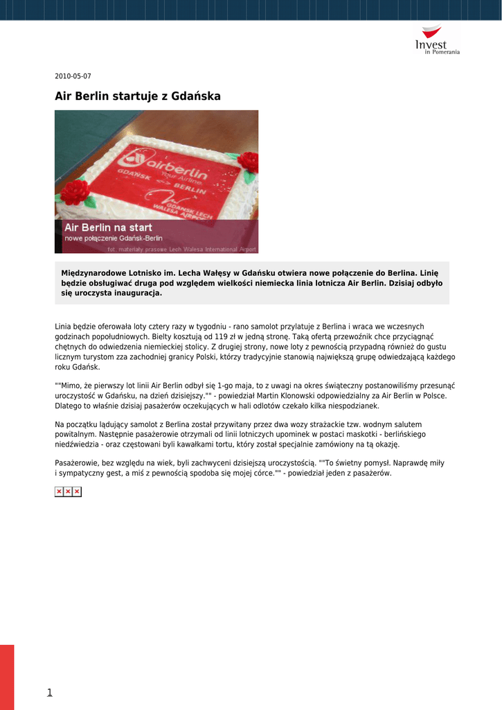 2010-05-07 Air Berlin startuje z Gdańska Międzynarodowe Lotnisko im. Lecha Wałęsy w Gdańsku otwiera nowe połączenie do Berlina. Linię będzie obsługiwać druga pod względem wielkości niemiecka linia lotnicza Air Berlin. Dzisiaj odbyło się uroczysta inauguracja. Linia będzie oferowała loty cztery razy w tygodniu - rano samolot przylatuje z Berlina i wraca we wczesnych godzinach popołudniowych. Bielty kosztują od 119 zł w jedną stronę. Taką ofertą przewoźnik chce przyciągnąć chętnych do odwiedzenia niemieckiej stolicy. Z drugiej strony, nowe loty z pewnością przypadną również do gustu licznym turystom zza zachodniej granicy Polski, którzy tradycyjnie stanowią największą grupę odwiedzającą każdego roku Gdańsk. ""Mimo, że pierwszy lot linii Air Berlin odbył się 1-go maja, to z uwagi na okres świąteczny postanowiliśmy przesunąć uroczystość w Gdańsku, na dzień dzisiejszy."" - powiedział Martin Klonowski odpowiedzialny za Air Berlin w Polsce. Dlatego to właśnie dzisiaj pasażerów oczekujących w hali odlotów czekało kilka niespodzianek. Na początku lądujący samolot z Berlina został przywitany przez dwa wozy strażackie tzw. wodnym salutem powitalnym. Następnie pasażerowie otrzymali od linii lotniczych upominek w postaci maskotki - berlińskiego niedźwiedzia - oraz częstowani byli kawałkami tortu, który został specjalnie zamówiony na tą okazję. Pasażerowie, bez względu na wiek, byli zachwyceni dzisiejszą uroczystością. ""To świetny pomysł. Naprawdę miły i sympatyczny gest, a miś z pewnością spodoba się mojej córce."" - powiedział jeden z pasażerów. 1