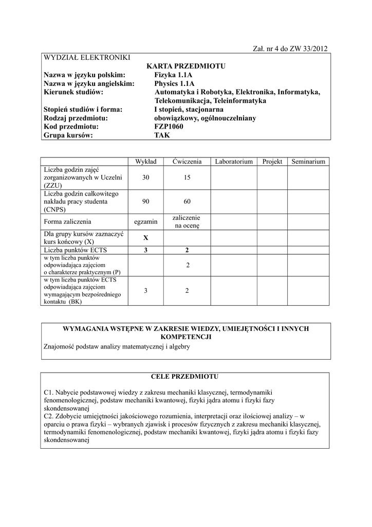 Zał. nr 4 do ZW 33/2012 WYDZIAŁ ELEKTRONIKI Nazwa w języku polskim: Nazwa w języku angielskim: Kierunek studiów: Stopień studiów i forma: Rodzaj przedmiotu: Kod przedmiotu: Grupa kursów: Liczba godzin zajęć zorganizowanych w Uczelni (ZZU) Liczba godzin całkowitego nakładu pracy studenta (CNPS) Forma zaliczenia Dla grupy kursów zaznaczyć kurs końcowy (X) Liczba punktów ECTS w tym liczba punktów odpowiadająca zajęciom o charakterze praktycznym (P) w tym liczba punktów ECTS odpowiadająca zajęciom wymagającym bezpośredniego kontaktu (BK) KARTA PRZEDMIOTU Fizyka 1.1A Physics 1.1A Automatyka i Robotyka, Elektronika, Informatyka, Telekomunikacja, Teleinformatyka I stopień, stacjonarna obowiązkowy, ogólnouczelniany FZP1060 TAK Wykład Ćwiczenia 30 15 90 60 egzamin zaliczenie na ocenę Laboratorium Projekt Seminarium X 3 2 2 3 2 WYMAGANIA WSTĘPNE W ZAKRESIE WIEDZY, UMIEJĘTNOŚCI I INNYCH KOMPETENCJI Znajomość podstaw analizy matematycznej i algebry CELE PRZEDMIOTU C1. Nabycie podstawowej wiedzy z zakresu mechaniki klasycznej, termodynamiki fenomenologicznej, podstaw mechaniki kwantowej, fizyki jądra atomu i fizyki fazy skondensowanej C2. Zdobycie umiejętności jakościowego rozumienia, interpretacji oraz ilościowej analizy – w oparciu o prawa fizyki – wybranych zjawisk i procesów fizycznych z zakresu mechaniki klasycznej, termodynamiki fenomenologicznej, podstaw mechaniki kwantowej, fizyki jądra atomu i fizyki fazy skondensowanej PRZEDMIOTOWE EFEKTY KSZTAŁCENIA Z zakresu wiedzy: PEK_W01 – Zna i potrafi objaśnić podstawowe prawa mechaniki punktu materialnego, układu punktów materialnych i bryły sztywnej, a także własności ruchu drgającego i zjawisk falowych. PEK_W02 – Zna i potrafi objaśnić podstawowe prawa termodynamiki fenomenologicznej PEK_W03 – Zna wybrane zagadnienia fizyki współczesnej z zakresu podstaw mechaniki kwantowej, fizyki jądra atomowego oraz fizyki ciała stałego Z zakresu umiejętności: PEK_U01 – Potrafi ilościowo i jakościowo opisywać zjawiska i procesy z zakresu praktyki inżynierskiej posługując się podstawowymi prawami mechaniki klasycznej, a w szczególności prawami dynamiki oraz zasadami zachowania PEK_U02 – Potrafi ilościowo i jakościowo analizować zagadnienia fizyczne o charakterze inżynierskim posługując się podstawowymi prawami oraz zasadami termodynamiki fenomenologicznej PEK_U03 – Potrafi jakościowo opisywać zjawiska i analizować zagadnienia współczesnej praktyki inżynierskiej w oparciu o prawa i zasady fizyki współczesnej TREŚCI PROGRAMOWE Forma zajęć – wykład Wy1 Wy2 Wy3 Wy4 Wy5 Wy6 Wy7 Wy8 Wy9 Wy10 Wy11 Wy12 Wy13 Wprowadzenie: zakres i metodologia fizyki; metoda naukowa; wielkości i jednostki fizyczne Kinematyka punktu materialnego Dynamika punktu materialnego. Równania ruchu dla prostych przypadków Praca i energia mechaniczna. Zasada zachowania energii mechanicznej Dynamika układu punktów materialnych. Zasada zachowania pędu Dynamika ruchu obrotowego; bryła sztywna. Zasada zachowania momentu pędu Ruch drgający. Oscylator harmoniczny Fale mechaniczne: opis ruchu falowego, energia fali, interferencja, fale stojące Zasady termodynamiki, energia wewnętrzna, zasada ekwipartycji energii Elementy teorii kinetyczno-molekularnej gazu doskonałego, rozkłady Maxwella i Boltzmanna Podstawy mechaniki kwantowej: stany układu, funkcja falowa, kwantowanie energii, tunelowanie Fizyka jądrowa: budowa atomu, siły jądrowe, promieniotwórczość, reakcje rozpadu i syntezy jądrowej Elementy fizyki fazy skondensowanej: struktura pasmowa ciał stałych, przewodnictwo cieplne izolatorów, własności elektryczne i optyczne ciał stałych Suma godzin TREŚCI PROGRAMOWE Forma zajęć – ćwiczenia Ćw1 Ćw2 Ćw3 Ćw4 Ćw5 Rozwiązywanie zadań: wielkości wektorowe, jednostki fizyczne oraz niepewności pomiarowe Rozwiązywanie zadań: Kinematyka punktu materialnego Rozwiązywanie zadań: Dynamika punktu materialnego Rozwiązywanie zadań: Praca i energia mechaniczna. Zasada zachowania energii mechanicznej Rozwiązywanie zadań: Dynamika układu punktów materialnych i zasada zacho- Liczba godzin 1 2 2 2 2 3 3 3 2 2 2 3 3 30 Liczba godzin 1 2 2 2 2 Ćw6 Ćw7 Ćw8 wania pędu Rozwiązywanie zadań: Dynamika ruchu obrotowego; bryła sztywna; zasada zachowania momentu pędu Rozwiązywanie zadań: Ruch drgający; oscylator harmoniczny Sprawdzian końcowy Suma godzin 2 2 2 15 STOSOWANE NARZĘDZIA DYDAKTYCZNE 1. Wykład – metoda tradycyjna z wykorzystaniem multimediów 2. Ćwiczenia rachunkowe – metoda tradycyjna, dyskusja nad rozwiązaniami zadań 3. Ćwiczenia rachunkowe – sprawdziany pisemne 4. Ćwiczenia rachunkowe – zadania domowe 5. Konsultacje 6. Praca własna – przygotowanie do ćwiczeń 7. Praca własna – wskazana lektura dodatkowa 8. Praca własna – przygotowanie do egzaminu OCENA OSIĄGNIĘCIA PRZEDMIOTOWYCH EFEKTÓW KSZTAŁCENIA Oceny (F – formująca (w trakcie semestru), P – podsumowująca (na koniec semestru) Numer efektu kształcenia Sposób oceny osiągnięcia efektu kształcenia F1 PEK_W01 PEK_U01 Odpowiedzi ustne, pisemne sprawdziany, zadania domowe sprawdzian końcowy z ćwiczeń PEK_W01-W03 Egzamin pisemny PEK_U01-U03 P = 0,4*F1 + 0,6*F2, jeśli F1,F2 pozytywne; P = 2,0 w przeciwnym razie. F2 LITERATURA PODSTAWOWA I UZUPEŁNIAJĄCA LITERATURA PODSTAWOWA: [1] D. Halliday, R. Resnick, J. Walker, Podstawy fizyki, tom 1,2,4,5, Wydawnictwo Naukowe PWN, Warszawa 2003 [2] Jay Orear, Fizyka, Wydawnictwo Naukowo-Techniczne, Warszawa, 2008. [3] I.W. Sawieliew, Wykłady z fizyki, tom 1-3, Wydawnictwo Naukowe PWN, Warszawa, 2003. [4] Listy zadań publikowane przez wykładowców LITERATURA UZUPEŁNIAJĄCA:. [1] H. D. Young, R. A. Freedman, University Physics, Pearson–Addison Wesley, 2014 [2] W. Korczak, M. Trajdos, Wektory, pochodne, całki, Wydawnictwo Naukowe PWN, Warszawa, 2013. OPIEKUN PRZEDMIOTU (IMIĘ, NAZWISKO, ADRES E-MAIL) prof. dr hab. inż. Paweł