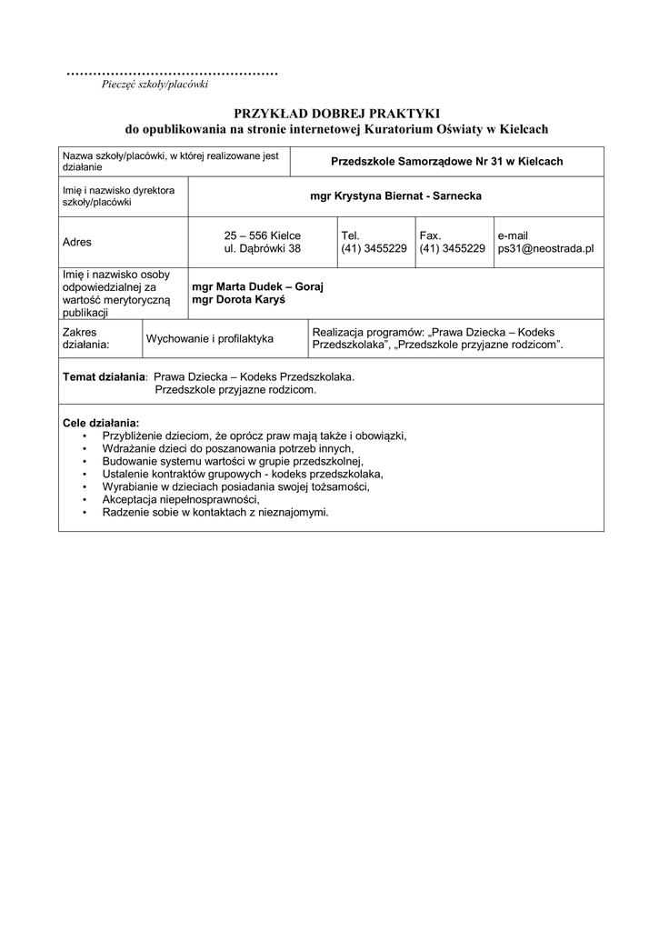 ………………………………………… Pieczęć szkoły/placówki PRZYKŁAD DOBREJ PRAKTYKI do opublikowania na stronie internetowej Kuratorium Oświaty w Kielcach Nazwa szkoły/placówki, w której realizowane jest działanie Imię i nazwisko dyrektora szkoły/placówki mgr Krystyna Biernat - Sarnecka 25 – 556 Kielce ul. Dąbrówki 38 Adres Imię i nazwisko osoby odpowiedzialnej za wartość merytoryczną publikacji Zakres działania: Przedszkole Samorządowe Nr 31 w Kielcach Tel. (41) 3455229 Fax. (41) 3455229 e-mail [email protected] mgr Marta Dudek – Goraj mgr Dorota Karyś Wychowanie i profilaktyka Realizacja programów: „Prawa Dziecka – Kodeks Przedszkolaka”, „Przedszkole przyjazne rodzicom”. Temat działania: Prawa Dziecka – Kodeks Przedszkolaka. Przedszkole przyjazne rodzicom. Cele działania: • Przybliżenie dzieciom, że oprócz praw mają także i obowiązki, • Wdrażanie dzieci do poszanowania potrzeb innych, • Budowanie systemu wartości w grupie przedszkolnej, • Ustalenie kontraktów grupowych - kodeks przedszkolaka, • Wyrabianie w dzieciach posiadania swojej tożsamości, • Akceptacja niepełnosprawności, • Radzenie sobie w kontaktach z nieznajomymi. Opis działania: Pracując z dziećmi bardzo często można zauważyć, że są ufne, spontaniczne, często nie znają swoich praw i obowiązków oraz czyhających zagrożeń. Refleksja ta skłoniła nas do napisania programu własnego „Prawa dziecka – kodeks przedszkolaka” i przybliżenia dzieciom niektórych pojęć z tej dziedziny poprzez wpisanie ich do kalendarza imprez przedszkolnych i umieszczenie zajęć z zakresu praw dziecka w planach pracy przedszkola. Istotnym elementem realizacji programu była współpraca z rodzicami, która mogłaby wspierać lub też utrudnić jego realizację. Na początku roku przedszkolnego dzieci poznają zasady panujące w grupie i pomagają nauczycielkom tworzyć kontrakty grupowe. Dzieci, które rozpoczęły edukację w przedszkolu biorą udział w pasowaniu na przedszkolaka. W uroczystości tej uczestniczą także rodzice. Ogłoszony zostaje konkurs pod hasłem: „Jestem przedszkolakiem na piątkę”, w którym biorą udział wszystkie dzieci. Konkurs trwa przez cały rok szkolny, a nagrodą dla zwycięzcy jest dyplom wręczony na koniec roku szkolnego. Wykorzystując ulubione bajki: „Czerwony Kapturek”, „Trzy świnki”, „Królowa śniegu” uczymy dzieci, że w ich otoczeniu istnieje wiele zagrożeń. Podsumowaniem i utrwaleniem tych działań są spotkania z policjantami na początku i pod koniec roku szkolnego, podczas których przekazywane są dzieciom informacje dotyczące właściwego reagowania na zaczepki nieznajomych osób oraz związane z bezpieczeństwem na drodze i w przypadku zaatakowania przez psa. Poprzez uczestnictwo w lekcjach muzealnych w Muzeum Narodowym dzieci dowiadują się o tożsamości narodowej. Poznają historię naszego kraju. Edukacja muzealna jest cennym uzupełnieniem zajęć dydaktycznych prowadzonych w przedszkolu. Przedszkolak dowiaduje się, że muzeum jest ośrodkiem, w którym zabezpiecza się dawny i współczesny dorobek kulturowy społeczeństwa oraz stanowi źródło wiedzy o przeszłości. Korzystając z utworu „Król Maciuś I” dzieci poznają swoje prawa i obowiązki. Wiedzą, że nie tylko mają prawo do zabawy, czy do opieki zdrowotnej, ale że oprócz praw mają także obowiązki. Dowiadują się, iż aby móc korzystać z praw należy respektować prawa innych, szanować ich potrzeby, akceptować inność. W czerwcu nastąpiło podsumowanie zajęć dotyczących tej tematyki. Ukoronowaniem tych działań był uroczysty Festyn Rodzinny z okazji Dnia Dziecka. Opis uzyskanych efektów Efekty realizacji przedsięwzięć: Dla dzieci: • dzieci znają swoje prawa, • znają zasady zgodnego współżycia w grupie przedszkolnej, • wiedzą, jak w kulturalny sposób rozwiązywać zaistniałe konflikty, • potrafią szanować potrzeby innych. Dla nauczycieli: • satysfakcja z pracy podczas omawiania tematyki, • pogłębienie wiedzy na temat praw dziecka, • współpraca ze środowiskiem lokalnym podczas realizacji zadań. Dla nauczycieli i rodziców: • lepsze poznanie przez nauczycieli i rodziców poszczególnych dzieci na tle życia rodzinnego oraz grupy przedszkolnej, • zdobycie wśród rodziców oddanych przyjaciół i sojuszników przedszkola w dziedzinie konkretnych poczynań wychowawczych i dydaktycznych, • wzajemne poznanie się i rozumienie nauczycieli i rodziców, a tym samym pogłębienie między nimi więzi emocjonalnych. Dla przedszkola: • podjęcie współpracy wszystkich nauczycielek podczas realizacji dobrej praktyki, • stworzenie programu własnego na potrzeby przedszkola podczas realizacji danego zagadnienia, • współpraca ze środowiskiem lokalnym, • promocja przedszkola w środowisku lokalnym, • wspólne rozwiązywanie problemów wychowawczych i dydaktycznych, • pedagogizacja rodziców, • aktywny udział rodziców w życiu placówki. Wnioski z realizacji: Konwencja Praw Dziecka uchwalona przez Zgromadzenie Ogólne Narodów Zjednoczonych w 1980 roku, a ratyfikowana przez Polskę w 1991 roku nakłada na nauczycieli, opiekunów i rodziców obowiązek kierowania się we wszystkich działaniach troską o dobro dzieci. To właśnie na nich ciąży odpowiedzialność za przyszłe losy swoich dzieci i wychowanków. Powinni oni już od najmłodszych lat uświadamiać dzieciom, jak ważne są ich prawa; zapoznawać je z takimi wartościami, jak: sprawiedliwość, tolerancja, poszanowanie godności, wolności innych. Zajęcia przeprowadzone w ramach projektu „Prawa Dziecka – Kodeks Przedszkolaka” wzbudziły u dzieci wiele pozytywnych emocji, dlatego nadal należy kontynuować działania związane z tą tematyką. Instytucje wspomagające realizację podjętych działań: Muzeum Narodowe w Kielcach; Wydział Ruchu Drogowego Miejskiej Komendy Poli