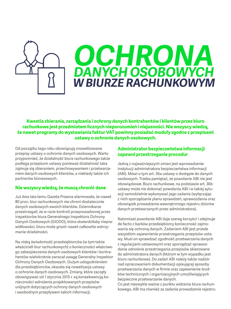 OCHRONA DANYCH OSOBOWYCH W BIURZE RACHUNKOWYM Kwestia zbierania, zarządzania i ochrony danych kontrahentów i klientów przez biuro rachunkowe jest przedmiotem licznych nieporozumień i niejasności. Nie wszyscy wiedzą, że nawet programy do wystawiania faktur VAT powinny posiadać moduły zgodne z przepisami ustawy o ochronie danych osobowych. Od początku tego roku obowiązują znowelizowane przepisy ustawy o ochronie danych osobowych. Warto przypomnieć, że działalność biura rachunkowego także podlega przepisom ustawy ponieważ działalność taka zajmuje się zbieraniem, przechowywaniem i przetwarzaniem danych osobowych klientów, a niekiedy także ich partnerów biznesowych. Nie wszyscy wiedzą, że muszą chronić dane Już dwa lata temu Gazeta Prawna alarmowała, że nawet 80 proc. biur rachunkowych nie chroni dostatecznie danych osobowych swoich klientów. Dziennikarze przestrzegali, że w razie kontroli przeprowadzonej przez inspektorów biura Generalnego Inspektora Ochrony Danych Osobowych (GIODO), która stwierdziłaby nieprawidłowości, biuru może grozić nawet całkowite wstrzymanie działalności. Na niską świadomość przedsiębiorców (w tym także właścicieli biur rachunkowych) o konieczności właściwego zabezpieczenia danych osobowych klientów i kontrahentów wielokrotnie zwracał uwagę Generalny Inspektor Ochrony Danych Osobowych. Dużym udogodnieniem dla przedsiębiorców, okazała się nowelizacja ustawy o ochronie danych osobowych. Zmiany, które zaczęły obowiązywać od 1 stycznia 2015 r. są konsekwencją konieczności wdrożenia projektowanych przepisów unijnych dotyczących ochrony danych osobowych i swobodnym przepływem takich informacji. Administrator bezpieczeństwa informacji zapewni przestrzeganie procedur Jedną z najważniejszych zmian jest wprowadzenie instytucji administratora bezpieczeństwa informacji (ABI). Mówi o tym art. 36a ustawy o dostępie do danych osobowych. Trzeba pamiętać, że powołanie ABI nie jest obowiązkowe. Biuro rachunkowe, na podstawie art. 36b ustawy może nie dokonać powołania ABI i w takiej sytuacji samodzielnie wykonywać jego zadania (wyłączając z nich sporządzanie planu sprawdzeń, sprawozdania oraz obowiązek prowadzenia wewnętrznego rejestru zbiorów danych przetwarzanych przez administratora). Natomiast powołanie ABI daje szereg korzyści i zdejmuje de facto z barków przedsiębiorcy konieczność zajmowania się ochroną danych. Zadaniem ABI jest przede wszystkim zapewnienie przestrzegania przepisów ustawy. Musi on sprawdzać zgodność przetwarzania danych z regulacjami ustawowymi oraz sporządzać sprawozdanie odnośnie przestrzegania przepisów skierowane do administratora danych (którym w tym wypadku jest biuro rachunkowe). Do zadań ABI należy także nadzór nad opracowaniem dokumentacji opisującej sposoby przetwarzania danych w firmie oraz zapewnienie środków technicznych i organizacyjnych umożliwiających bezpieczne przetwarzanie danych. Co jest niezwykle ważne z punktu widzenia biura rachunkowego, ABI ma również za zadanie prowadzenie rejestru zbiorów danych przetwarzanych przez biuro (zgodnie z art. 36a ust 2 pkt 2 ustawy). Jak wspomniano, duża grupa biur rachunkowych nie zgłasza posiadanych zbiorów danych do GIODO. Wbrew obiegowym opiniom, nie grożą za to kary finansowe ze strony administracji państwowej. Nie oznacza to jednak, że problemu nie ma. Niedopełnienie tego obowiązku jest bowiem zagrożone sankcją karną (może to być np. grzywna), o której w razie procesu decyduje sąd. GIODO z kolei może wymierzyć karę grzywny w sytuacji, gdy w wyniku kontroli wyda decyzję zalecającą wprowadzenie określonych procedur lub rozwiązań zgodnych z przepisami, a biuro rachunkowe się do niej nie zastosuje. Programy finansowo-księgowe powinny spełniać wymogi ustawowe Po nowelizacji nie zmieniły się obowiązki przewidziane dla administratora danych. Jeżeli zatem biuro rachunkowe zbiera i przetwarza dane (np. klientów), to według ustawy jest administratorem tychże danych. Wówczas jednostka gospodarcza jaką jest biuro odpowiada za zgodną z prawem organizację procesu przetwarzania takich danych. Poznaj możliwości jakie daje Ci Strefa dla Księgowych Prowadząc biuro rachunkowe trzeba pamiętać, że także programy do wystawiania faktur muszą spełniać wymogi ustawy o ochronie danych osobowych (a w szczególności przepisów aktów wykonawczych do ustawy). Faktura VAT musi zawierać elementy identyfikujące strony transakcji; najczęściej znajdziemy na niej dane takie jak: imię, nazwisko i nazwa firmy. Ważne więc by używany program obsługujący wystawianie faktur był zabezpieczony przed nieautoryzowanym dostępem na poziomie aplikacji (po stronie klienta) oraz na poziomie serwera (bazy danych). Takie zabezpieczenia posiadają m.in. programy finansowo-księgowe dostarczane przez Sage. Kwestie związane z zapewnieniem odpowiedniej ochrony danych osobowych klientów, kontrahentów oraz zapewnienie bezpieczeństwa danych przy wystawianiu i przesyłaniu faktur VAT, są niezwykle istotne z punktu widzenia działalności biura rachunkowego. Zapewnienie właściwych procedur oraz posiadanie odpowiedniego oprogramowania finansowo-księgowego zapewnia bezpieczeństwo prawne, niezbędne nie tylko w czasie kontroli. sage.com.pl/strefa-dla-ksiegowych