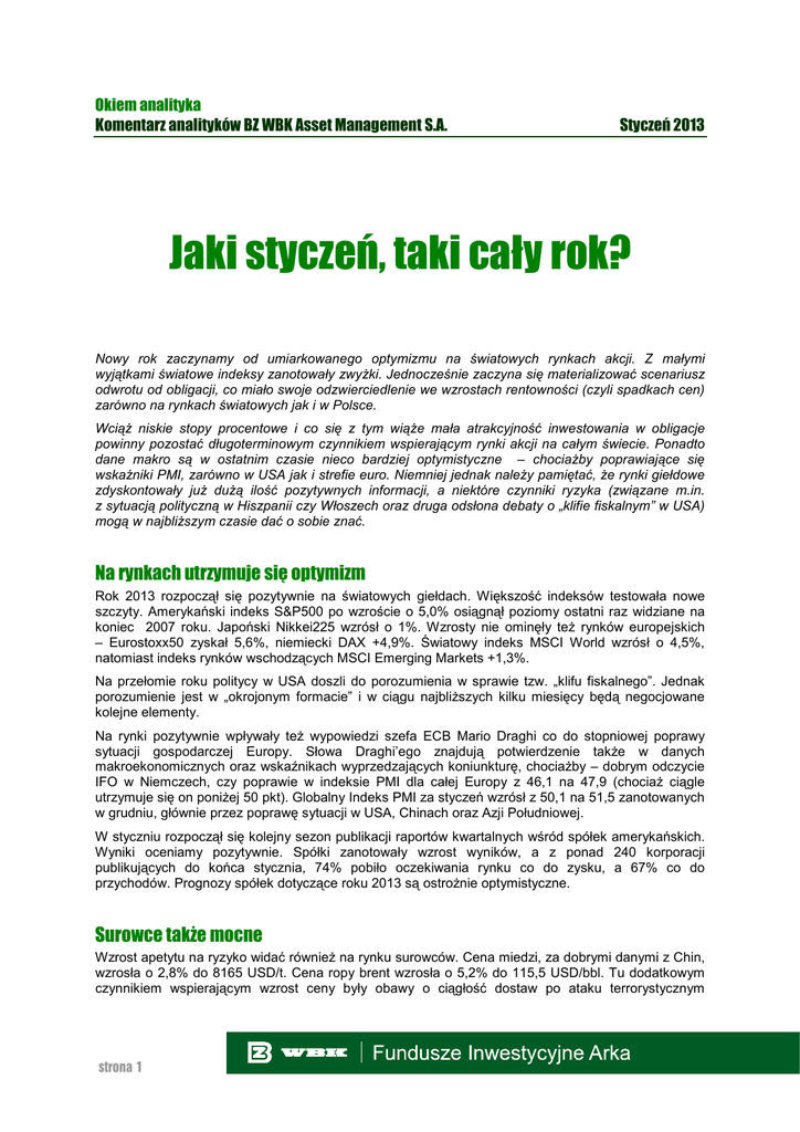 Okiem analityka Komentarz analityków BZ WBK Asset Management S.A. Styczeń 2013 Jaki styczeń, taki cały rok? Nowy rok zaczynamy od umiarkowanego optymizmu na światowych rynkach akcji. Z małymi wyjątkami światowe indeksy zanotowały zwyŜki. Jednocześnie zaczyna się materializować scenariusz odwrotu od obligacji, co miało swoje odzwierciedlenie we wzrostach rentowności (czyli spadkach cen) zarówno na rynkach światowych jak i w Polsce. WciąŜ niskie stopy procentowe i co się z tym wiąŜe mała atrakcyjność inwestowania w obligacje powinny pozostać długoterminowym czynnikiem wspierającym rynki akcji na całym świecie. Ponadto dane makro są w ostatnim czasie nieco bardziej optymistyczne – chociaŜby poprawiające się wskaźniki PMI, zarówno w USA jak i strefie euro. Niemniej jednak naleŜy pamiętać, Ŝe rynki giełdowe zdyskontowały juŜ duŜą ilość pozytywnych informacji, a niektóre czynniki ryzyka (związane m.in. z sytuacją polityczną w Hiszpanii czy Włoszech oraz druga odsłona debaty o „klifie fiskalnym” w USA) mogą w najbliŜszym czasie dać o sobie znać. Na rynkach utrzymuje się optymizm Rok 2013 rozpoczął się pozytywnie na światowych giełdach. Większość indeksów testowała nowe szczyty. Amerykański indeks S&P500 po wzroście o 5,0% osiągnął poziomy ostatni raz widziane na koniec 2007 roku. Japoński Nikkei225 wzrósł o 1%. Wzrosty nie ominęły teŜ rynków europejskich – Eurostoxx50 zyskał 5,6%, niemiecki DAX +4,9%. Światowy indeks MSCI World wzrósł o 4,5%, natomiast indeks rynków wschodzących MSCI Emerging Markets +1,3%. Na przełomie roku politycy w USA doszli do porozumienia w sprawie tzw. „klifu fiskalnego”. Jednak porozumienie jest w „okrojonym formacie” i w ciągu najbliŜszych kilku miesięcy będą negocjowane kolejne elementy. Na rynki pozytywnie wpływały teŜ wypowiedzi szefa ECB Mario Draghi co do stopniowej poprawy sytuacji gospodarczej Europy. Słowa Draghi’ego znajdują potwierdzenie takŜe w danych makroekonomicznych oraz wskaźnikach wyprzedzających koniunkturę, chociaŜby – dobrym odczycie IFO w Niemczech, czy poprawie w indeksie PMI dla całej Europy z 46,1 na 47,9 (chociaŜ ciągle utrzymuje się on poniŜej 50 pkt). Globalny Indeks PMI za styczeń wzrósł z 50,1 na 51,5 zanotowanych w grudniu, głównie przez poprawę sytuacji w USA, Chinach oraz Azji Południowej. W styczniu rozpoczął się kolejny sezon publikacji raportów kwartalnych wśród spółek amerykańskich. Wyniki oceniamy pozytywnie. Spółki zanotowały wzrost wyników, a z ponad 240 korporacji publikujących do końca stycznia, 74% pobiło oczekiwania rynku co do zysku, a 67% co do przychodów. Prognozy spółek dotyczące roku 2013 są ostroŜnie optymistyczne. Surowce takŜe mocne Wzrost apetytu na ryzyko widać równieŜ na rynku surowców. Cena miedzi, za dobrymi danymi z Chin, wzrosła o 2,8% do 8165 USD/t. Cena ropy brent wzrosła o 5,2% do 115,5 USD/bbl. Tu dodatkowym czynnikiem wspierającym wzrost ceny były obawy o ciągłość dostaw po ataku terrorystycznym strona 1 Okiem Analityka Komentarz analityków BZ WBK Asset Management S.A. na kompleks gazowy In Amenas w Algierii. Kraj ten jest istotnym eksporterem surowców energetycznych i kolejnym krajem Afryki Północnej, w którym wzrasta ryzyko geopolityczne. Węgry błyszczą w regionie Początek roku był udany dla inwestujących w regionie. Poza Czechami wszystkie rynki zakończyły miesiąc na plusie. Zdecydowanie najlepiej zachowywał się indeks węgierski (BUX), który zyskał 6,6%. Austria (ATX) wzrosła o 1,9%, symboliczny wzrost o 0,7% odnotowała Turcja (ISE100). Indeks czeski (PX) stracił na wartości -1,7%. Bardzo dobrze rok rozpoczęła takŜe giełda w Moskwie – tamtejszy indeks MICEX zyskał 4,9%. Styczeń okazał się dla węgierskiej giełdy praktycznie tak dobry jak cały 2012 rok. Liderem wzrostów okazał się bank OTP, który wzrósł o 12%. Jednak sytuacja makroekonomiczna kraju nadal wygląda słabo. Nie doszło takŜe do porozumienia z MFW w sprawie przyznania Węgrom Liczby stycznia dostępu do elastycznej linii Dynamika lub wartość Kraj / Dane za kredytowej. Premier Orban Dane region okres: ogłosił plan emisji obligacji aktualna poprzednia denominowanych w walutach Indeks PMI produkcji Chiny Styczeń 50,4 50,6 obcych. Wskaźnik ISM produkcji USA Styczeń 53,1 50,2 Giełda turecka charakteryzoIndeks zaufania wała się bardzo duŜą konsumentów* USA Styczeń 58,6 66,7 zmiennością. Do połowy miesiąca, dzięki oczekiwaIndeks PMI produkcji Niemcy Styczeń 49,8 46,0 niom na otrzymanie ratingu SprzedaŜ detaliczna Polska Grudzień -2,5% 2,4% inwestycyjnego tym razem od agencji ratingowej Moody’s, Produkcja przemysłowa Polska Grudzień -10,6% -0,8% rynek turecki był kolejny raz * Indeks zaufania konsumentów (The Conference Board Consumer Confidence Index) – najlepiej zachowującym się wskaźnik obliczany na podstawie comiesięcznej ankiety wśród gospodarstw domowych; rynkiem w regionie. obejmuje ocenę bieŜącej kondycji gospodarstwa domowego oraz oczekiwań co do jej Ostatecznie jednak agencja zmiany za 6 miesięcy (rok 1985 = 100). nie zmieniła swojej decyzji i cześć inwestorów mogła być rozczarowana. Ocena Moody’s cały czas pozostaje o jeden poziom poniŜej ratingu inwestycyjnego, z nastawieniem pozytywnym. Za spadek w Czechach odpowiada spadek wartości akcji CEZ, który stracił na wartości blisko 10%. To przede wszystkim pokłosie dalszego spadku cen energii w Niemczech oraz cen certyfikatów CO2. To powoduje, Ŝe wyniki finansowe czeskiego giganta będą w najbliŜszym czasie pod presją. W Rosji hitem stycznia okazały się akcje Sberbanku, który wzrósł aŜ o 18%. Ten wzrost moŜna częściowo powiązać ze spadkami wycen banków tureckich – część inwestorów po bardzo dobrym ubiegłym roku postanowiła zrealizować zyski w Turcji i przenieść kapitał do Rosji. Polska – kraj z duŜ