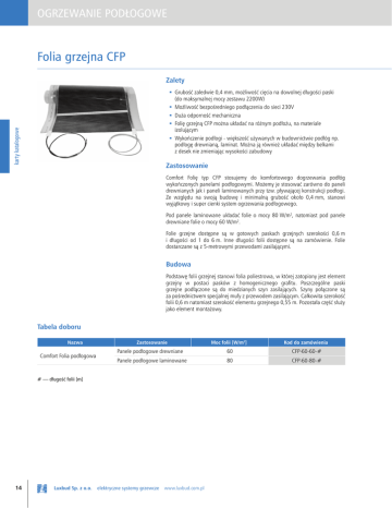 OGRZEWANIE PODŁOGOWE Folia grzejna CFP Zalety Grubość zaledwie 0,4 mm, możliwość cięcia na dowolnej długości paski (do maksymalnej mocy zestawu 2200W) Możliwość bezpośredniego podłączenia do sieci 230V Duża odporność mechaniczna karty katalogowe Folię grzejną CFP można układać na różnym podłożu, na materiale izolującym Wykończenie podłogi - większość używanych w budownictwie podłóg np. podłogę drewnianą, laminat. Można ją również układać między belkami z desek nie zmieniając wysokości zabudowy Zastosowanie Comfort Folię typ CFP stosujemy do komfortowego dogrzewania podłóg wykończonych panelami podłogowymi. Możemy je stosować zarówno do paneli drewnianych jak i paneli laminowanych przy tzw. pływającej konstrukcji podłogi. Ze względu na swoją budowę i minimalną grubość około 0,4 mm, stanowi wyjątkowy i super cienki system ogrzewania podłogowego. Pod panele laminowane układać folie o mocy 80 W/m2, natomiast pod panele drewniane folie o mocy 60 W/m2. Folie grzejne dostępne są w gotowych paskach grzejnych szerokości 0,6 m i długości od 1 do 6 m. Inne długości folii dostępne są na zamówienie. Folie dostarczane są z 5-metrowymi przewodami zasilającymi. Budowa Podstawę folii grzejnej stanowi folia poliestrowa, w której zatopiony jest element grzejny w postaci pasków z homogenicznego grafitu. Poszczególne paski grzejne podłączone są do miedzianych szyn zasilających. Szyny połączone są za pośrednictwem specjalnej mufy z przewodem zasilającym. Całkowita szerokość folii 0,6 m natomiast szerokość elementu grzejnego 0,55 m. Pozostała część służy jako element montażowy. Tabela doboru Nazwa Comfort Folia podłogowa Moc folii [W/m2] Kod do zamówienia Panele podłogowe drewniane 60 CFP-60-60-# Panele podłogowe laminowane 80 CFP-60-80-# Zastosowanie # — długość folii [m] 14 Luxbud Sp. z o.o. elektryczne systemy grzewcze www.luxbud.com.pl OGRZEWANIE PODŁOGOWE Dane techniczne Ogrzewanie podłogowe Panele drewniane Panele laminowane Jednostkowa moc grzejna 60 W/m Napięcie znamionowe 230V AC Max. moc 1 paska folii 80 W/m2 karty katalogowe 2 2200W Max. długość 1 paska folii 35 m Max. wytrzymałość temperaturowa 26 m 80°C Długość przewodu zasilającego 2x5m Grubość foli grzejnej 0,4 mm Standardowe folie grzejne Comfort folie grzewcze do stosowania pod panele drewniane Comfort folie grzewcze do stosowania pod panele laminowane Symbol Szerokość całkowita [m] Długość [m] Moc [W] CFP-60-60-1 0,6 1 33 CFP-60-60-2 0,6 2 66 CFP-60-60-3 0,6 3 99 CFP-60-60-4 0,6 4 132 CFP-60-60-5 0,6 5 165 CFP-60-60-6 0,6 6 198 CFP-60-60-8 0,6 8 264 CFP-60-60-10 0,6 10 330 Szerokość całkowita [m] Długość [m] Moc [W] CFP-60-80-1 0,6 1 44 CFP-60-80-2 0,6 2 88 CFP-60-80-3 0,6 3 132 CFP-60-80-4 0,6 4 176 CFP-60-80-5 0,6 5 220 CFP-60-80-6 0,6 6 264 CFP-60-80-8 0,6 8 352 CFP-60-80-10 0,6 10 440 Szerokość całkowita [m] Długość [m] Moc [W] CFP-100-80-1 1 1 84 CFP-100-80-2 1 2 156 CFP-100-80-3 1 3 234 CFP-100-80-4 1 4 312 CFP-100-80-5 1 5 390 CFP-100-80-6 1 6 468 CFP-100-80-8 1 8 624 CFP-100-80-10 1 10 780 Symbol Symbol Długości mat niewymienione w tabelach dostępne są na zamówienie. www.luxbud.com.pl elektryczne systemy grzewcze Luxbud Sp. z o.o. 15