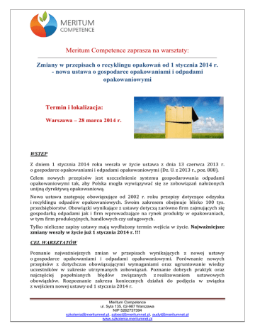 Meritum Competence zaprasza na warsztaty: Zmiany w przepisach o recyklingu opakowań od 1 stycznia 2014 r. - nowa ustawa o gospodarce opakowaniami i odpadami opakowaniowymi Termin i lokalizacja: Warszawa – 28 marca 2014 r. WSTĘP Z dniem 1 stycznia 2014 roku weszła w życie ustawa z dnia 13 czerwca 2013 r. o gospodarce opakowaniami i odpadami opakowaniowymi (Dz. U. z 2013 r., poz. 888). Celem nowych przepisów jest uszczelnienie systemu gospodarowania odpadami opakowaniowymi tak, aby Polska mogła wywiązywać się ze zobowiązań nałożonych unijną dyrektywą opakowaniową. Nowa ustawa zastępuję obowiązujące od 2002 r. roku przepisy dotyczące odzysku i recyklingu odpadów opakowaniowych. Swoim zakresem obejmuje blisko 100 tys. przedsiębiorstw. Obowiązki wynikające z ustawy dotyczą zarówno firm zajmujących się gospodarką odpadami jak i firm wprowadzające na rynek produkty w opakowaniach, w tym firm produkcyjnych, handlowych czy usługowych. Tylko nieliczne zapisy ustawy mają wydłużony termin wejścia w życie. Najważniejsze zmiany weszły w życie już 1 stycznia 2014 r. !!! CEL WARSZTATÓW Poznanie najważniejszych zmian w przepisach wynikających z nowej ustawy o gospodarce opakowaniami i odpadami opakowaniowymi. Porównanie nowych przepisów z dotychczas obowiązującymi wymaganiami oraz ugruntowanie wiedzy uczestników w zakresie utrzymanych zobowiązań. Poznanie dobrych praktyk oraz najczęściej popełnianych błędów związanych z realizowaniem ustawowych obowiązków. Rozpoznanie zakresu koniecznych działań do podjęcia w związku z wejściem nowej ustawy od 1 stycznia 2014 r. Meritum Competence ul. Syta 135, 02-987 Warszawa NIP 5262737394 [email protected], [email protected], [email protected] www.szkolenia.meritumnet.pl PROGRAM WARSZTATÓW Warsztaty prowadzi doświadczony ekspert, który przedyskutuje z uczestnikami m.in. następujące zagadnienia: 1. zwolnienie z obowiązku odzysku i recyklingu dla firm wprowadzających poniżej 1 tony opakowań, 2. brak możliwości rozliczenia opakowań wielomateriałowych przez organizację odzysku, 3. nowe obowiązki w zakresie opakowań środków niebezpiecznych, 4. nowy obowiązek prowadzenia kampanii edukacyjnych przez wprowadzających produkty w opakowaniach – za naruszenie obowiązku - kary nawet do 500 tys.!!!, 5. nowe wymagania dla organizacji odzysku, 6. ważne zmiany dotyczące sklepów, 7. audyty prowadzone przez weryfikatorów EMAS dla firm zajmujących się recyklingiem opakowań, 8. wypełnianie dokumentów: DPO, DPR, EDPO, EDPR, 9. zmiany w zakresie ewidencji i sprawozdawczości, 10. NOWY REJESTR dotyczący gospodarki odpadami, 11. wysokie kary administracyjne nawet do 500 tys. lub do 1 mln zł. Podział na części merytoryczne i przerwy 9:30 - 10.00 10:00 10:00 - 11:30 11:30 - 11:45 11:45 – 13:00 13:00 – 13:45 13:45 - 15:00 15:00 – 15:15 15:15 – 16:00 Rejestracja uczestników Rozpoczęcie warsztatów Gospodarka opakowaniami i odpadami opakowaniowym - część 1 - stan dotychczasowy wraz z uwzględnieniem zmian wprowadzonych nową ustawą Przerwa kawowa Gospodarka opakowaniami i odpadami opakowaniowym - część 2 - stan dotychczasowy wraz z uwzględnieniem zmian wprowadzonych nową ustawą Przerwa obiadowa Gospodarka opakowaniami i odpadami opakowaniowym - część 3 - stan dotychczasowy wraz z uwzględnieniem zmian wprowadzonych nową ustawą Przerwa kawowa Gospodarka opakowaniami i odpadami opakowaniowym - część 4 – wdrażanie nowej ustawy w latach 2014-2016 – przepisy przejściowe, nowe rozporządzenia itd. Na zakończenie pytania oraz dyskusja. Korzyści dla uczestników Informacje otrzymane w trakcie szkolenia pomogą: - przygotować się do zmian w przepisach, - zweryfikować dotychczas ponoszone koszty związane z realizacją obowiązku odzysku i recyklingu opakowań, - zminimalizować ryzyko kar za naruszenie prawa w tym zakresie. Adresaci szkolenia Szkolenie adresowane jest do właścicieli firm, osób prowadzących działalność gospodarczą, jak i osób odpowiedzialnych za ochronę środowiska, gospodarkę magazynową, zaopatrzenie, gospodarkę opakowaniową, logistykę, zarządzania oraz planowanie i rozwój. Metody szkoleniowe Wiedza przekazywana na szkoleniu jest poparta przykładami z firm. Omawiane są przykłady z poszczególnych branż. Zapewniony jest czas na pytania oraz dyskusję. WYKŁADOWCA: Maciej KRZYCZKOWSKI Ekspert ds. gospodarki środowiskowego odpadami oraz zarządzania Doświadczony trener i audytor. W swojej pracy zawodowej prowadził audyty zarówno w firmach wytwarzających odpady, jak i firmach zajmujących się zbieraniem odpadów oraz prowadzących ich odzysk i recykling. Posiada szeroką wiedzę z zakresu ochrony środowiska oraz praktyczne doświadczenie we wdrażaniu oraz audytowaniu systemu ekozarządzania i audytu (EMAS). Poza prowadzeniem szkoleń zajmuje się doradztwem dotyczącym ochrony środowiska oraz społecznej odpowiedzialności biznesu. Obecnie pracuje w Generalnej Dyrekcji Ochrony Środowiska na stanowisku Głównego specjalisty ds. ekozarządzania. LOKALIZACJA i TERMIN: zajęcia odbywają się w Warszawie w dn. 28 marca 2014 r. w godzinach: 10.00 - 16.00 (szczegółowe informacje o miejscu szkolenia otrzymają Państwo na kilka dni przed szkoleniem). KOSZT: 600 PLN netto (+ 23% VAT) za osobę; 10% rabatu w przypadku zgłoszenia 2 i więcej osób z tej samej firmy/instytucji (dla każdej zgłoszonej osoby) Dla instytucji zaświadczających, że szkolenie finansowane jest ze środków publicznych (w całości bądź minimum w 70%) zastosujemy stawkę VAT - "zwolniony". W KOSZT SZKOLENIA WCHODZĄ: Wykłady, Materiały szkoleniowe, Zaświadczenia uczestnictwa, Obiad, Serwis kawowy. Formularz zgłoszeniowy jest również dostępny na stronie internetowej pod adresem: www.szkolenia.meritumnet.pl w menu po lewej stronie, w zakładce: Szkolenia. Formularze zgłoszeniowe prosimy przesyłać e-mailem na adres: [email protected] lub faxe